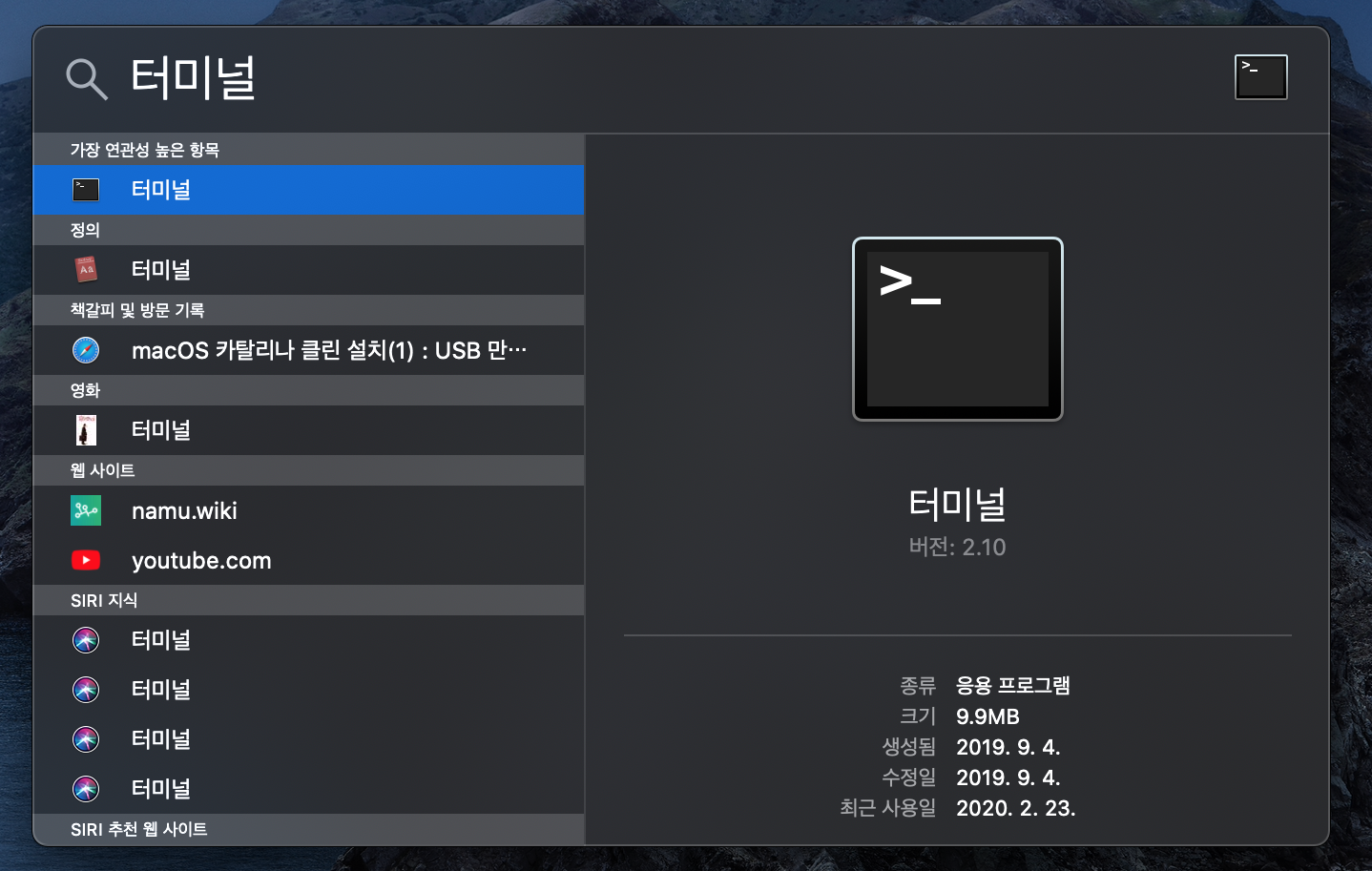 이제 터미널을 실행한다. spotlight ( Command + Space )에서 "터미널" 이라고 검색하면 하단에 검색결과로 터미널이 나타나고 이것을 더블 클릭하여 실행하면 된다.