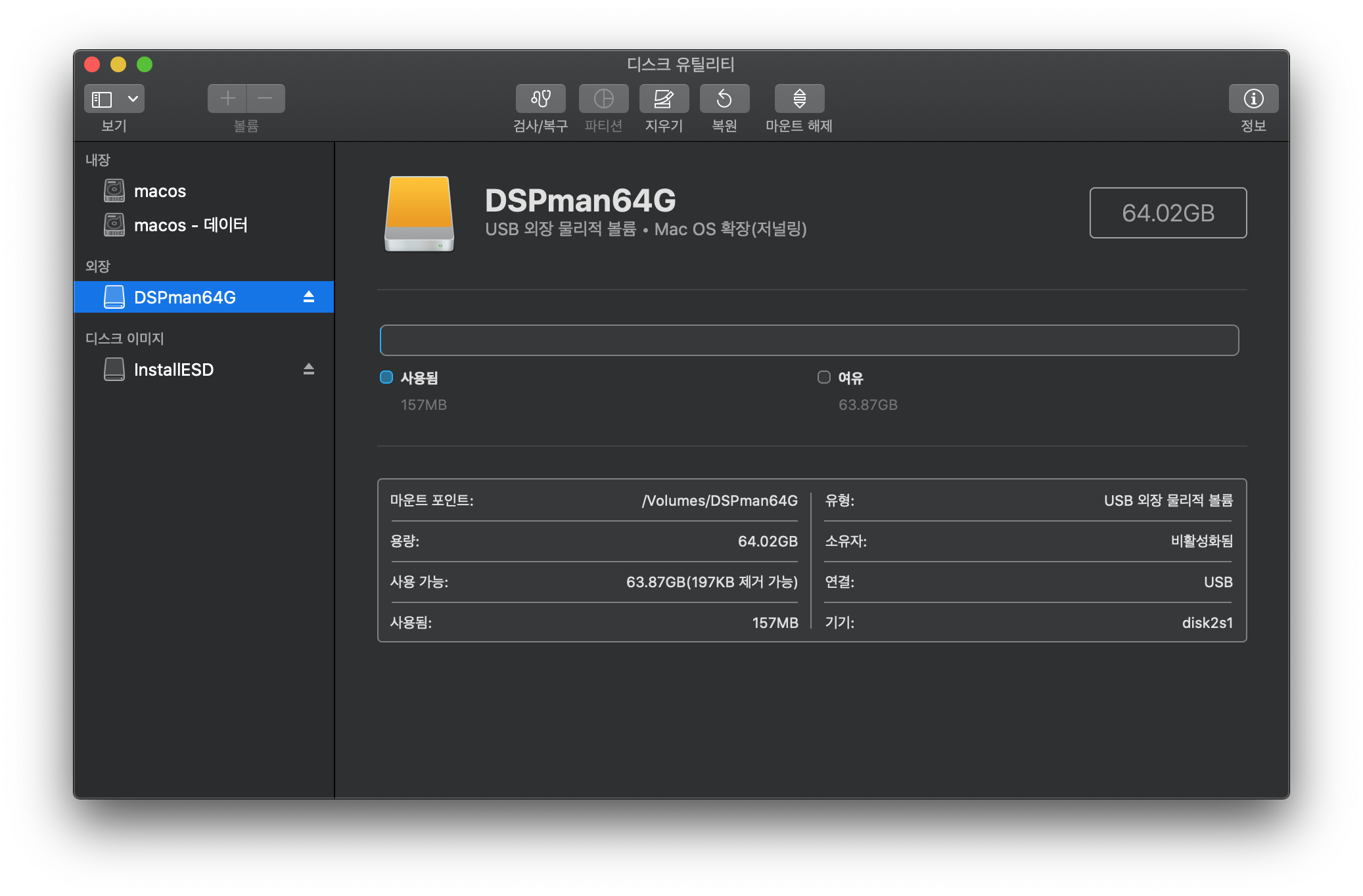 디스크 이름은 DSPman64G이며, 이 이름은 다음 단계에서 필요하다.