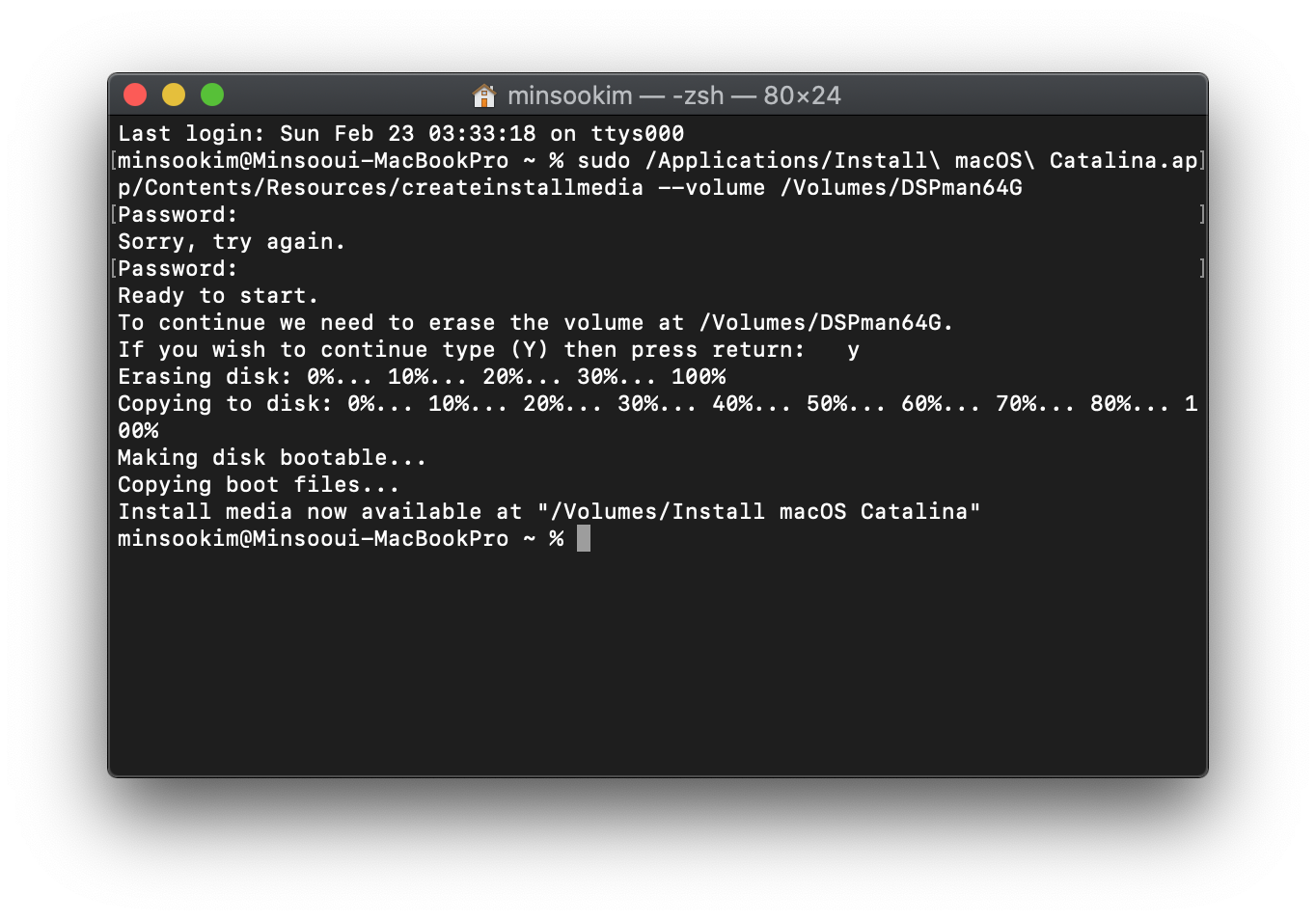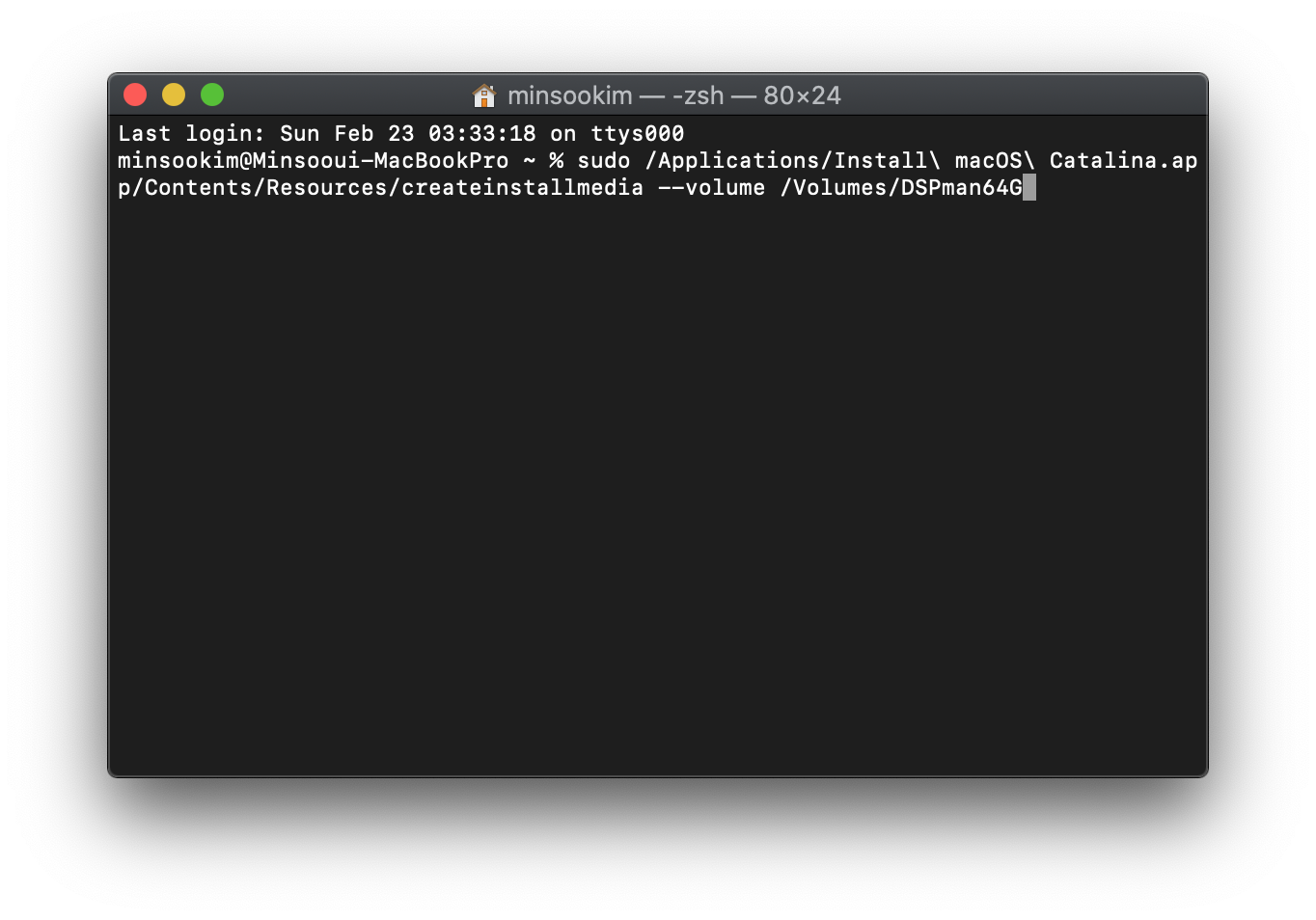 sudo /Applications/Install\ macOS\ Catalina.app/Contents/Resources/createinstallmedia --volume /Volumes/DSPman64G