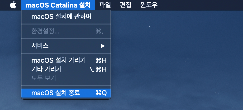 다음과 같이 화면 상단 메뉴에서 [macOS 설치 종료]를 클릭한다.