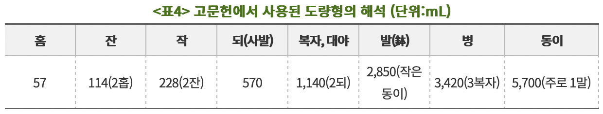 홉, 되, 말, 잔, 작, 사발, 복자, 재야, 발, 병, 동이 등의 고문헌에 사용된 도량형의 해석방법에 대한 내용은 국립농업과학원에서 제공하고 있다.