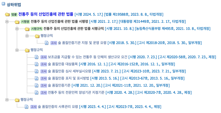 전통주산업법 법령체계도: https://law.go.kr/LSW//lsStmdInfoP.do?lsiSeq=253397&ancYnChk=0