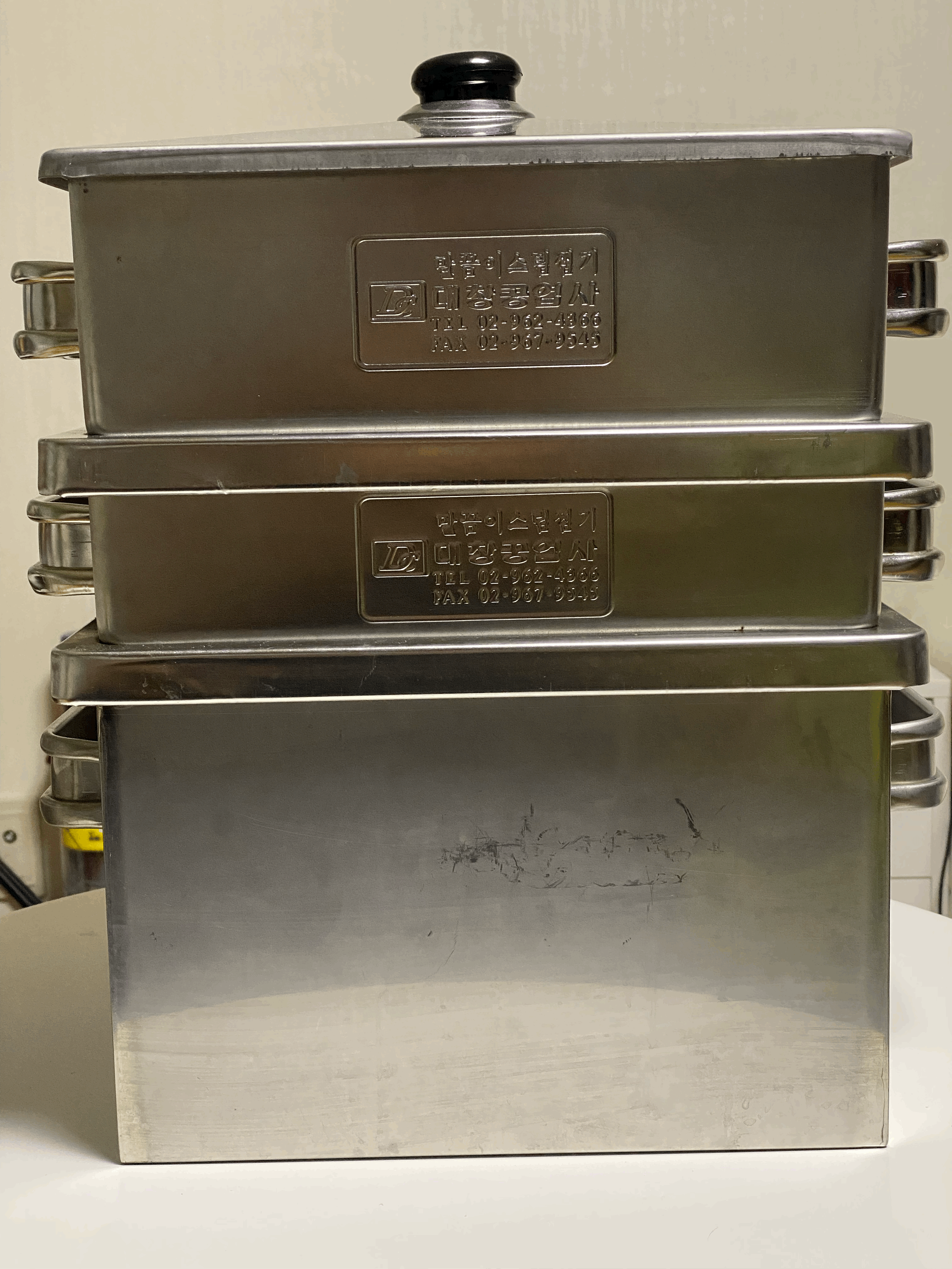 올해 5/18에 구매했던 스텐 찜기를 식깡 속에 먼저 놓고 그 위에 이 타공채반을 올리고 그 위에 2차 거름망을 펼쳐두고 그 위에 아래의 타공채반을 올리고 그 위에서 1차 거름망으로 술을 거를 예정.