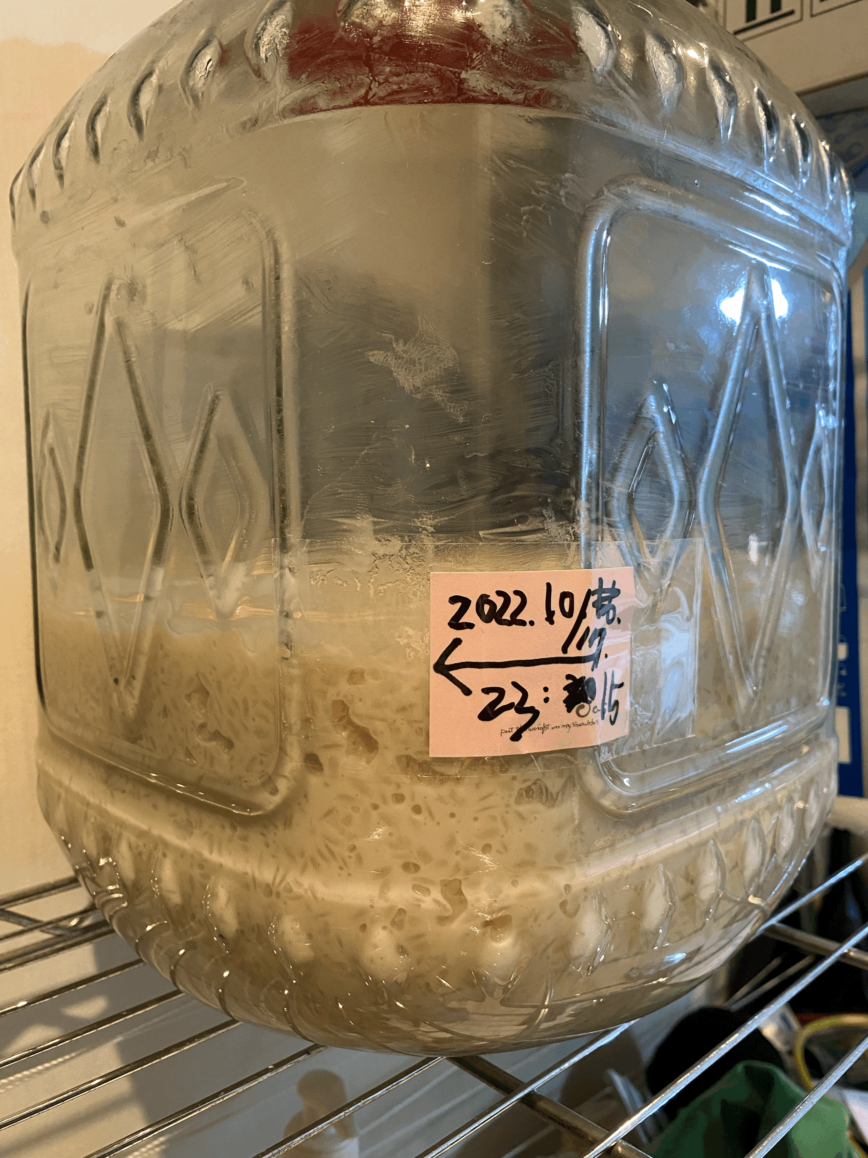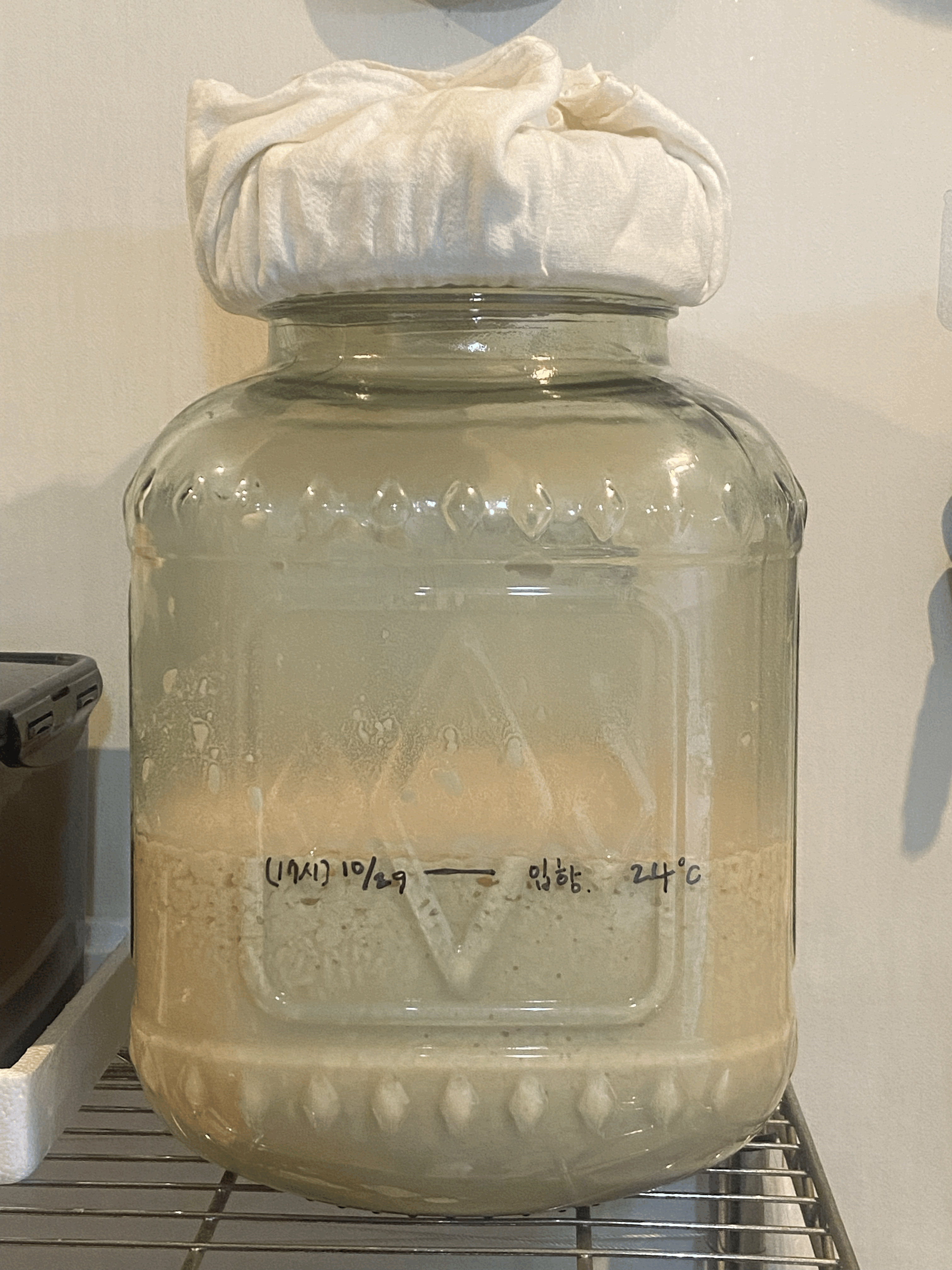 - [10/15.토] 밑술(범벅) = 멥쌀(500g, 건식) + 물(1.25L, 스파클 생수) + 누룩(200g, 송학곡자/우리밀)