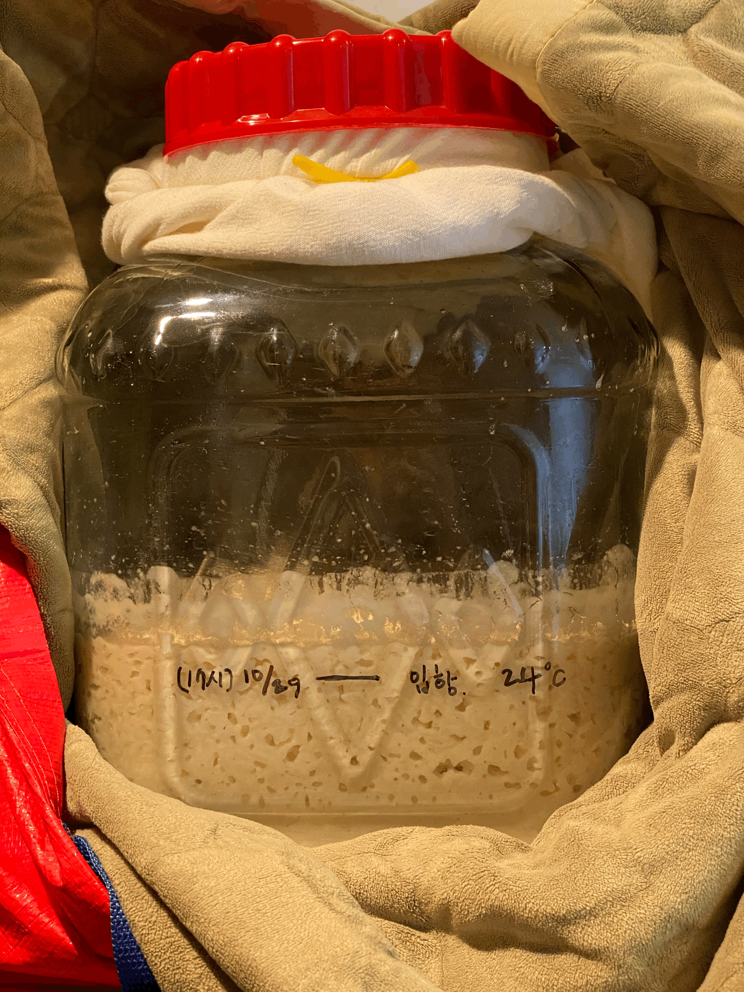 - 5L 짜리 병에 넣어 면보를 씌워두고 뚜껑은 닫지 않았는데, 설겆이 하고 내일 고두밥 준비하려고 찹쌀 백세 후 담궈놓고 정리 다 하고 뒤돌아서 보니 5L짜리 병에씌워둔 면보까지 닿았음.