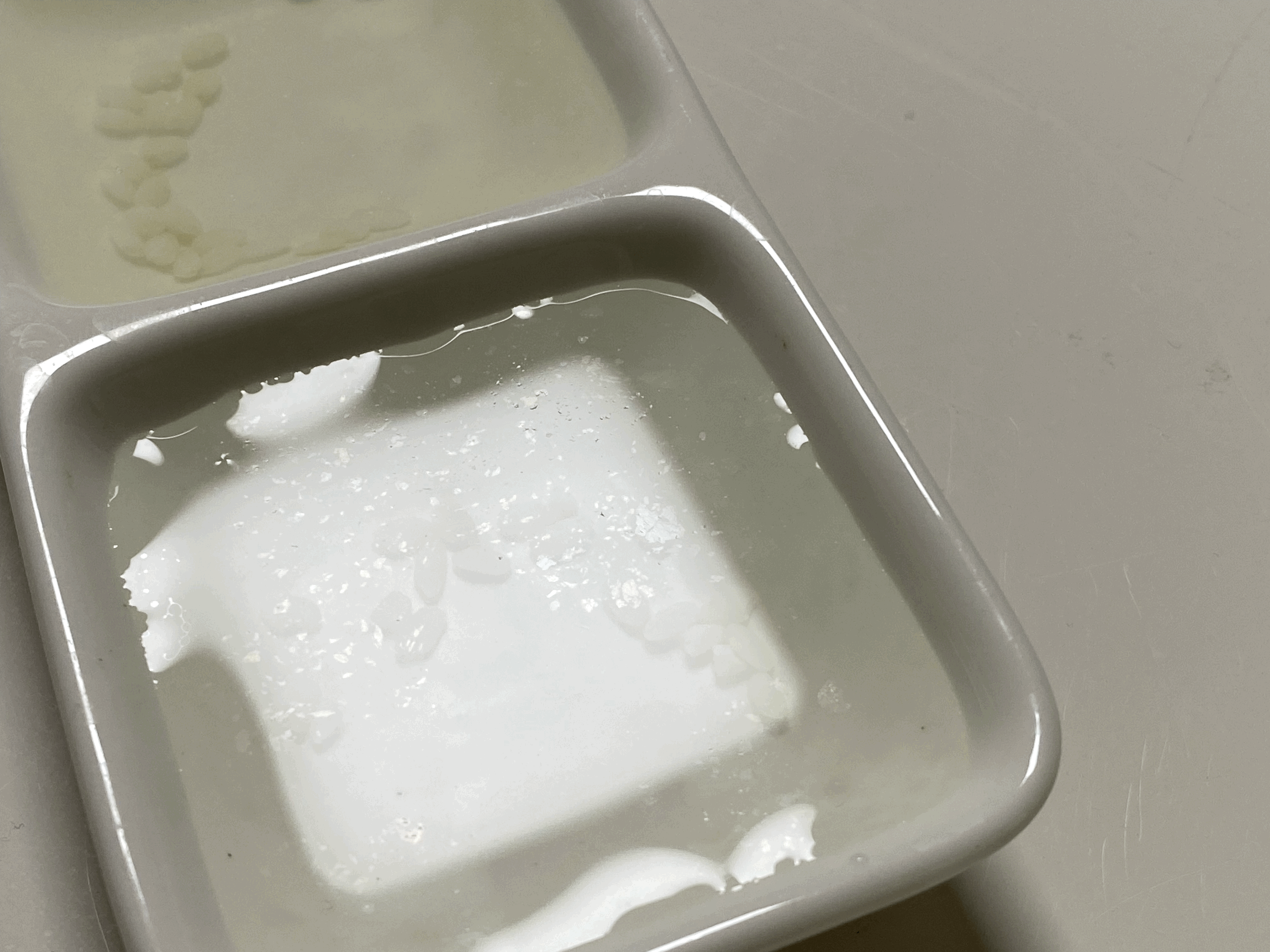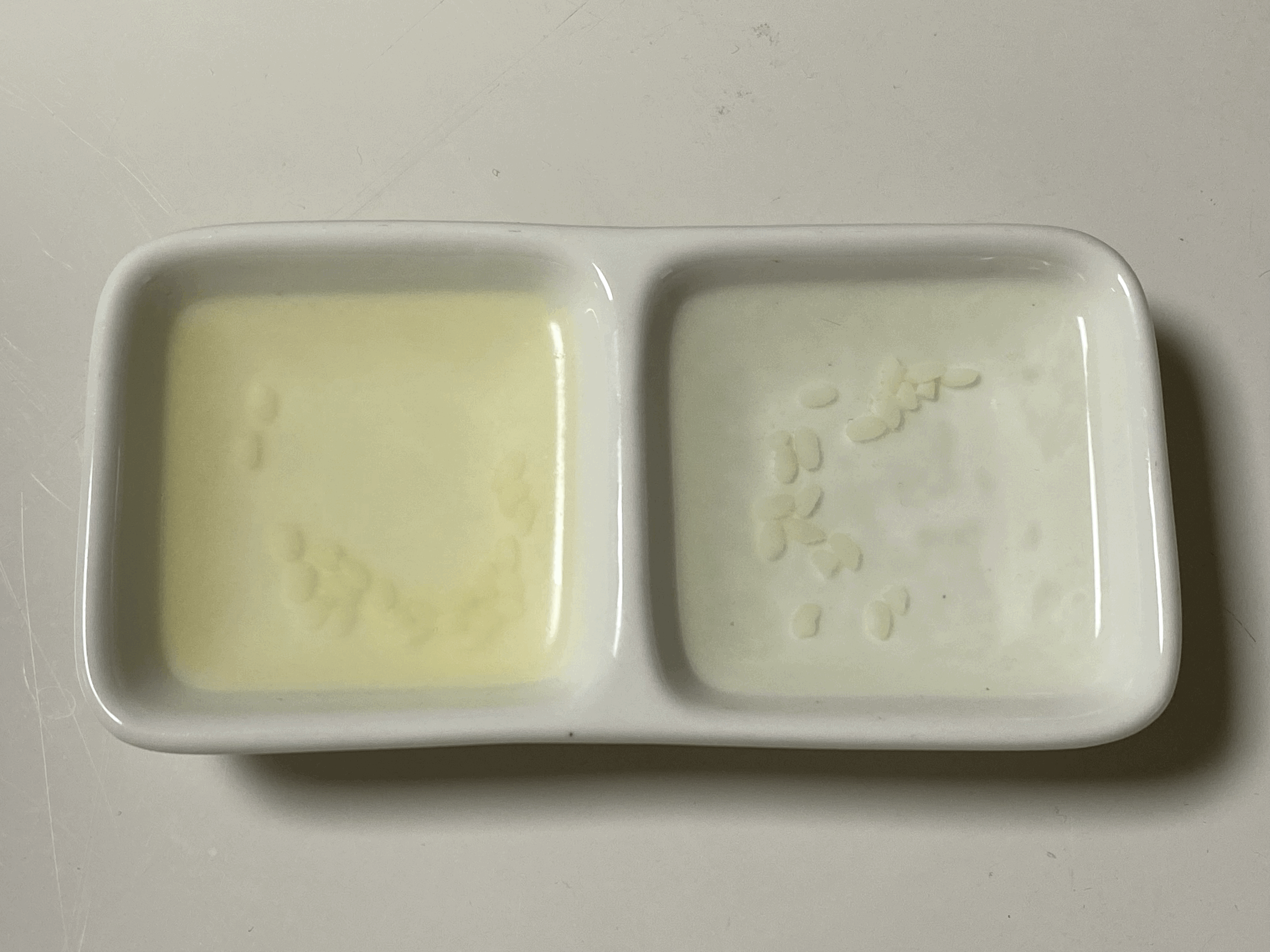 - 아래는 두가지 쌀을 씻지 않은 채 그대로 물에 불려두고 이틀 지났을 때의 모습니다. 첫 사진이 진안연찹쌀이고 두번째 사진이 다른 찹쌀이다. 진안연찹쌀을 불려둔 쪽이 수면에 뜬 유분이 훨씬 많다.
