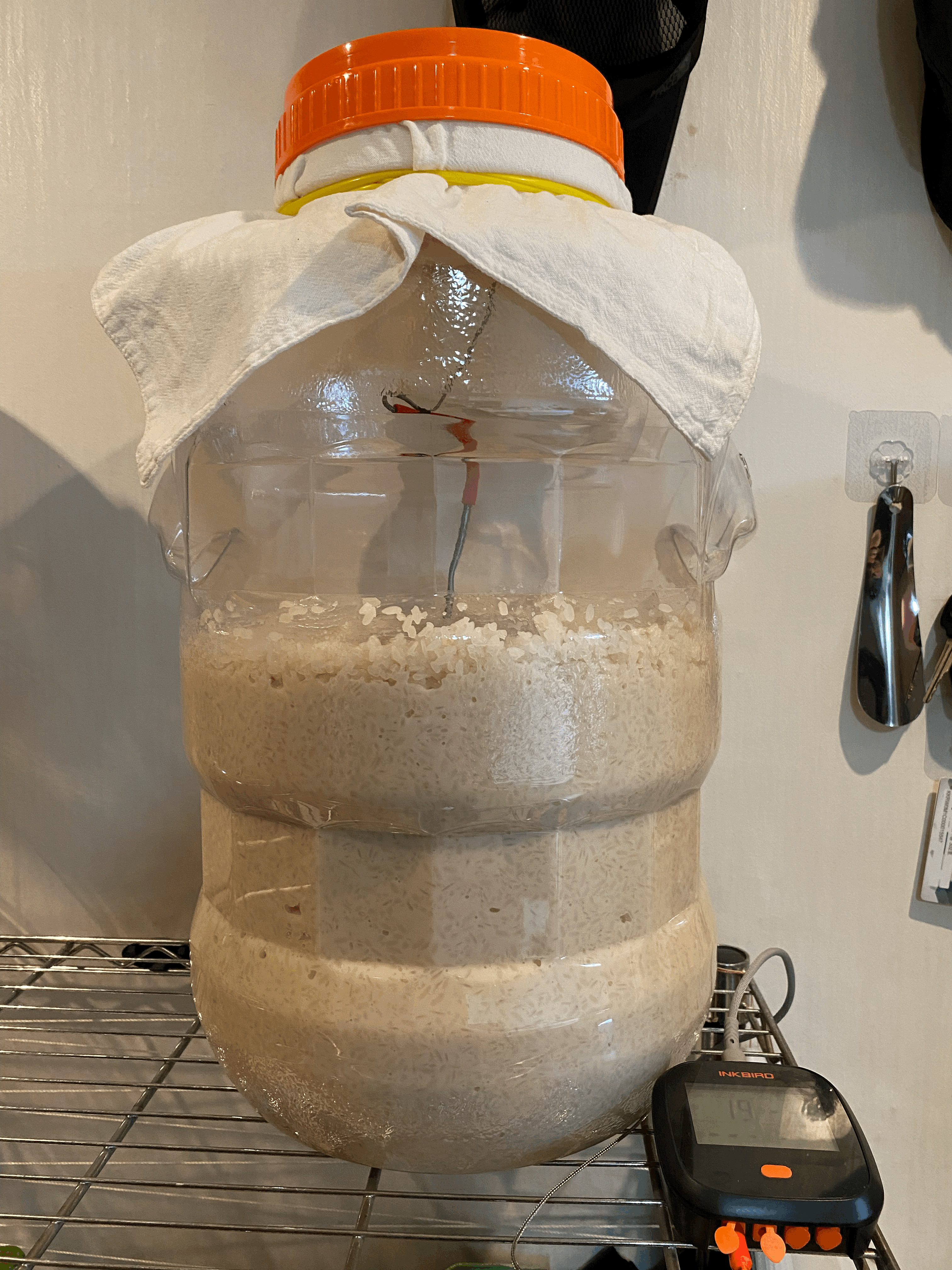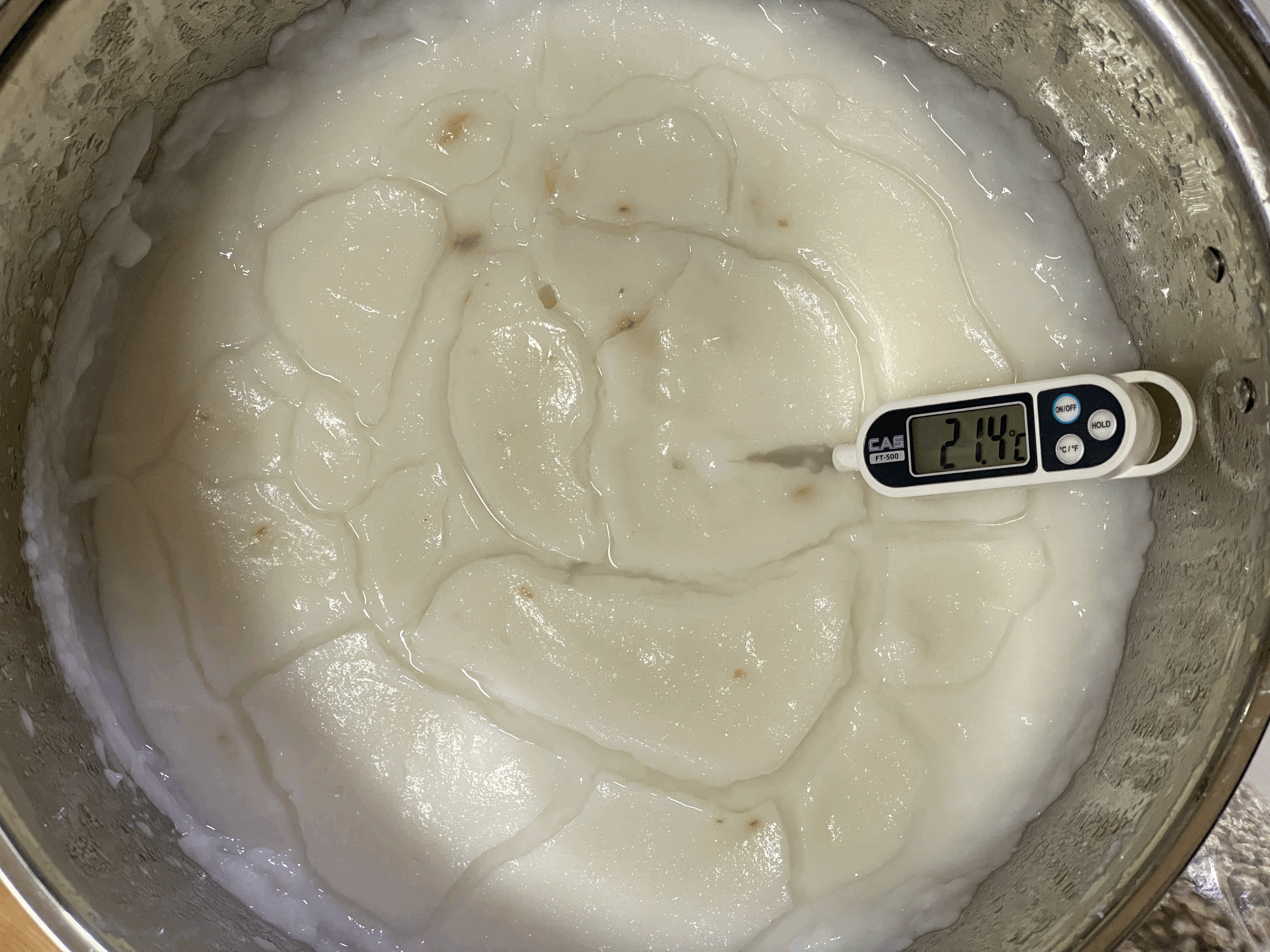 - 발코니에서 냉각시킨 죽의 품온이 21.4도인 상태에서 누룩과 혼화시킨 후 다시 들통 채로 품온 온도계 셋팅하고, 면보 덮고, 뚜껑 덮어 실내에서 보쌈.