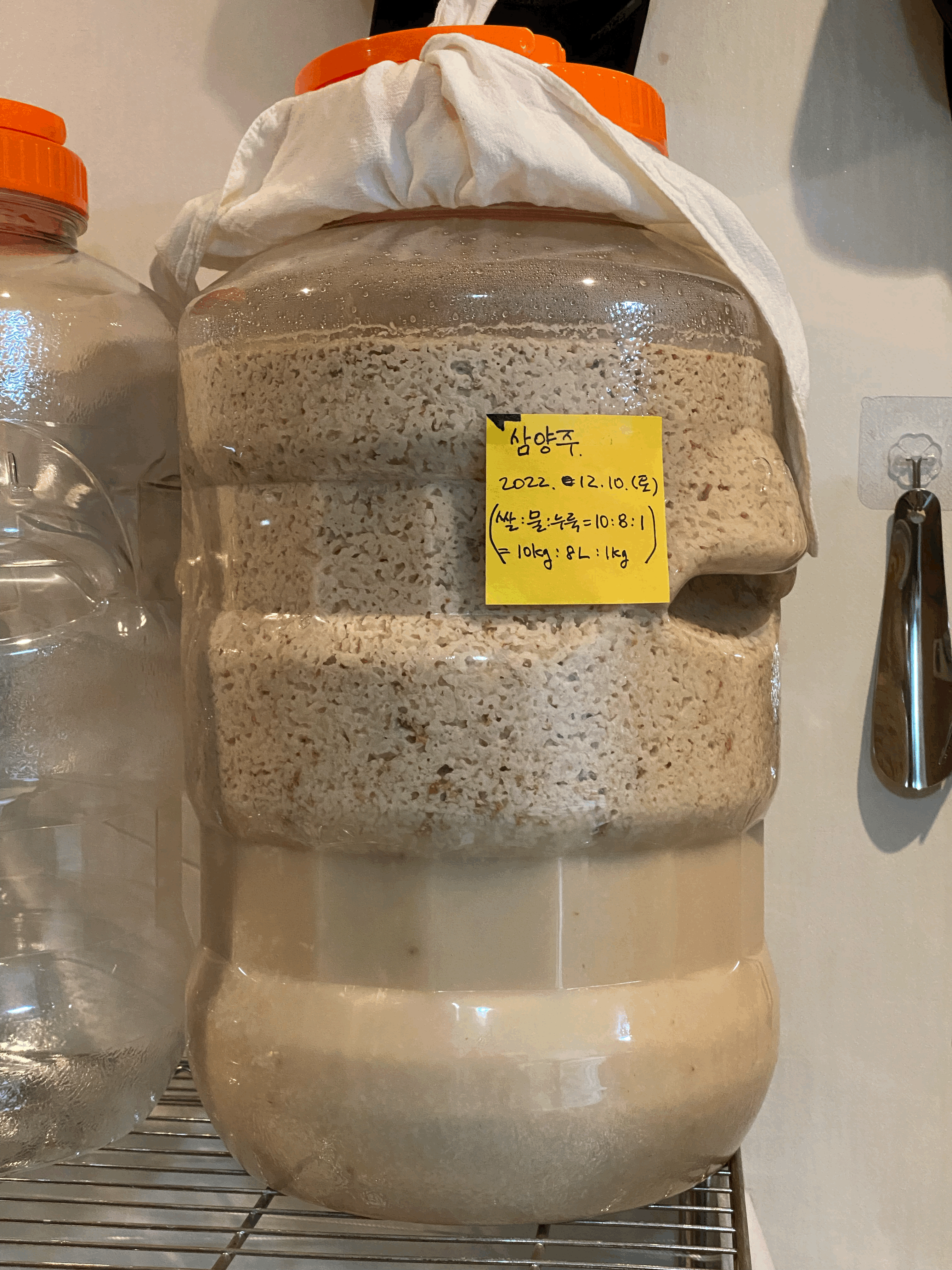 - 술통은 22L인데, 총 쌀 10kg와 물 8L가 들어가게 된다. 넘치지 않을지 살짝 염려되긴하지만, 이미 술은 상당히 묽은 상태라 기포로 인해 부풀어 오를 부분은 술 위에 뜬 고두밥 밖에 없어 보여서 진행하기로 함.