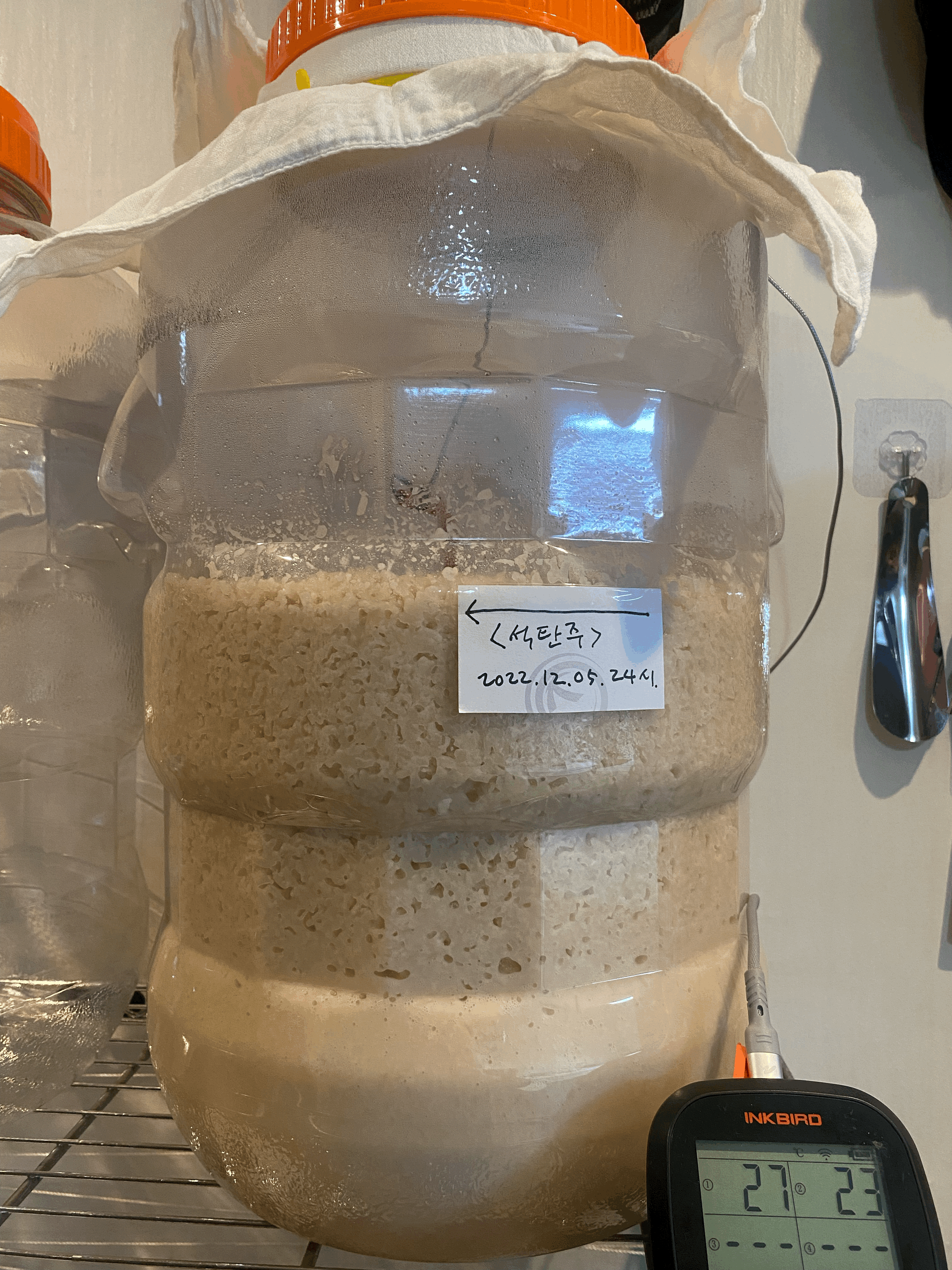- 술독 표면이 촉촉해졌고, 술독 상부가 입항 시 대비 1인치 가량 올라갔길래 비닐은 벗겨냄. (품온 26.2도, 실내온도 23.1도)