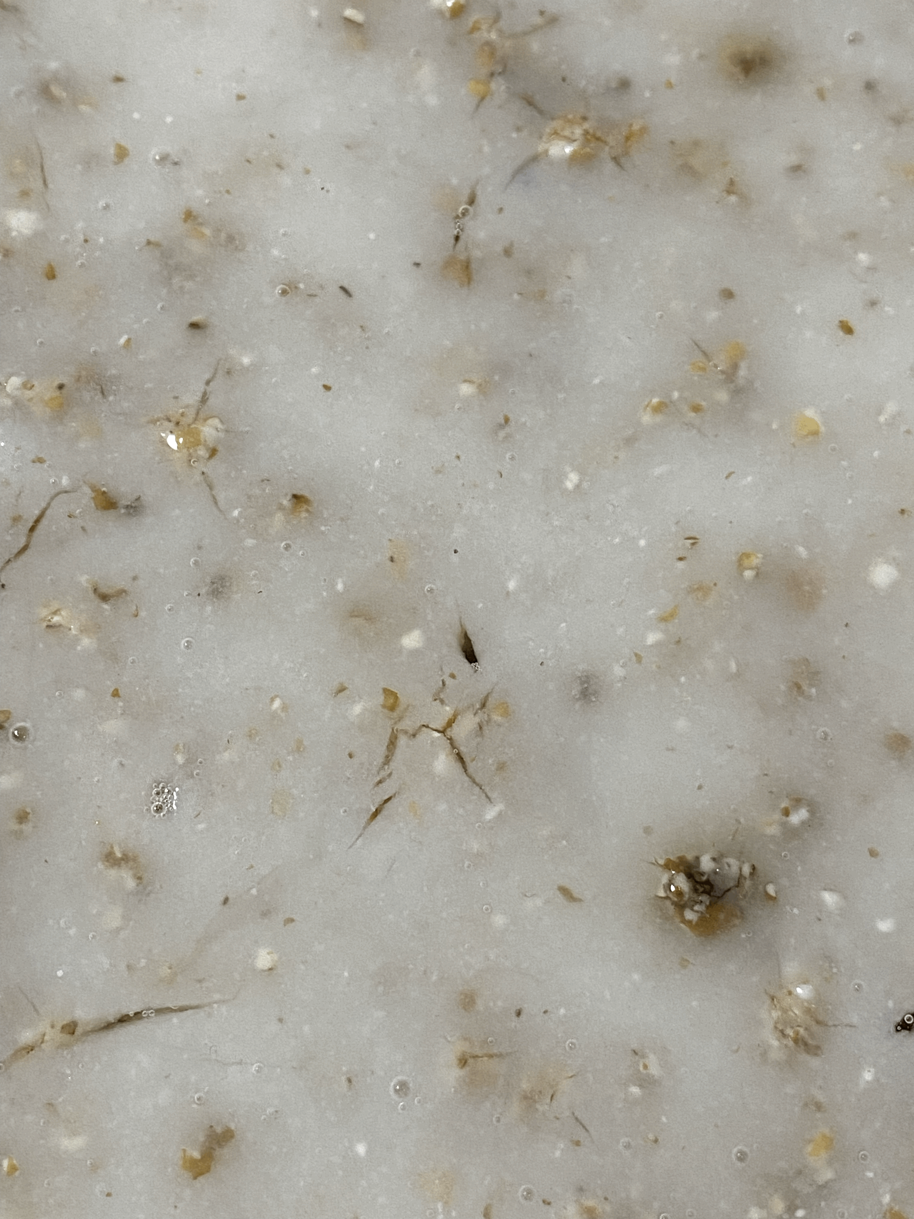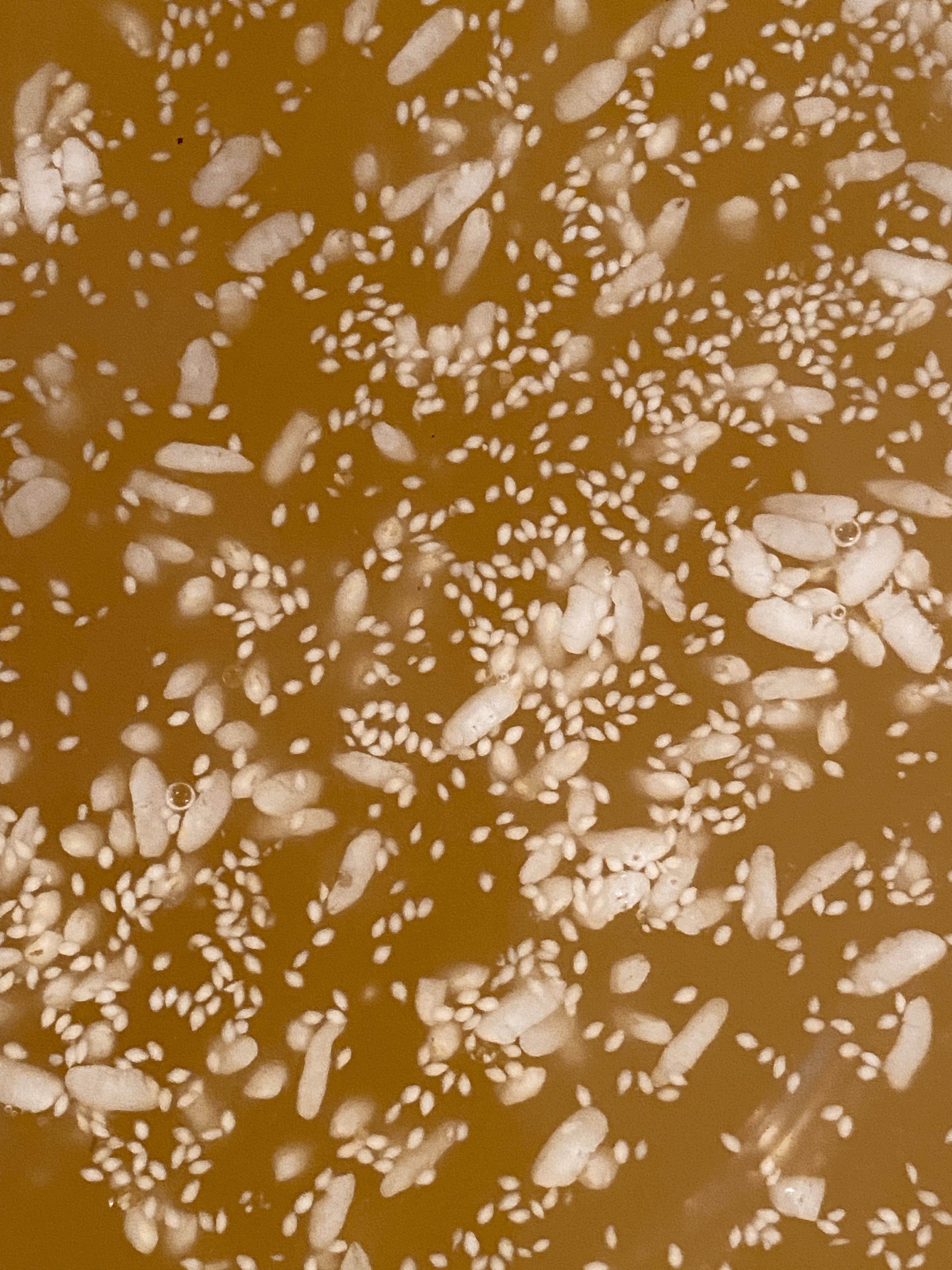 - 옆면에서 보면 작은 기포가 꽤 많이 계속 올라오고 있지만, 술 표면은 고두밥이 쌀튀밥으로 만든 강정처럼 촉촉하면서도 굳은 표면처럼 보여서 기포 터지는 모습은 보이지 않음.