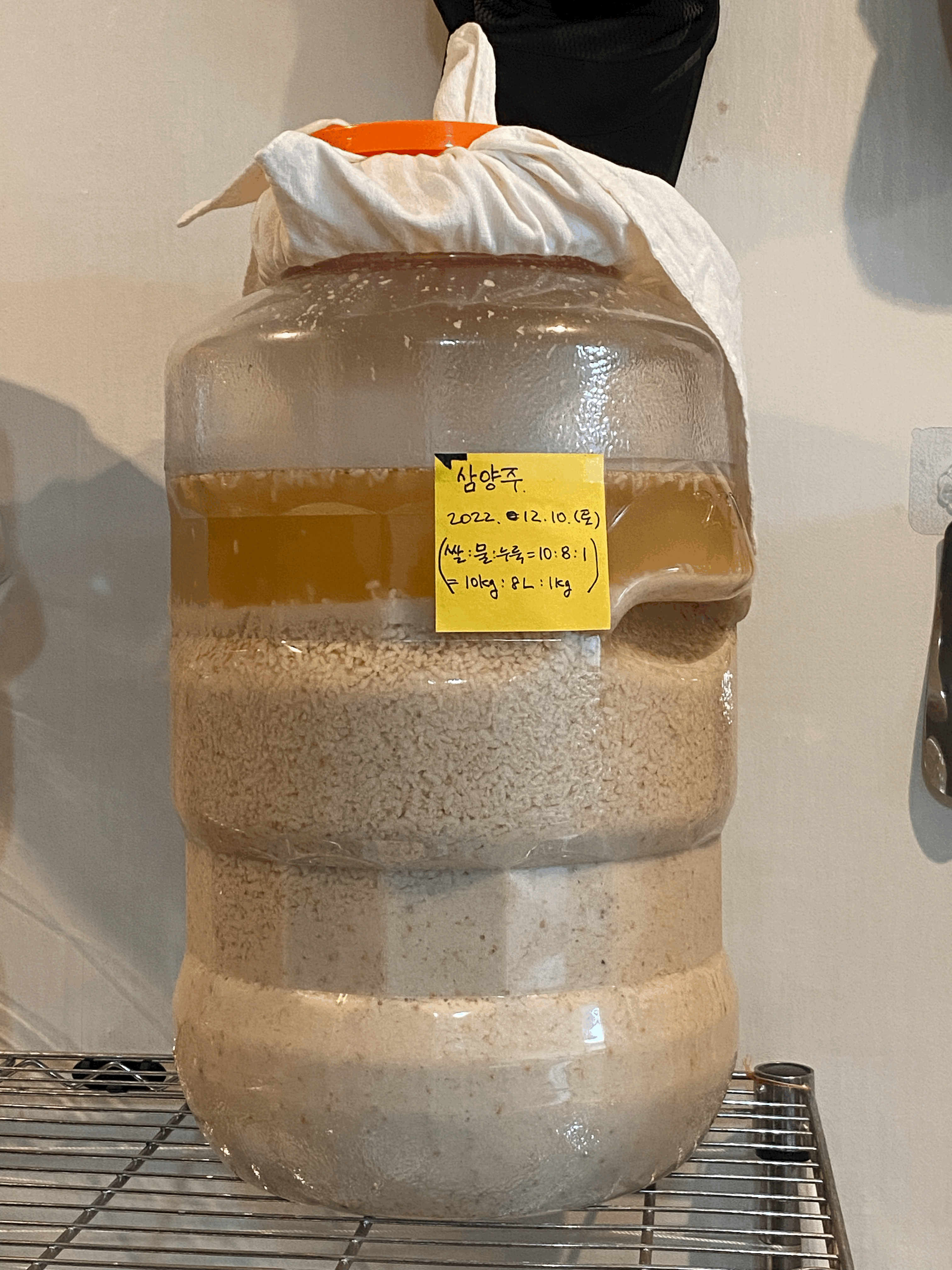 - [12/02.금] 밑술(죽) = 멥쌀(1kg, 햅쌀/임금님표이천쌀/습식) + 물(6L, 스파클 생수) + 누룩(600g, 송학곡자/우리밀)