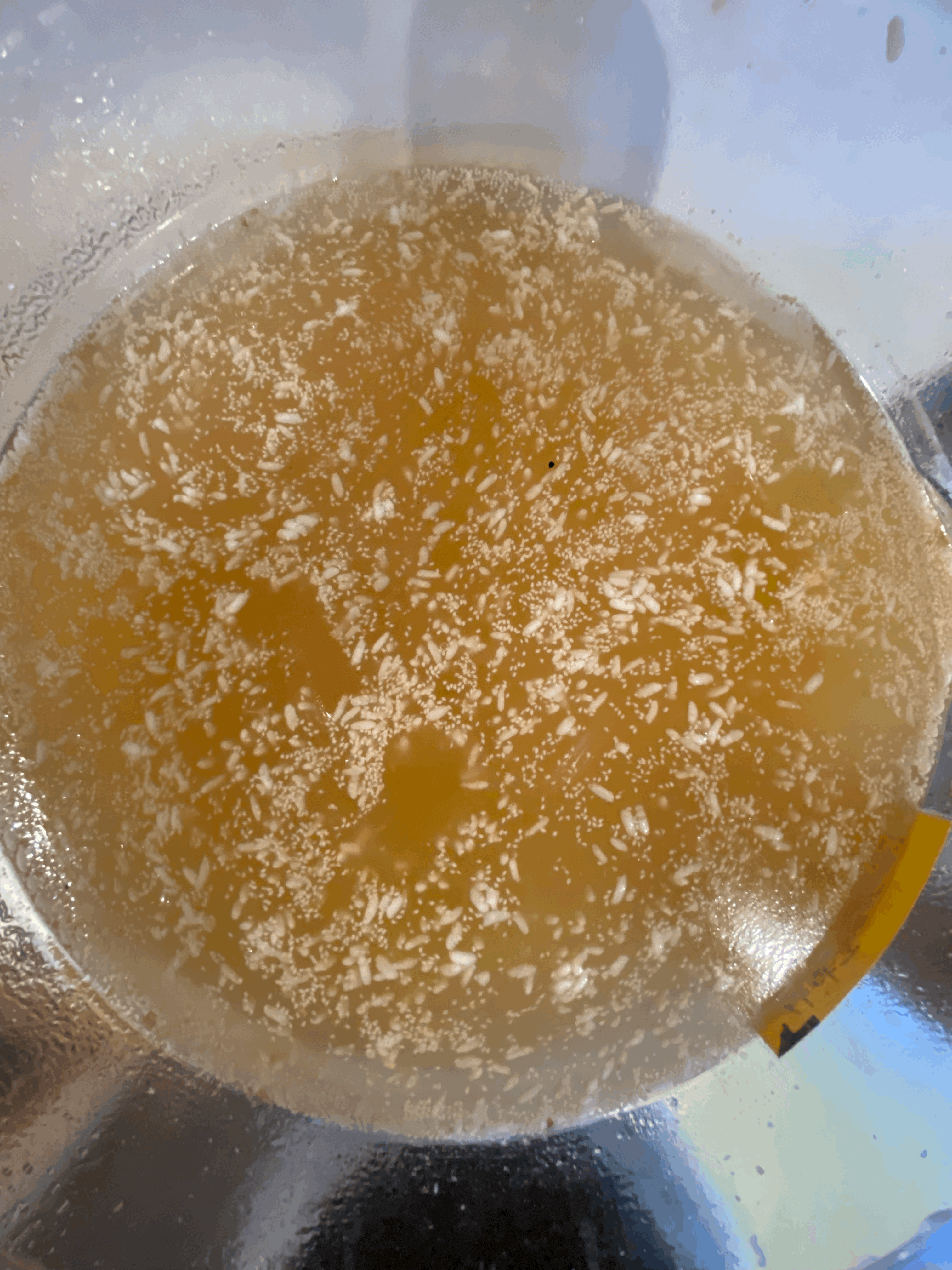 - 덧술 후 12시간 지난 상태 (12/4 01:43), 저어준 뒤 기포가 올라온 상태