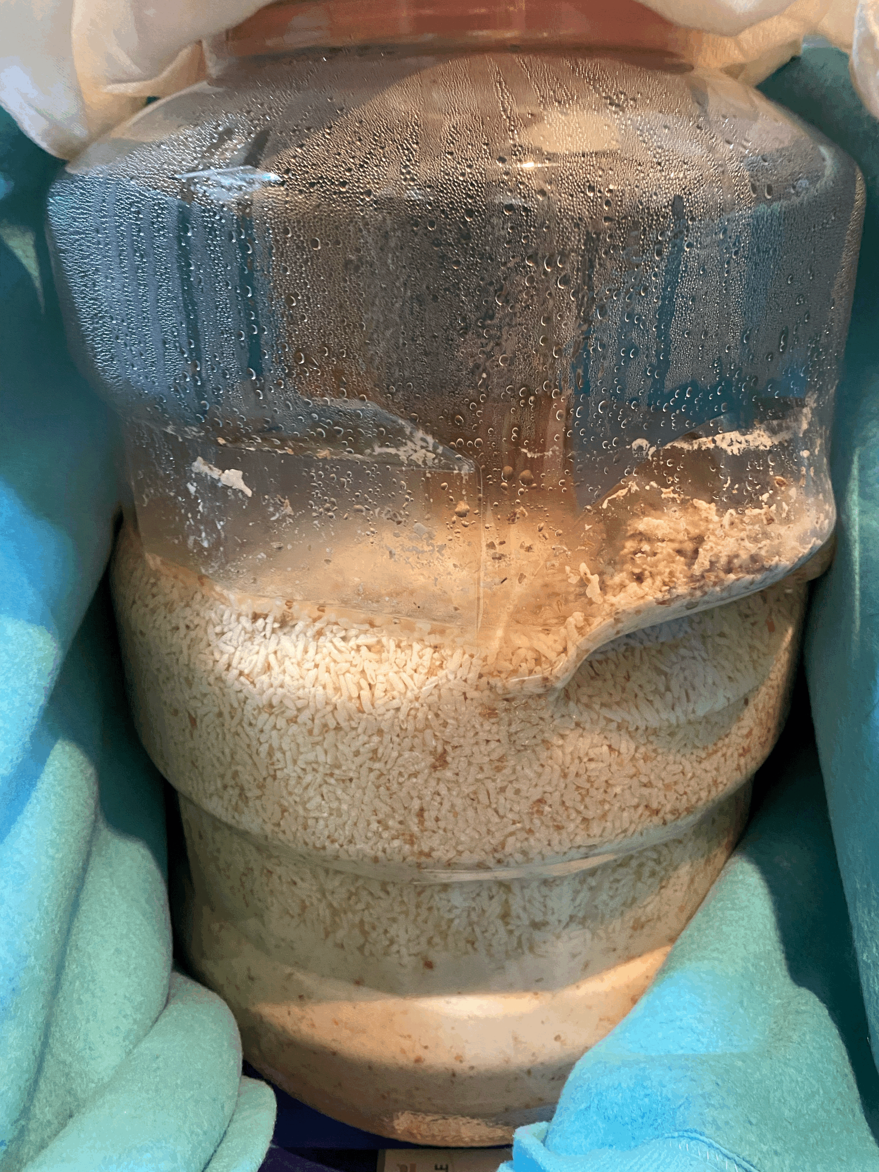 → 발효 환경은 하루종일 24~26도를 유지하는 실내. - 밑술을 술독에 넣은 후 찍은 사진. 술독은 PET병 10L. (토, 14:04)