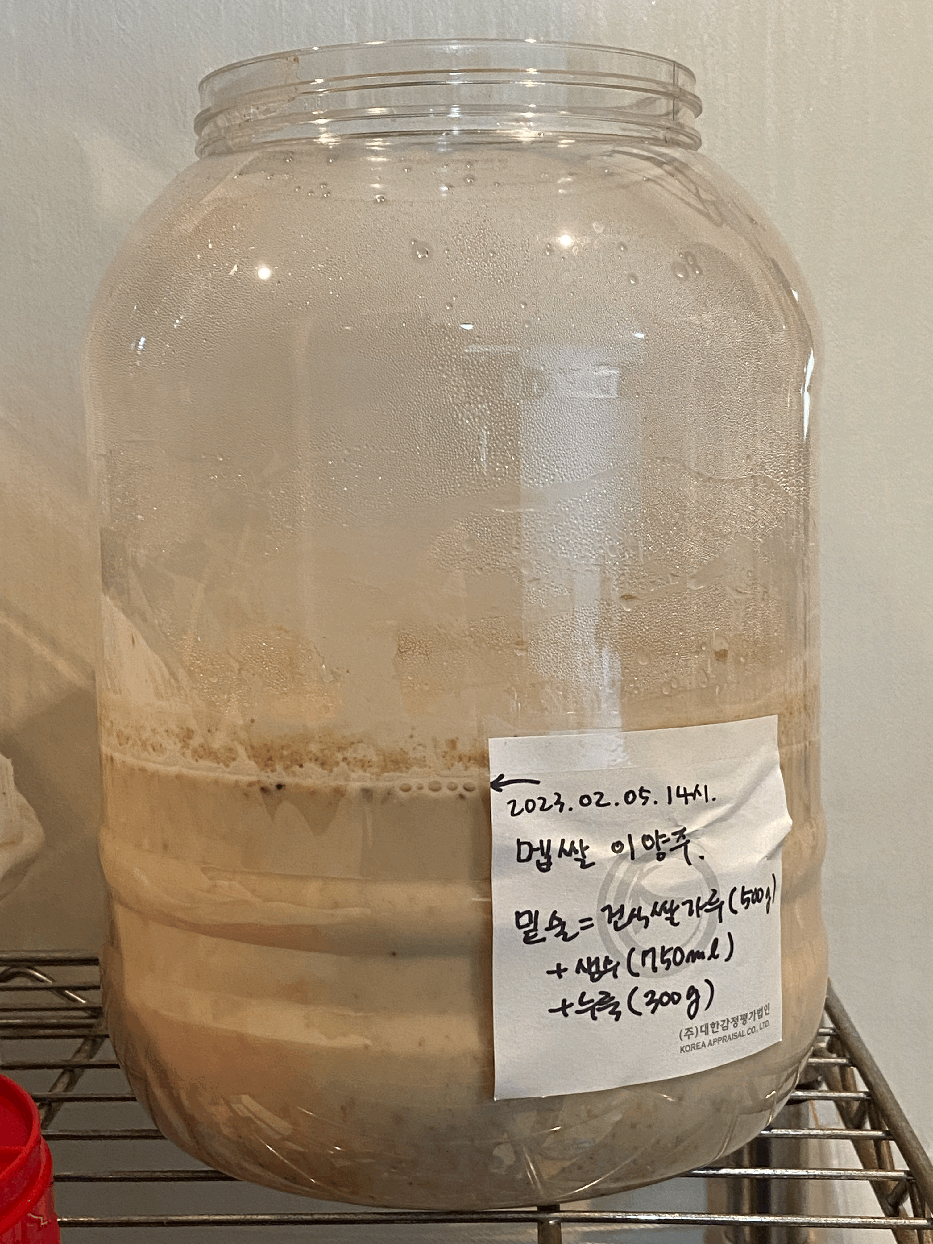 - [2/05.일] 밑술(범벅) = 멥쌀(500g, 건식) + 물(1.75L, 스파클 생수) + 누룩(300g, 송학곡자/우리밀)