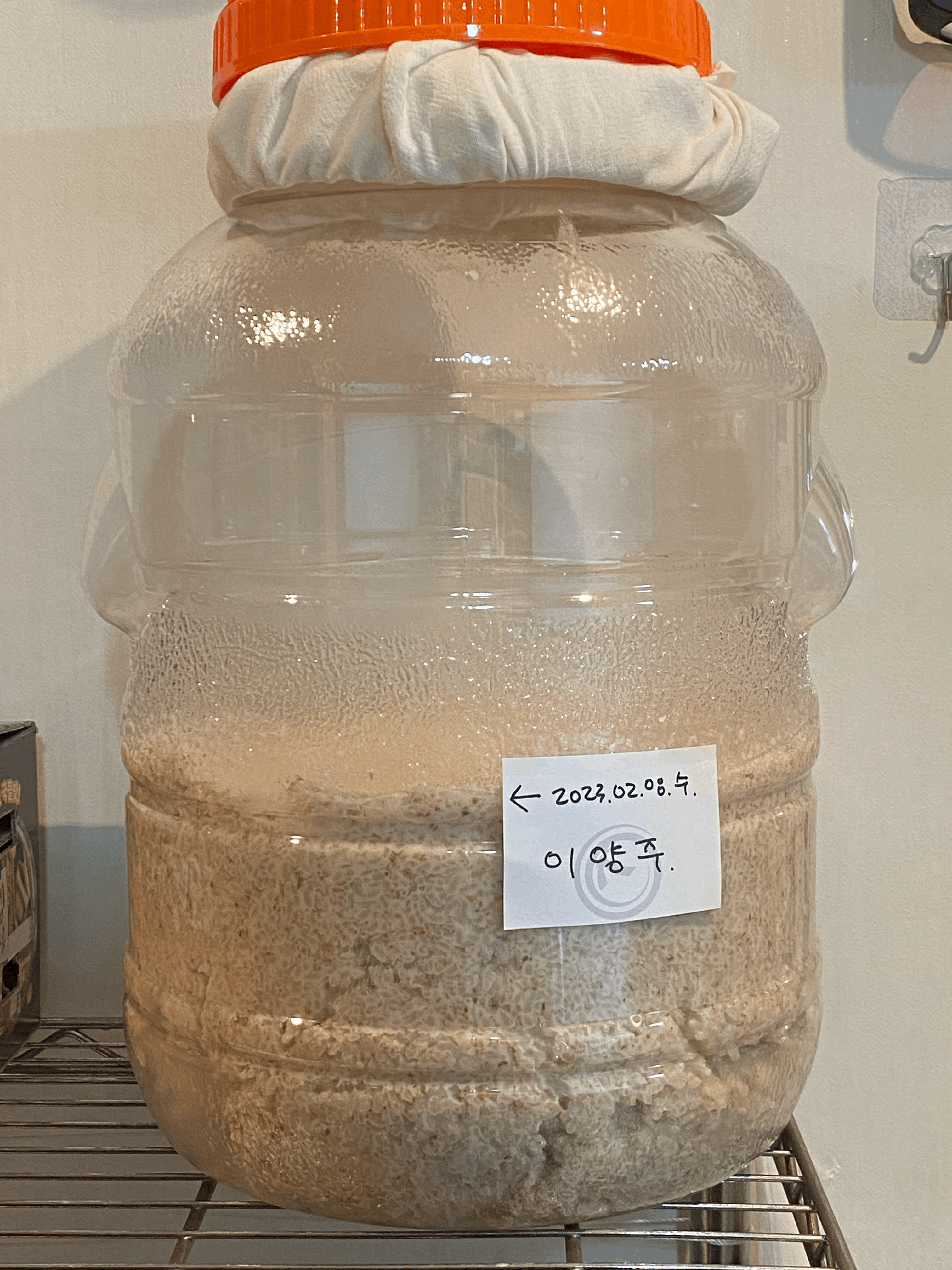 - 이번 술은 뚜껑도 위 사진처럼 대충 덮어서 현관문 앞에 보쌈해둠. 목요일 밤에 품온 점검해 볼 예정. 금/토에는 아침/저녁으로 품온 점검해보고 품온이 정점을 찍은 후 이거나 37도를 넘지 않도록 하여 냉각시킬 예정. 냉각 후에는 뚜껑을 꽉 잠그고 1/8바퀴만 풀러 가스가 빠질 수 있을 정도만 해서 혐기발효 진행 예정. 멥쌀은 발효도 늦고 저 상태에서 별로 부풀어오르지도 않는다 함.
