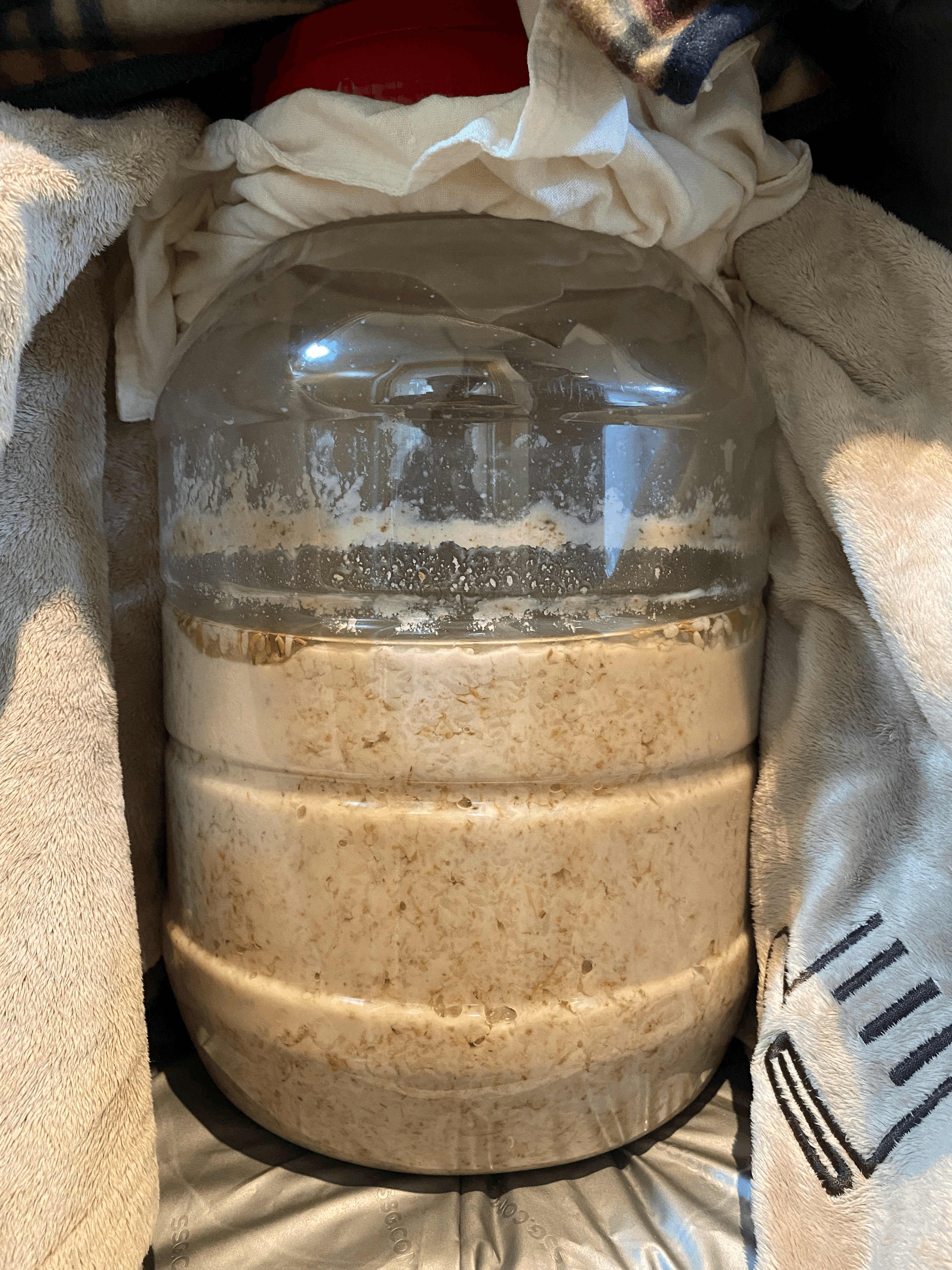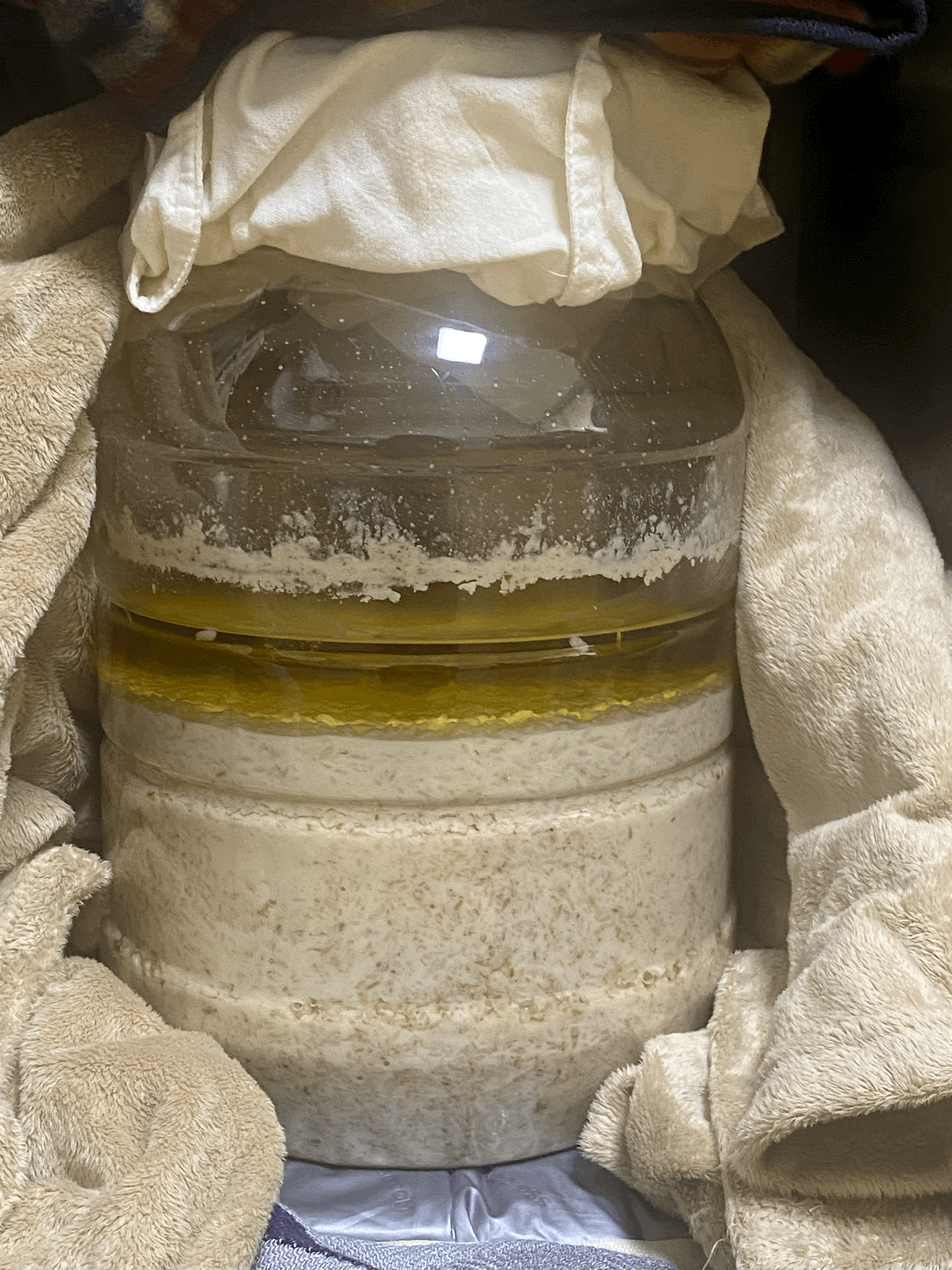 → 효모 증식을 위한 호기성 환경을 제공하려고 소독한 주걱으로 밑술을 팍팍 저어주고 다시 보쌈해둠.밑술을 저어주기 위해 보쌈에서 꺼내보니 표면에 수분이 생겼음.