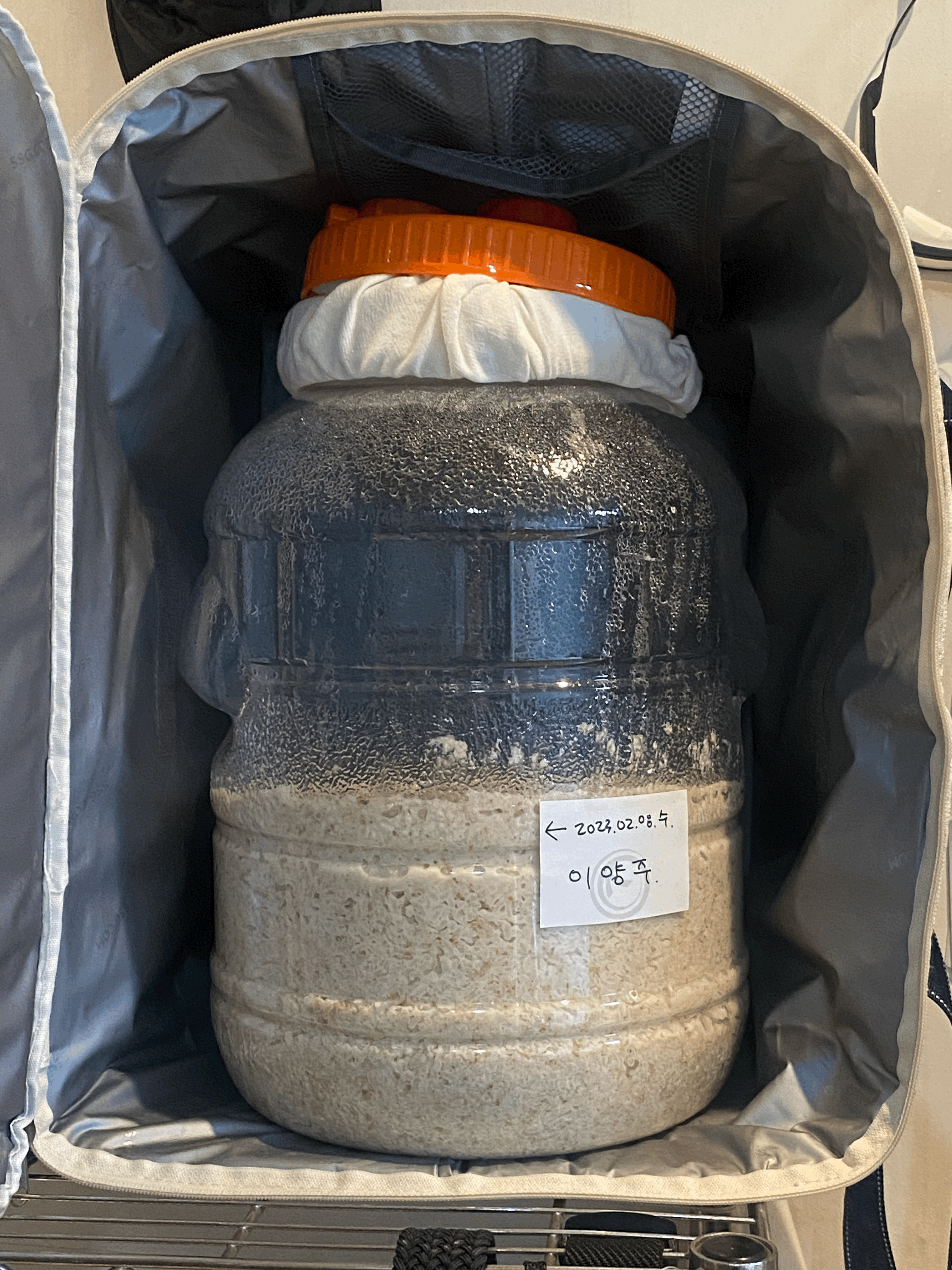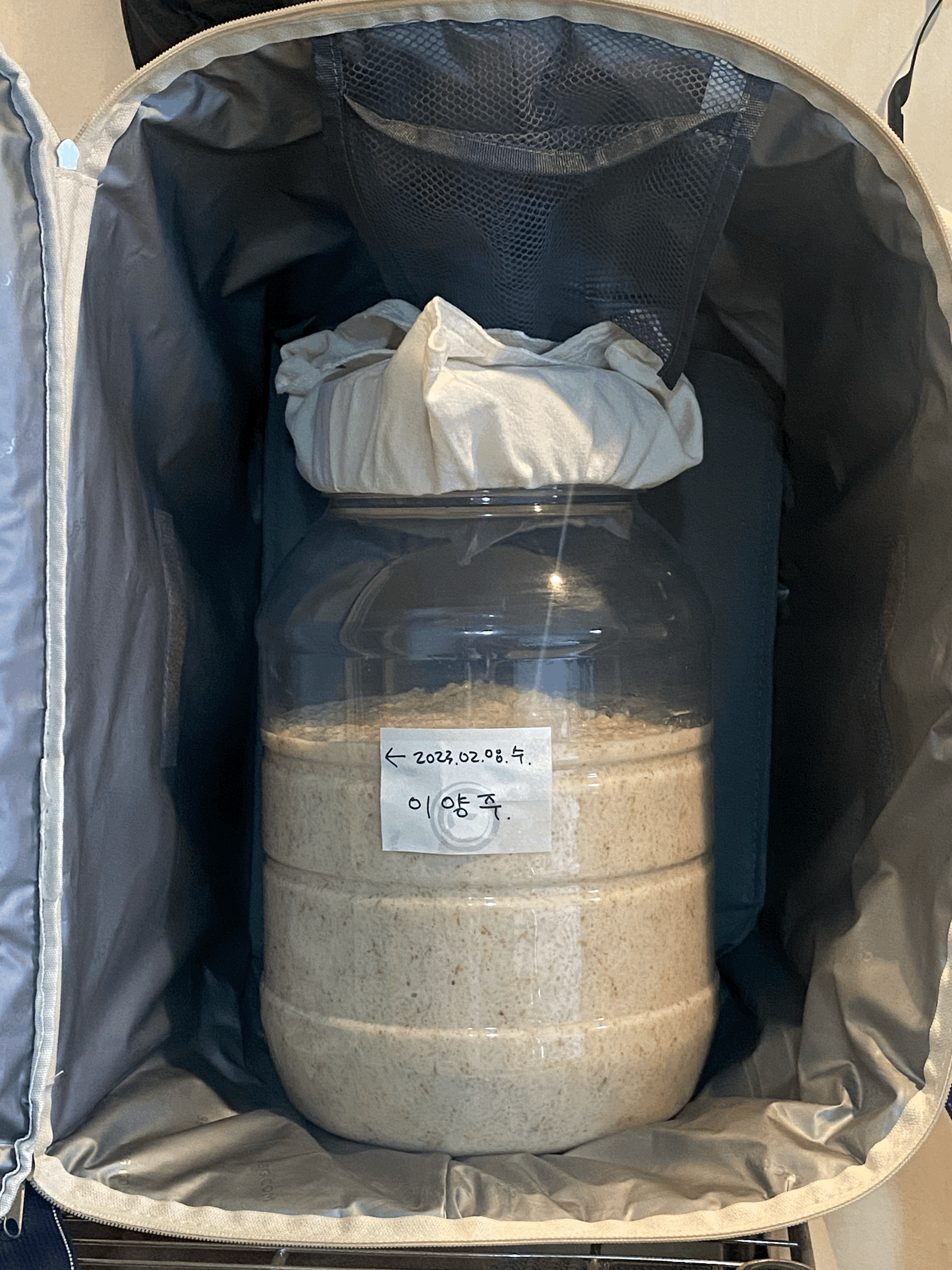 - 주발효 후 냉각한 뒤 후발효할 땐 이 보냉가방으로 보쌈해둘 예정. 실내 환기로 인한 온도 변화가 술독에 미치는 영향을 줄이기 위함.