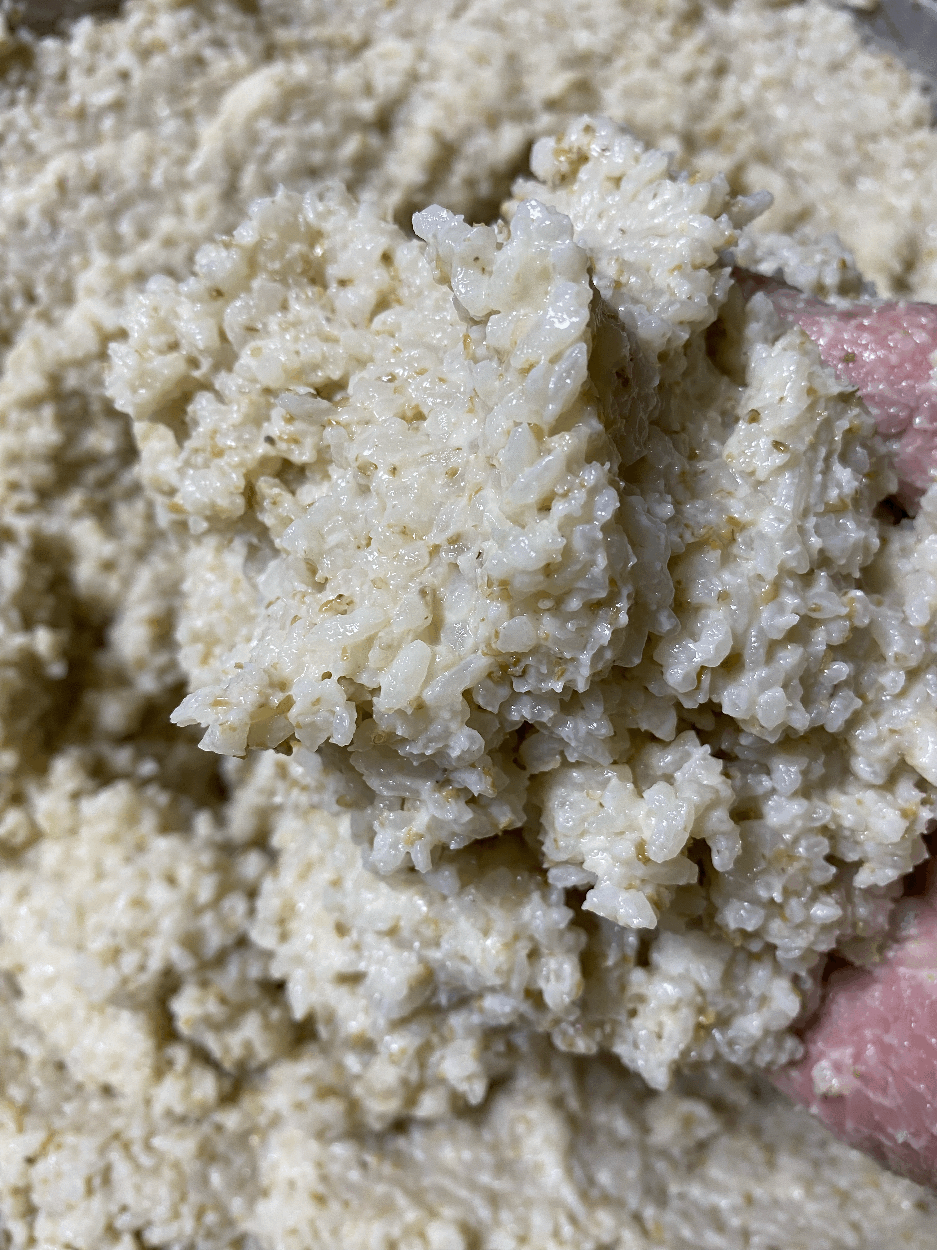 - 30분간 치댄 후의 상태인데, 고두밥이 밑술의 수분을 거의 다 흡수해서 꾸덕해졌고 끈적한 점성이 생겼음.