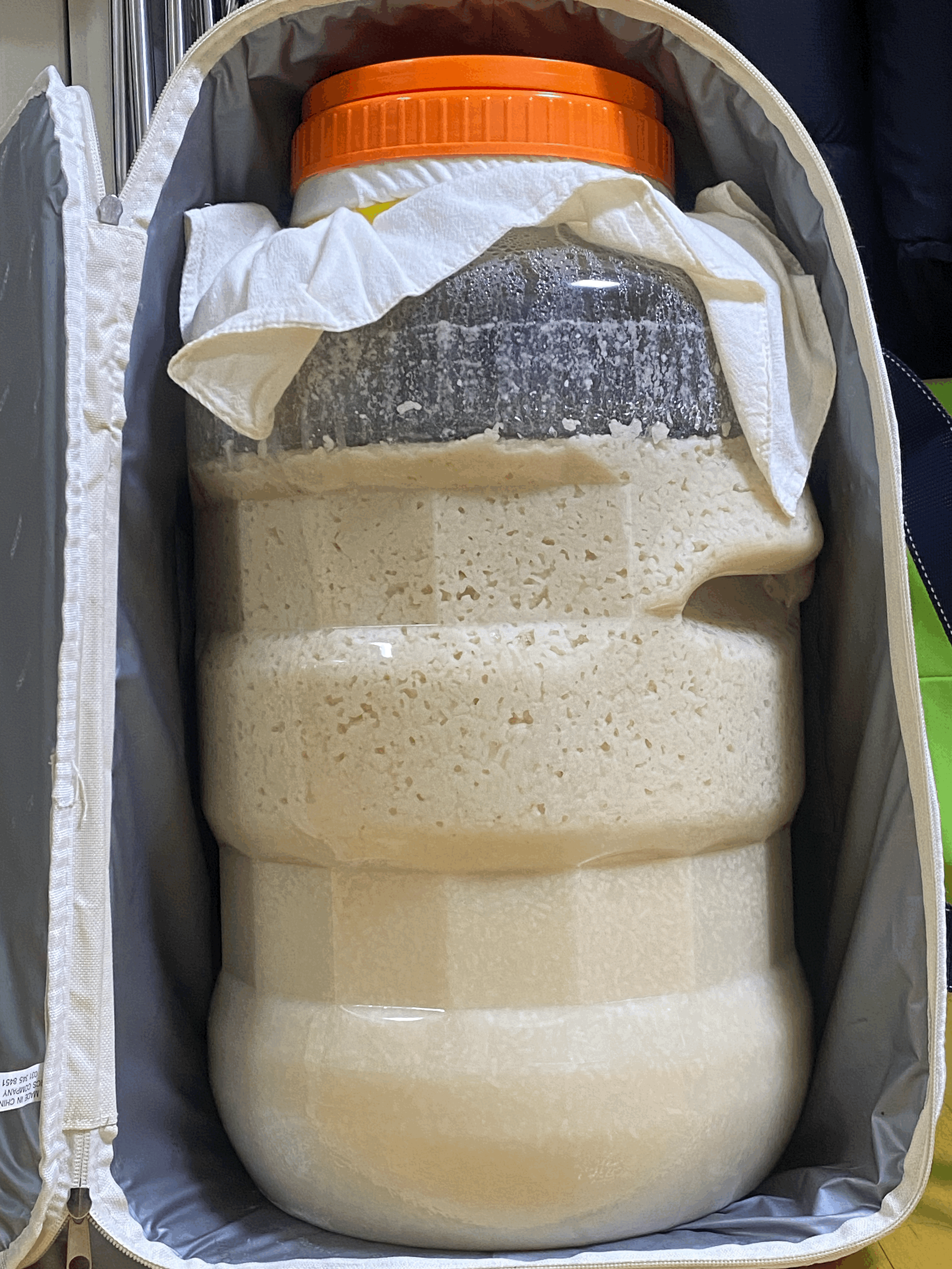 - 냉각시켜둔 술독을 만져보고 잘 식었으면 실내로 갖고 들어와서 뚜껑은 그대로 잠근 상태로 두고, 술독은 보냉백(SSG 알비백)으로 보쌈해서 후발효 시작하며, 후발효할 동안 술독을 건드리지 않는다.
