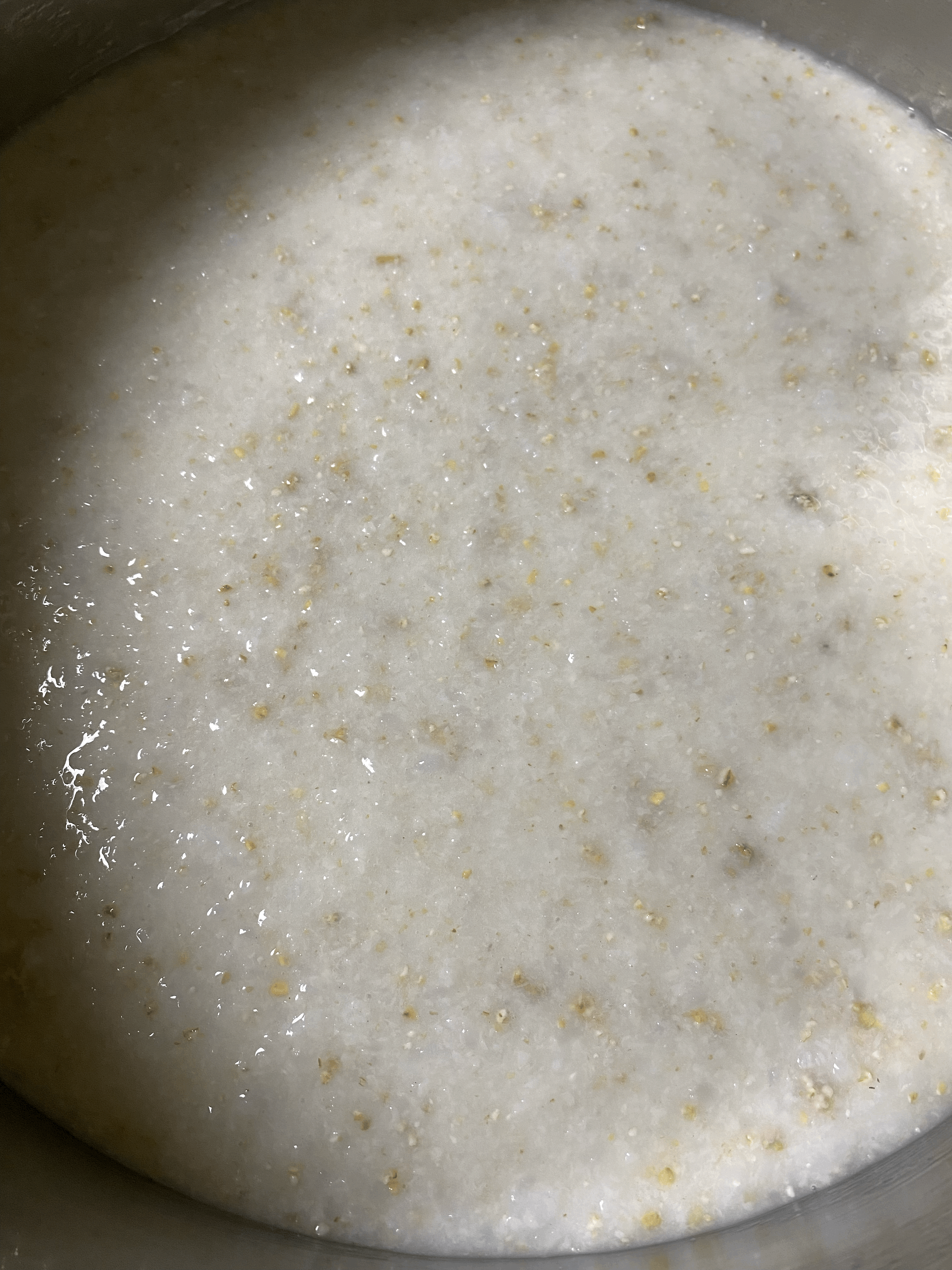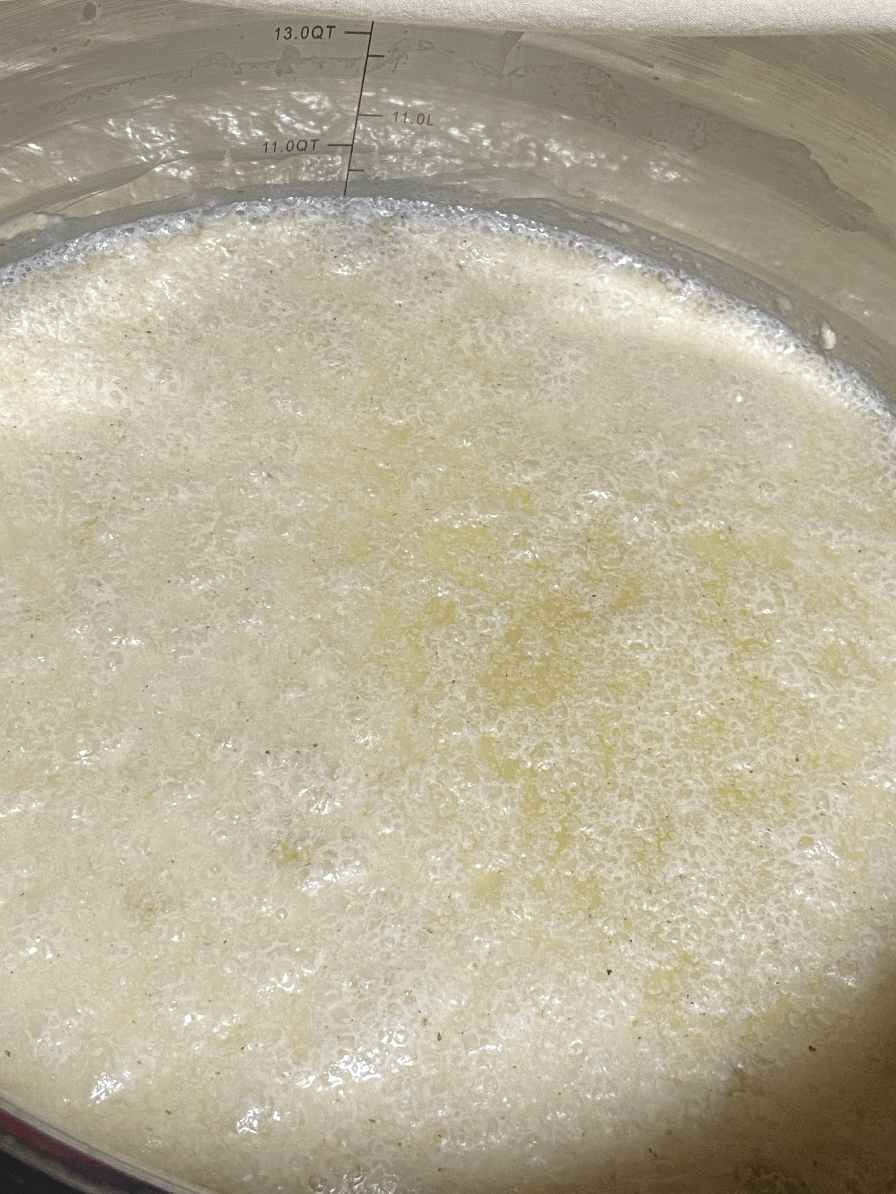 → 소독한 주걱으로 밑술을 저어보니 농도는 팔팔 끓고 있을 때의 통쌀죽보다 더 묽어진 상태이고, 거품도 올라옴.
