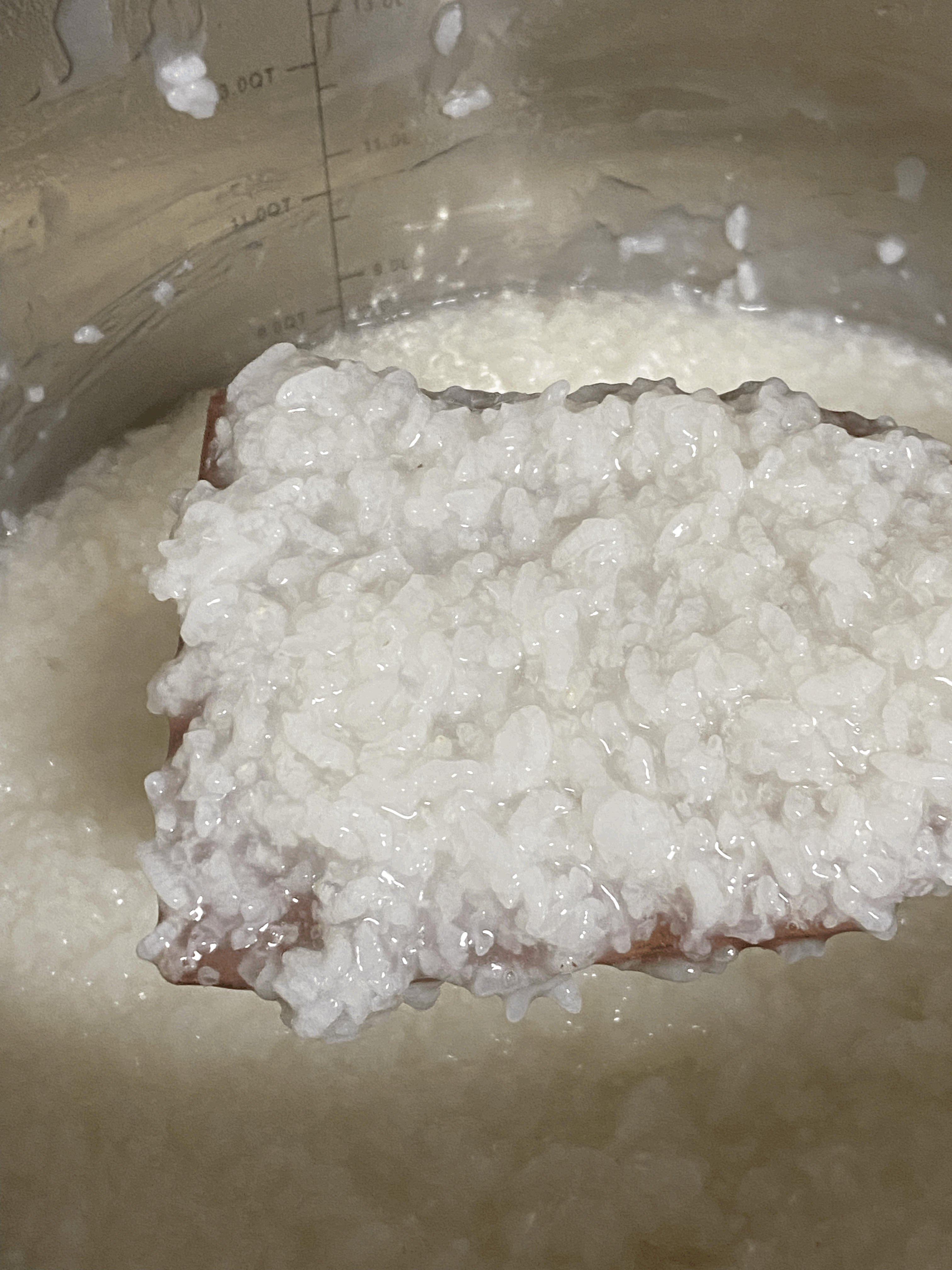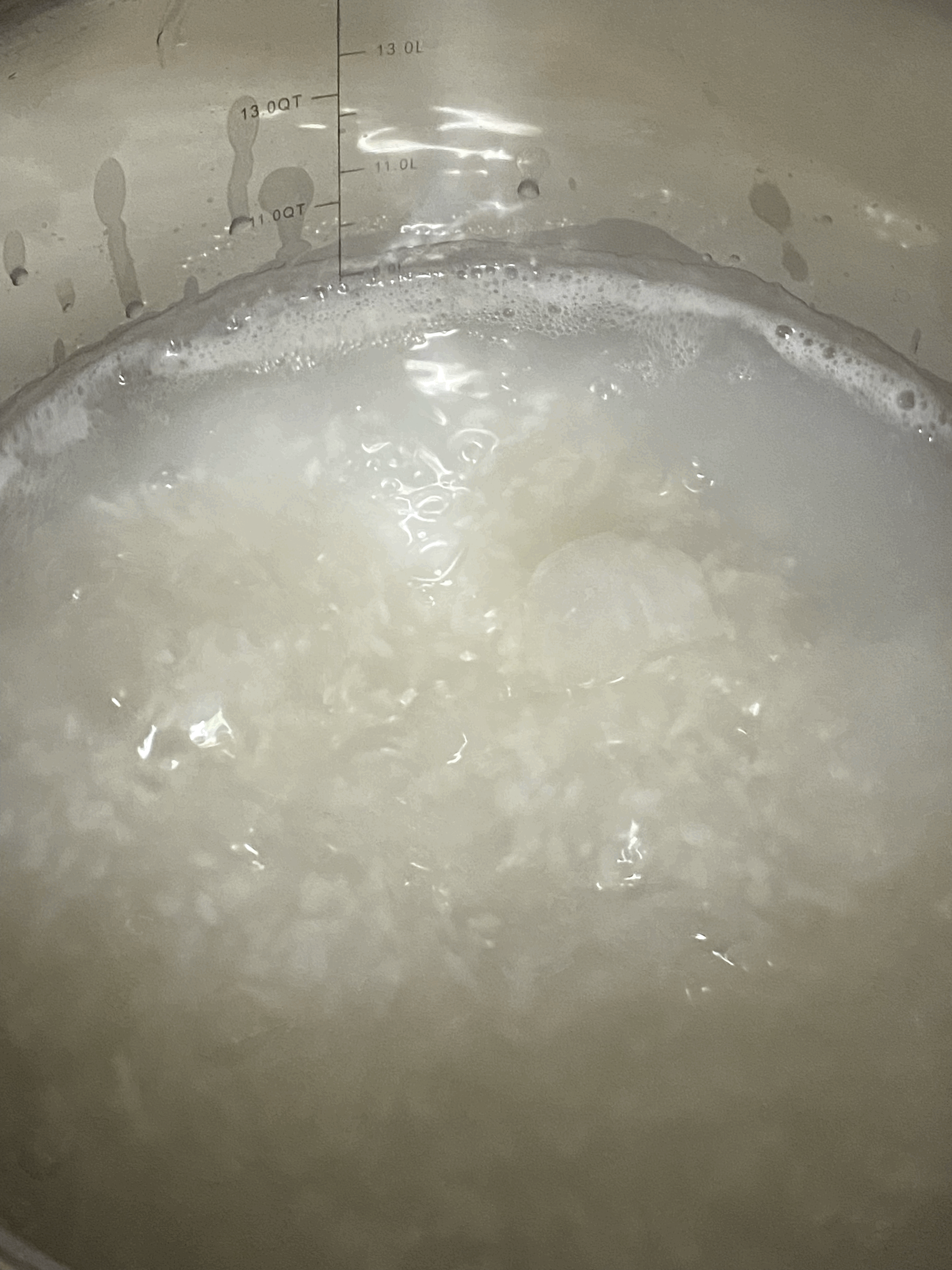- 남은 절반의 불린 쌀을 넣은 뒤 냄비 속의 통쌀죽의 높이는 9L에 살짝 못미침. (2/21.화.23:38, 죽 끓이기 시작한지 5분 지남)
