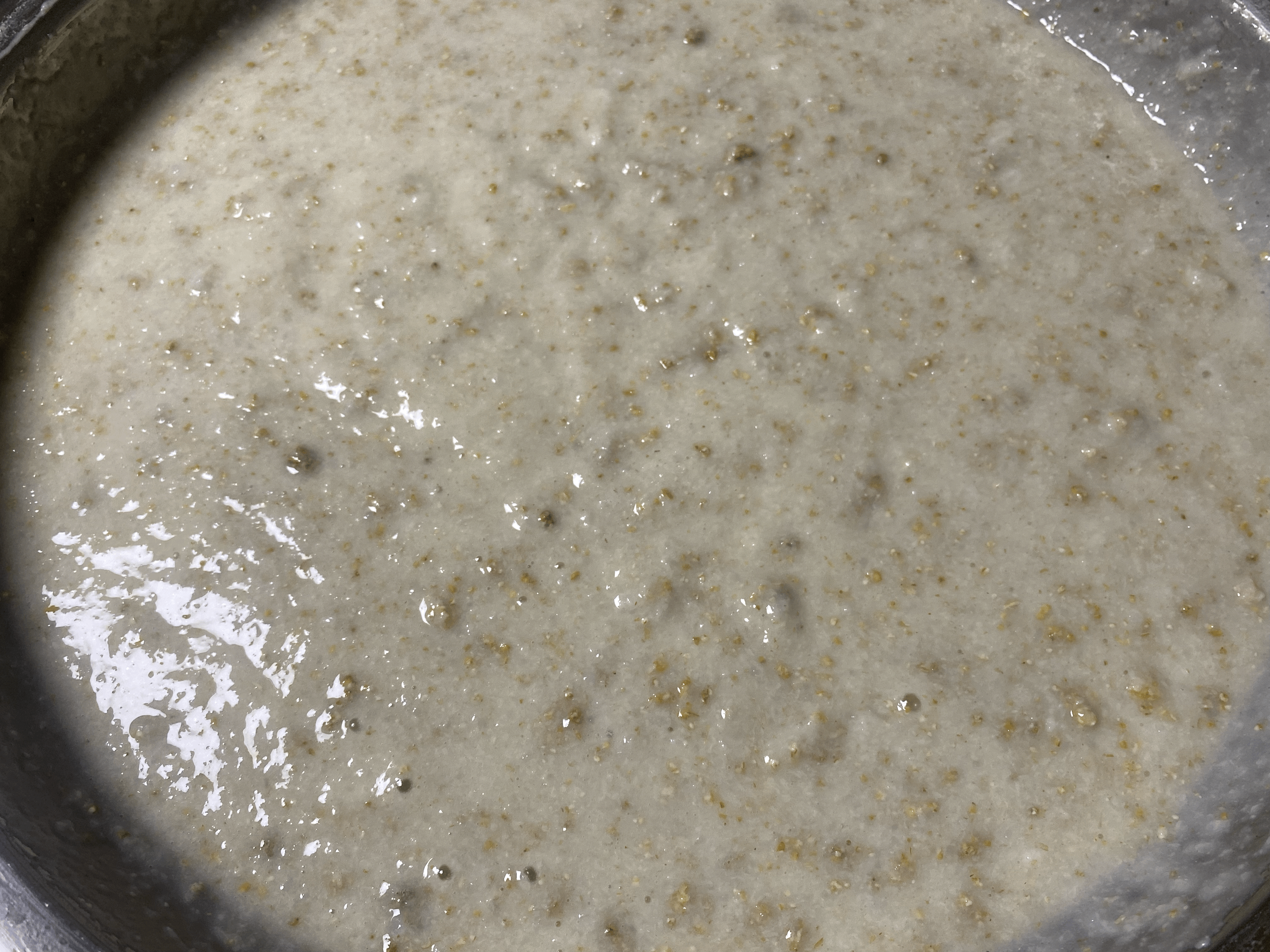 - 통쌀죽이 담긴 곰솥을 뒤집어 곰솥에 통쌀죽을 부어보니 덩어리 째로 툭 떨어짐. 곰솥 바닥에 눌어 붙지도 않고 잘 끓여졌음.
