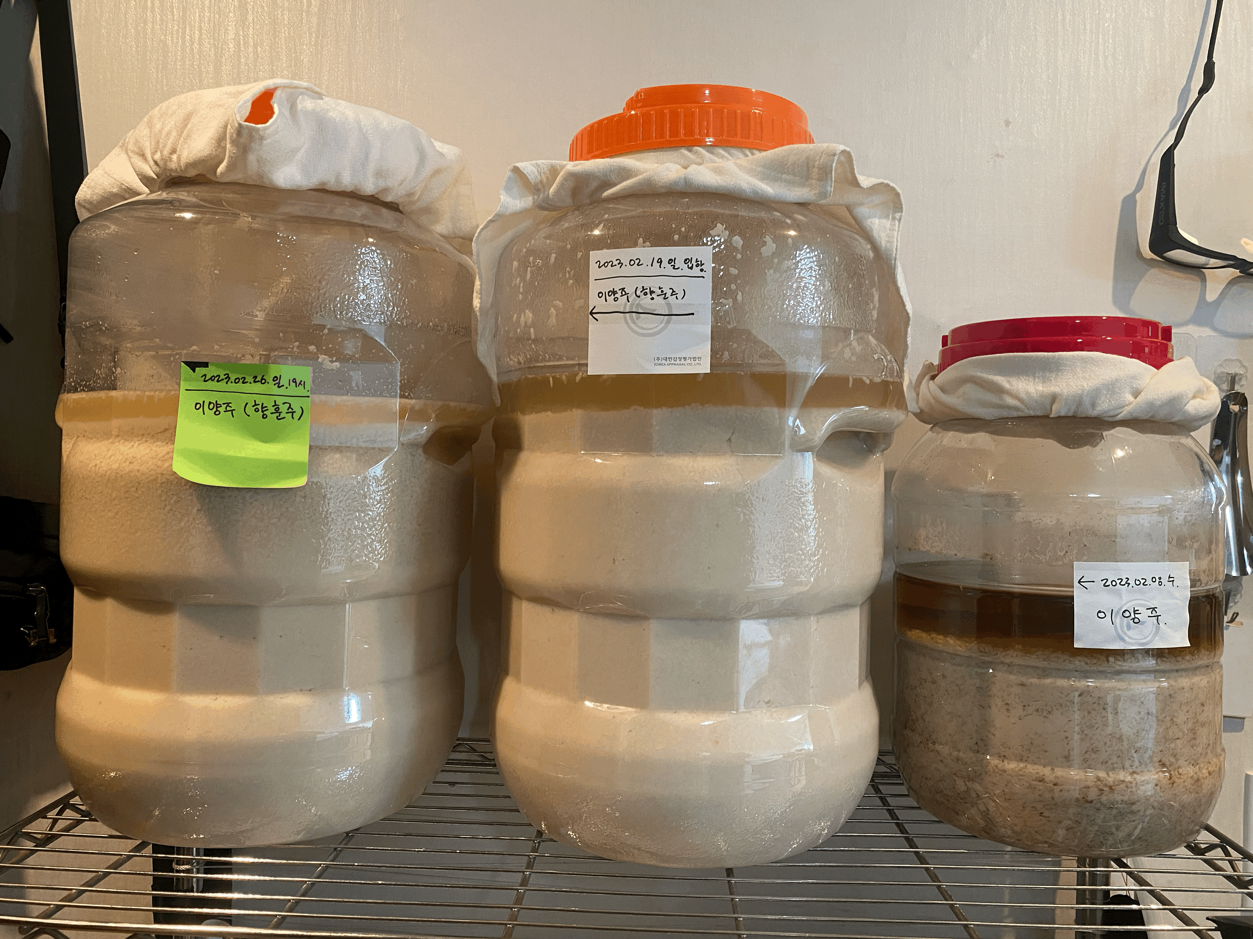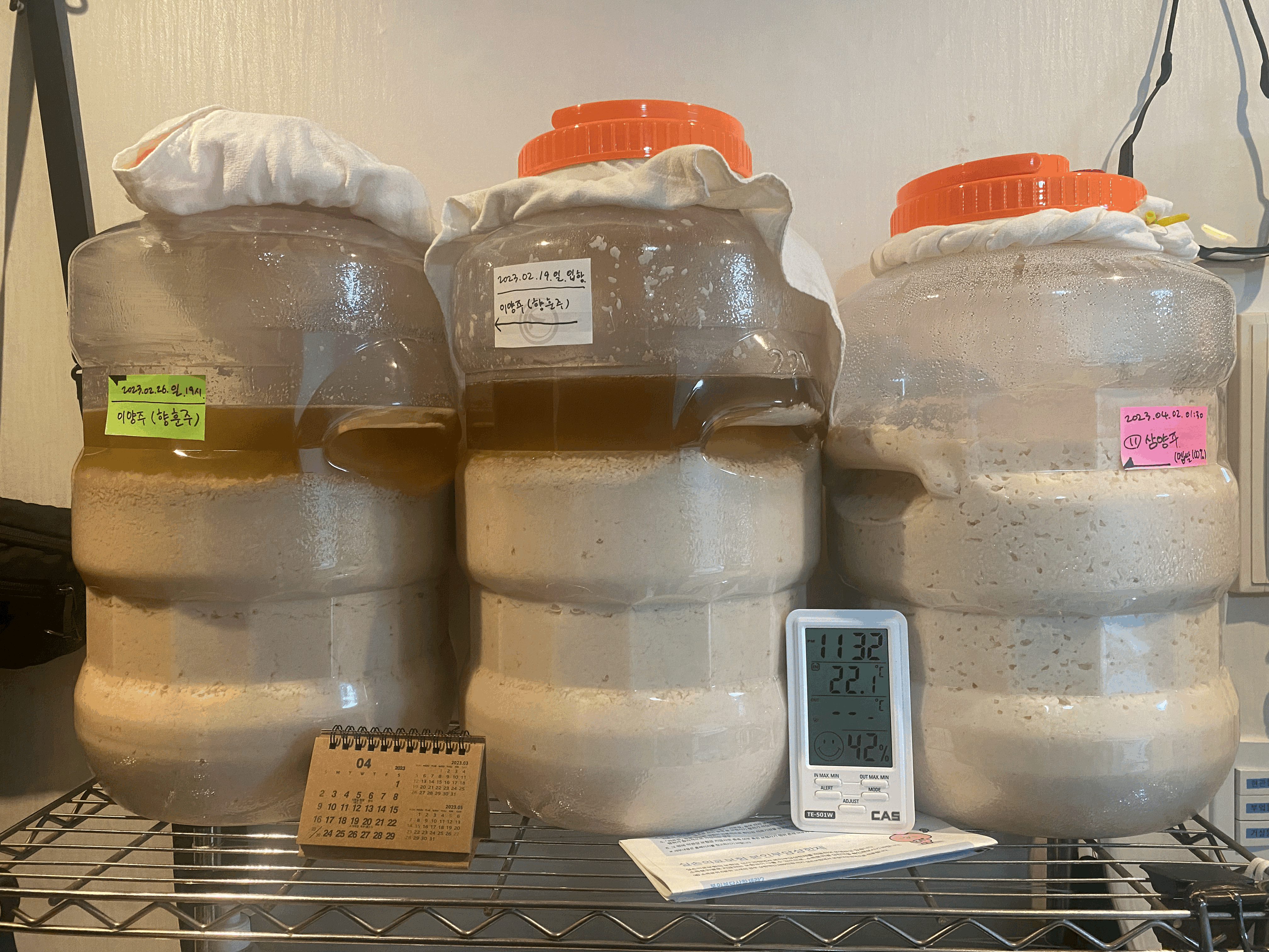 아래 사진에서 왼쪽 술독.좌=8번째 술, 중=7번째 술, 우=6번째 술 (3/25.토.11:04)