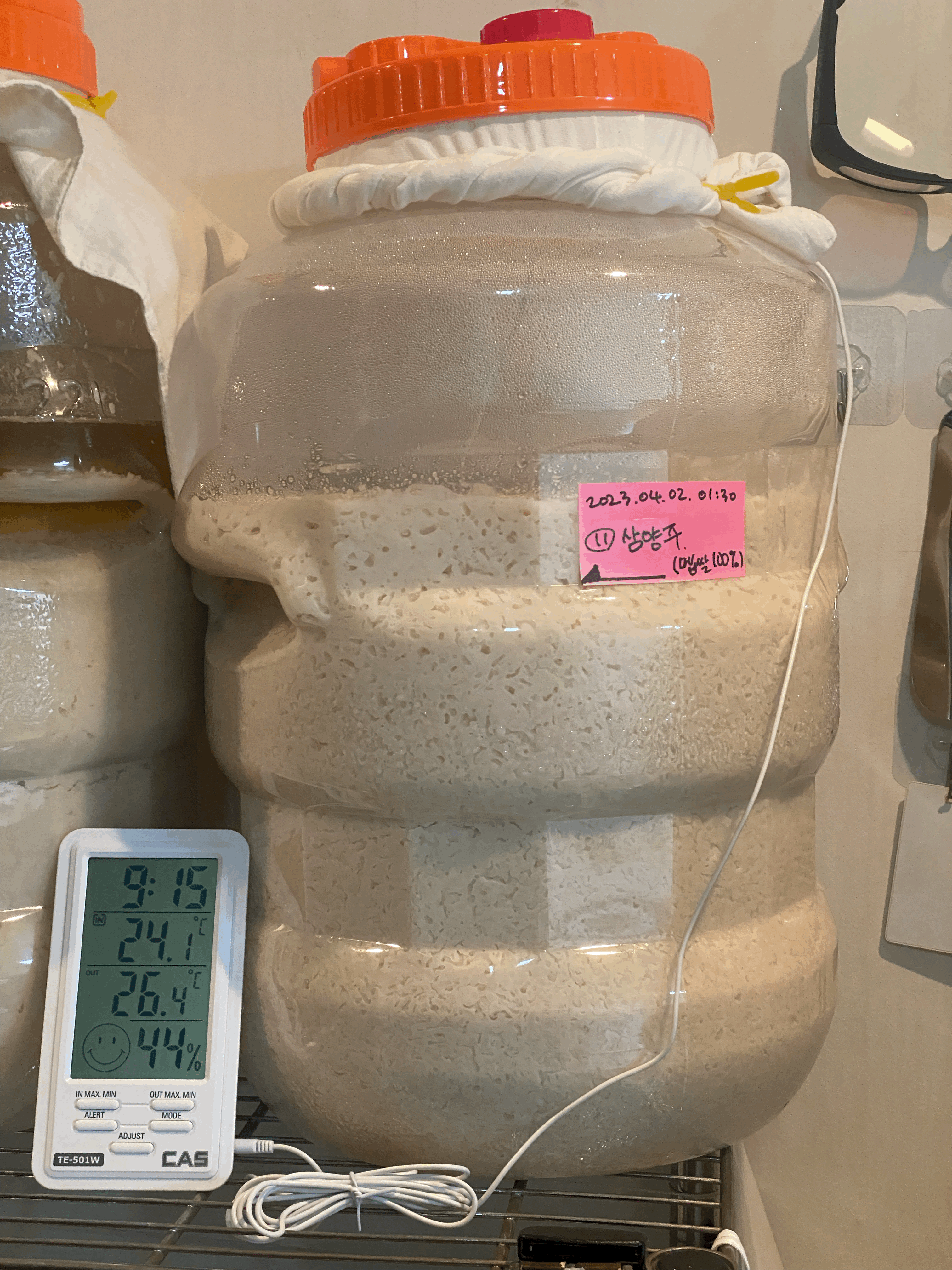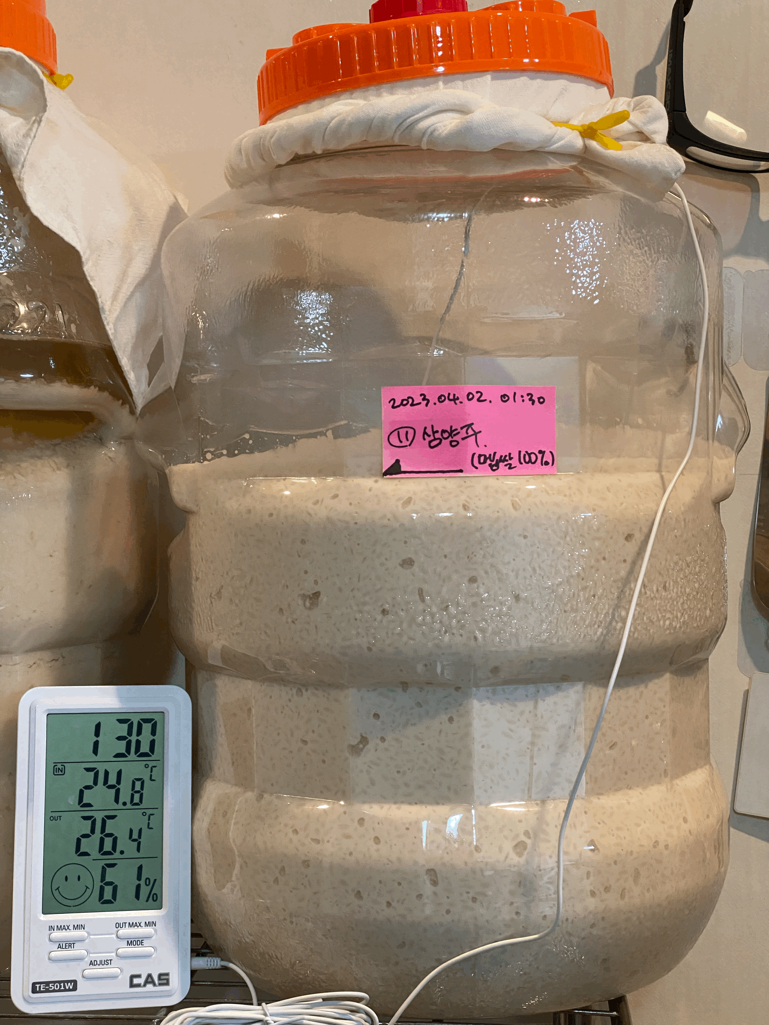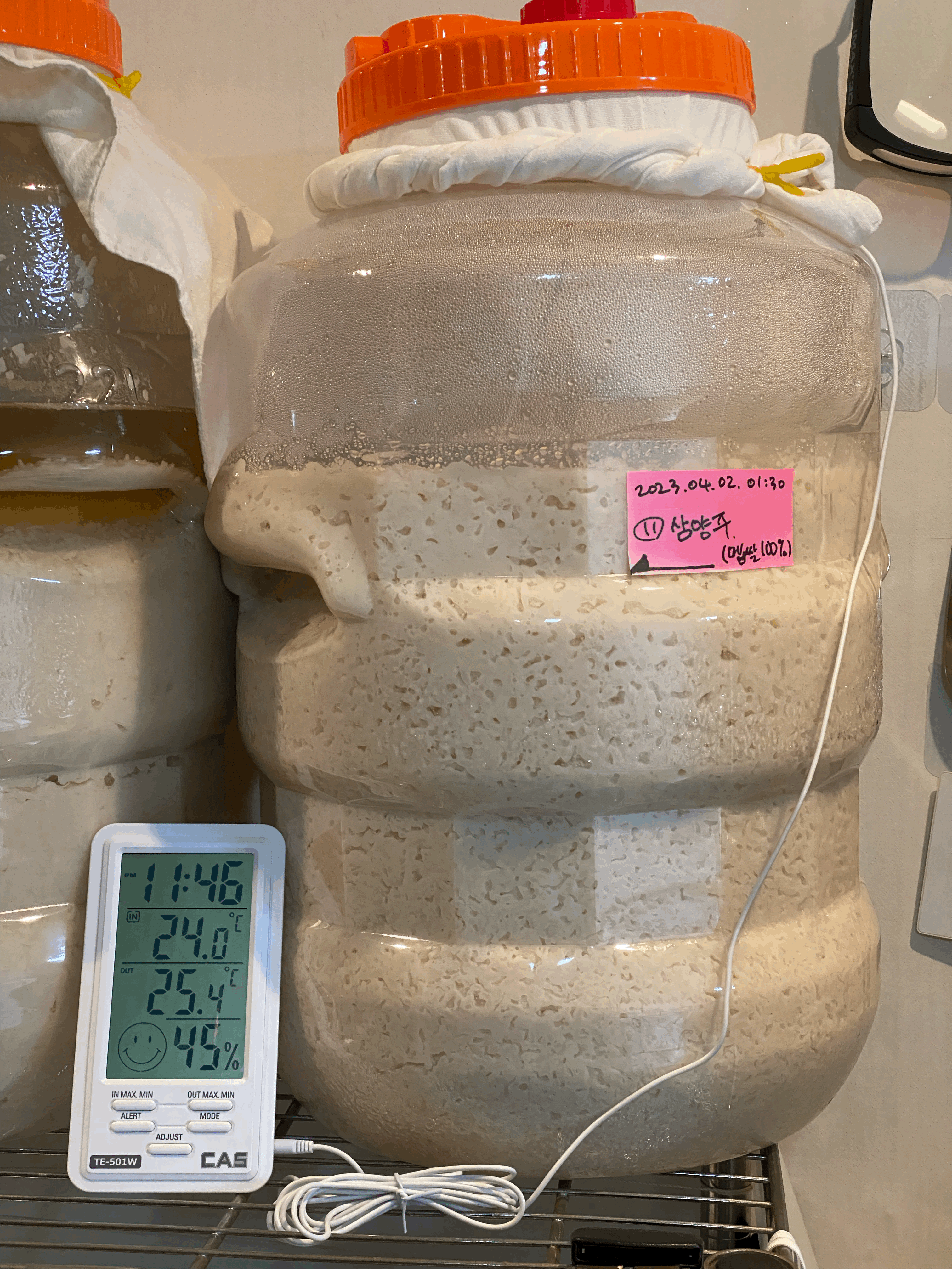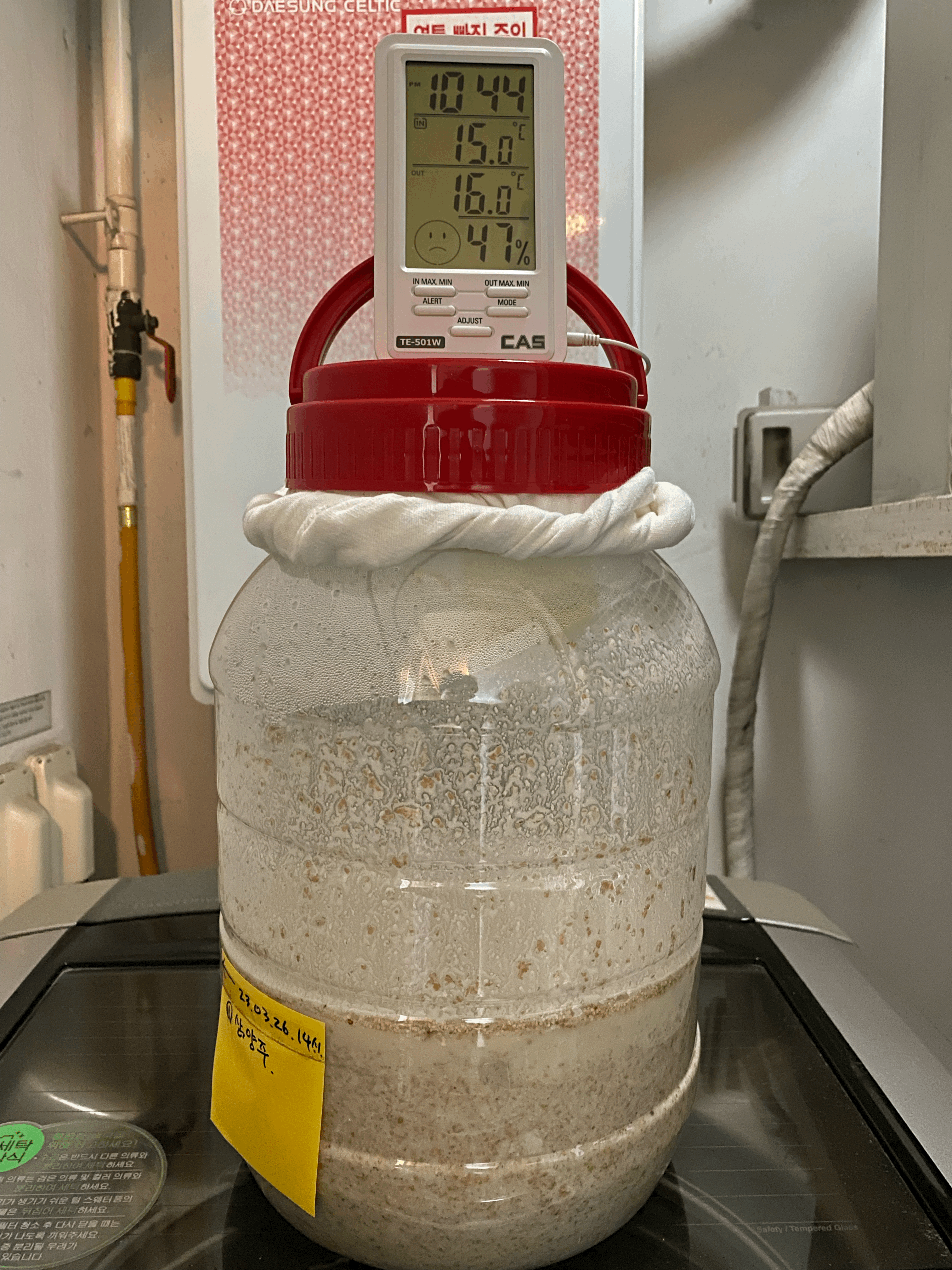 품온이 점점 내려와서 25.4도. 품온 온도계 빼고 뚜껑은 꽉 닫아 둠. 가스는 빠질 수 있도록 뚜껑 위의 보조 뚜껑만 살짝 열어 둠.(4/3.월.23:45)