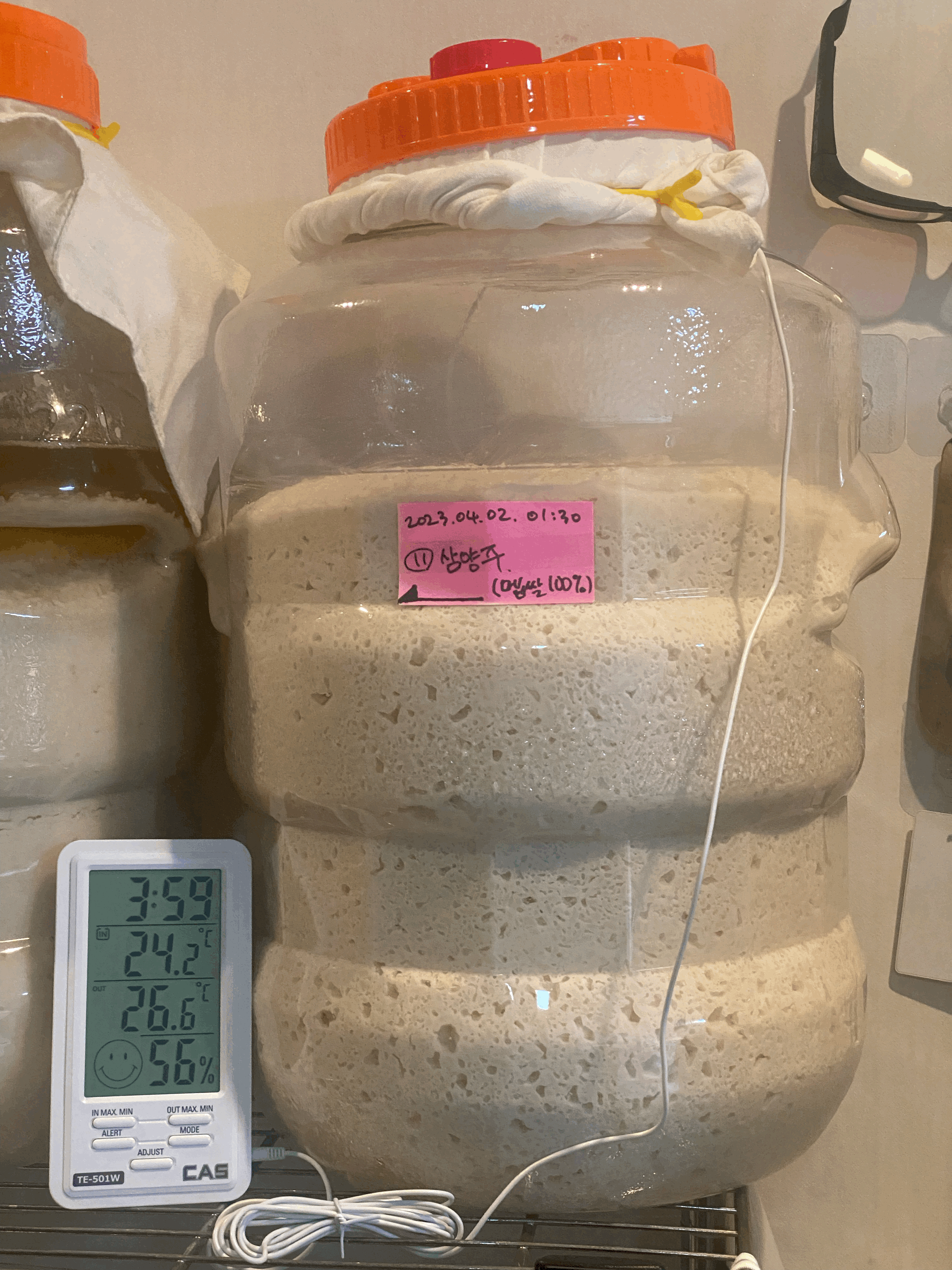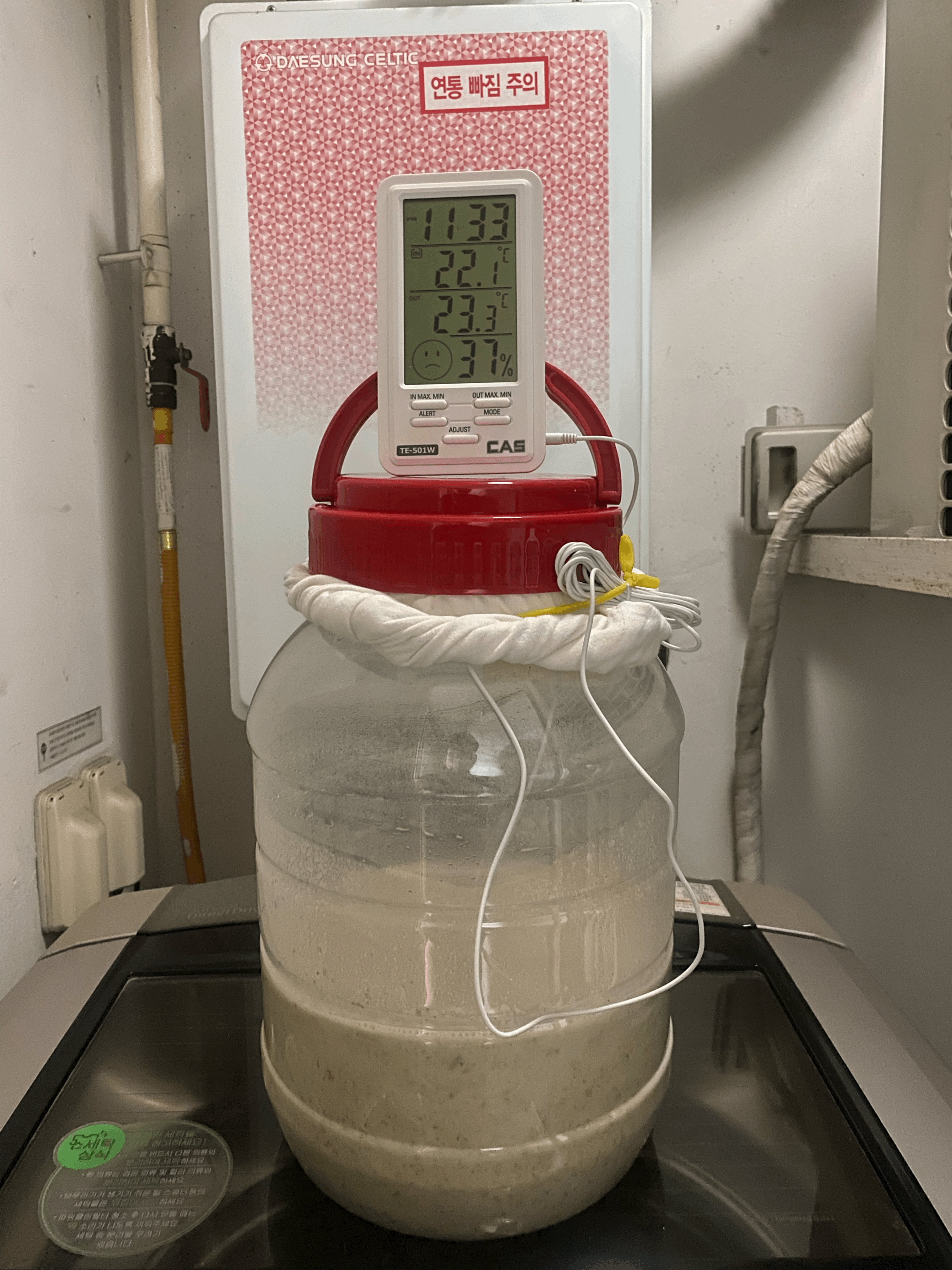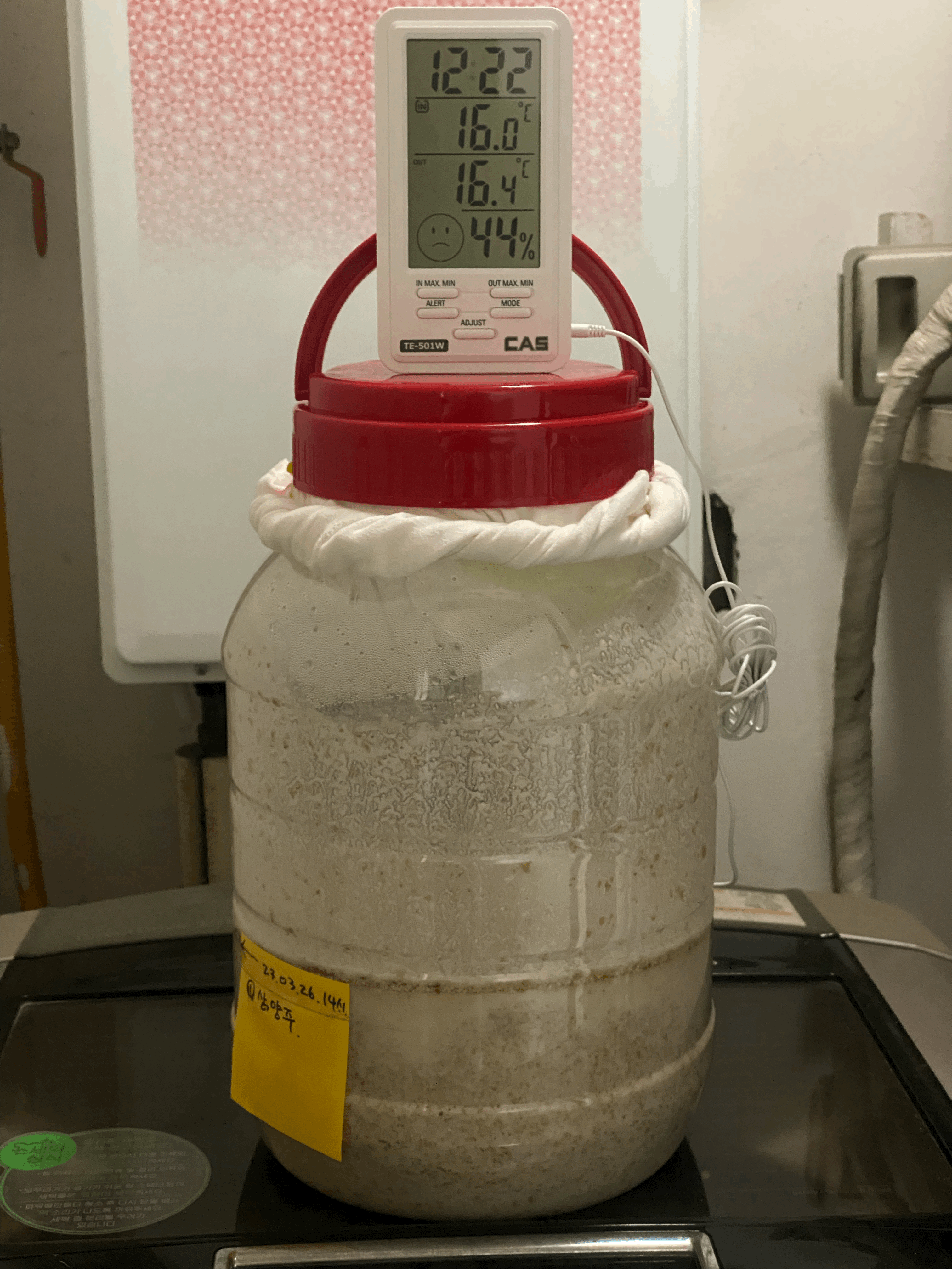품온이 점점 내려와서 25.4도. 품온 온도계 빼고 뚜껑은 꽉 닫아 둠. 가스는 빠질 수 있도록 뚜껑 위의 보조 뚜껑만 살짝 열어 둠.(4/3.월.23:45)