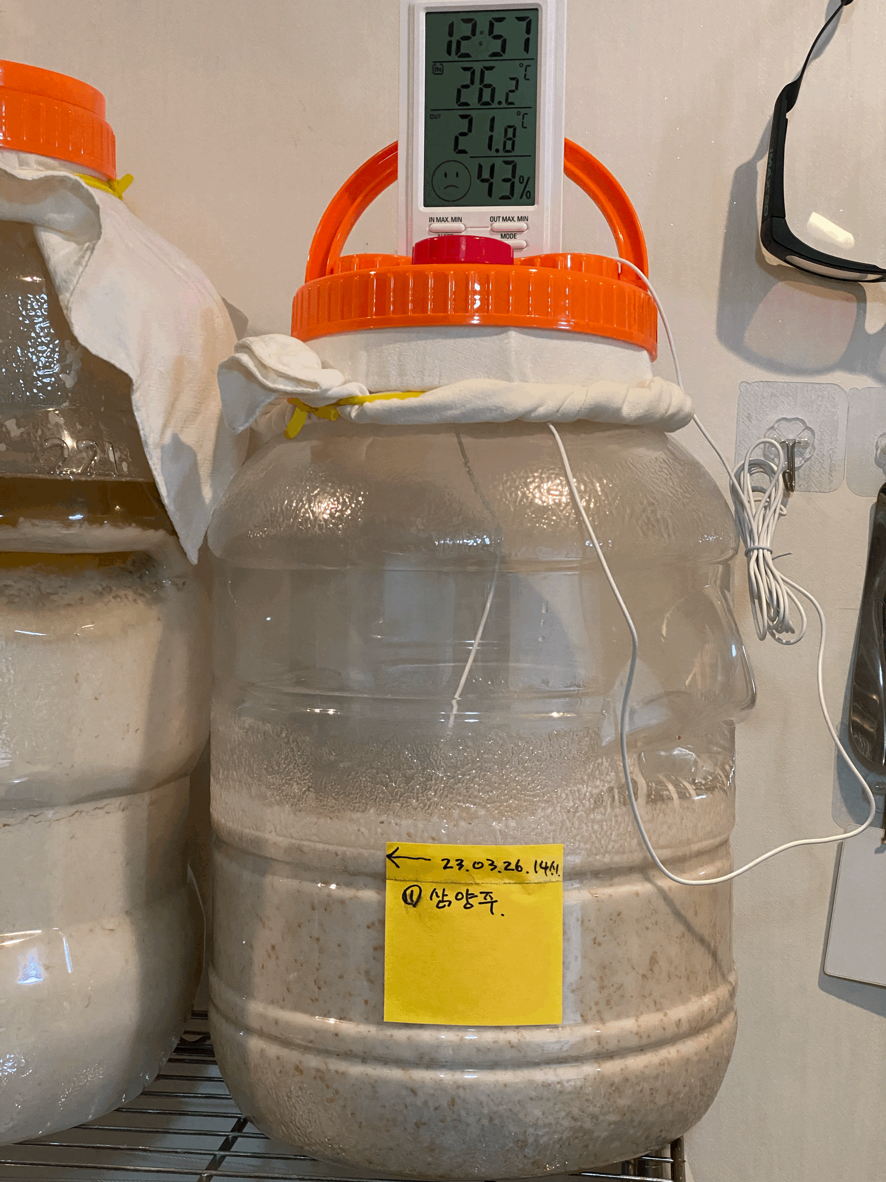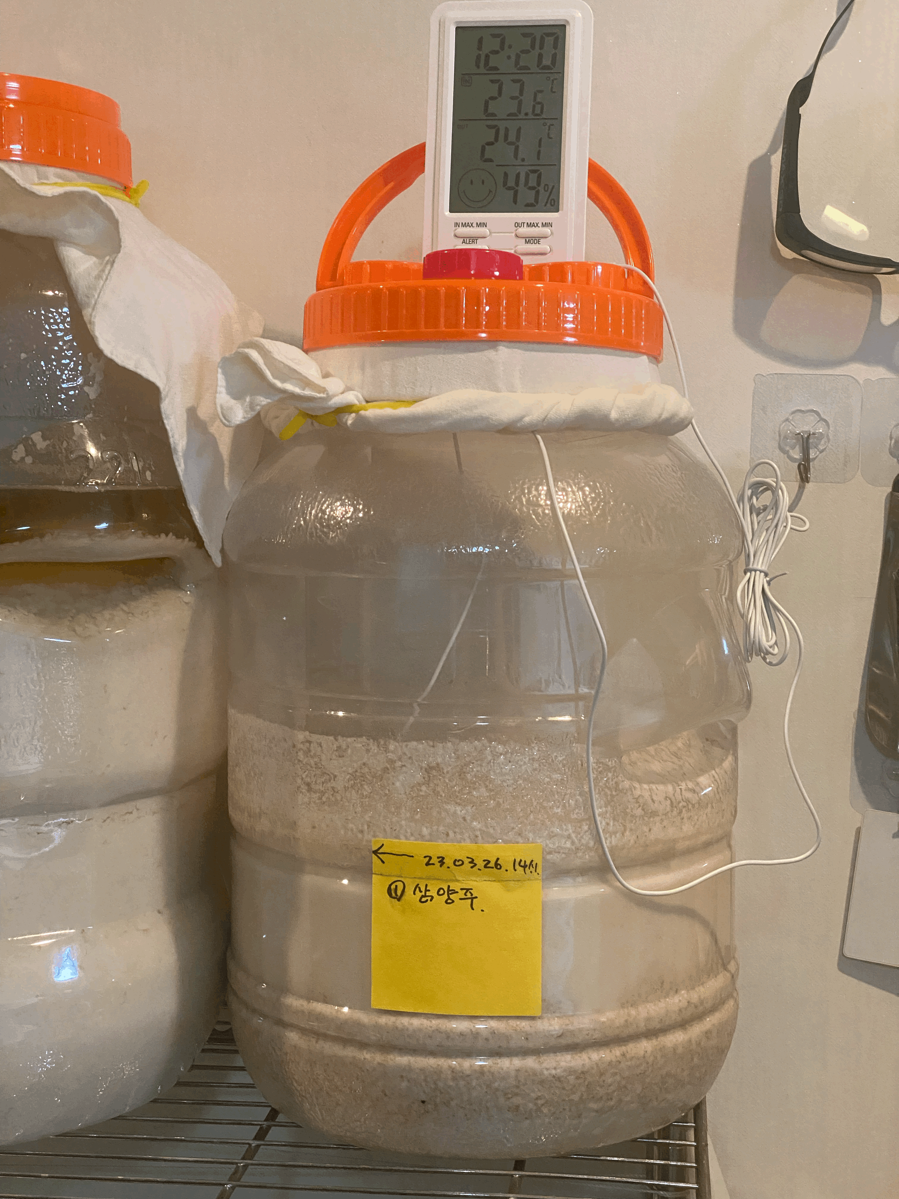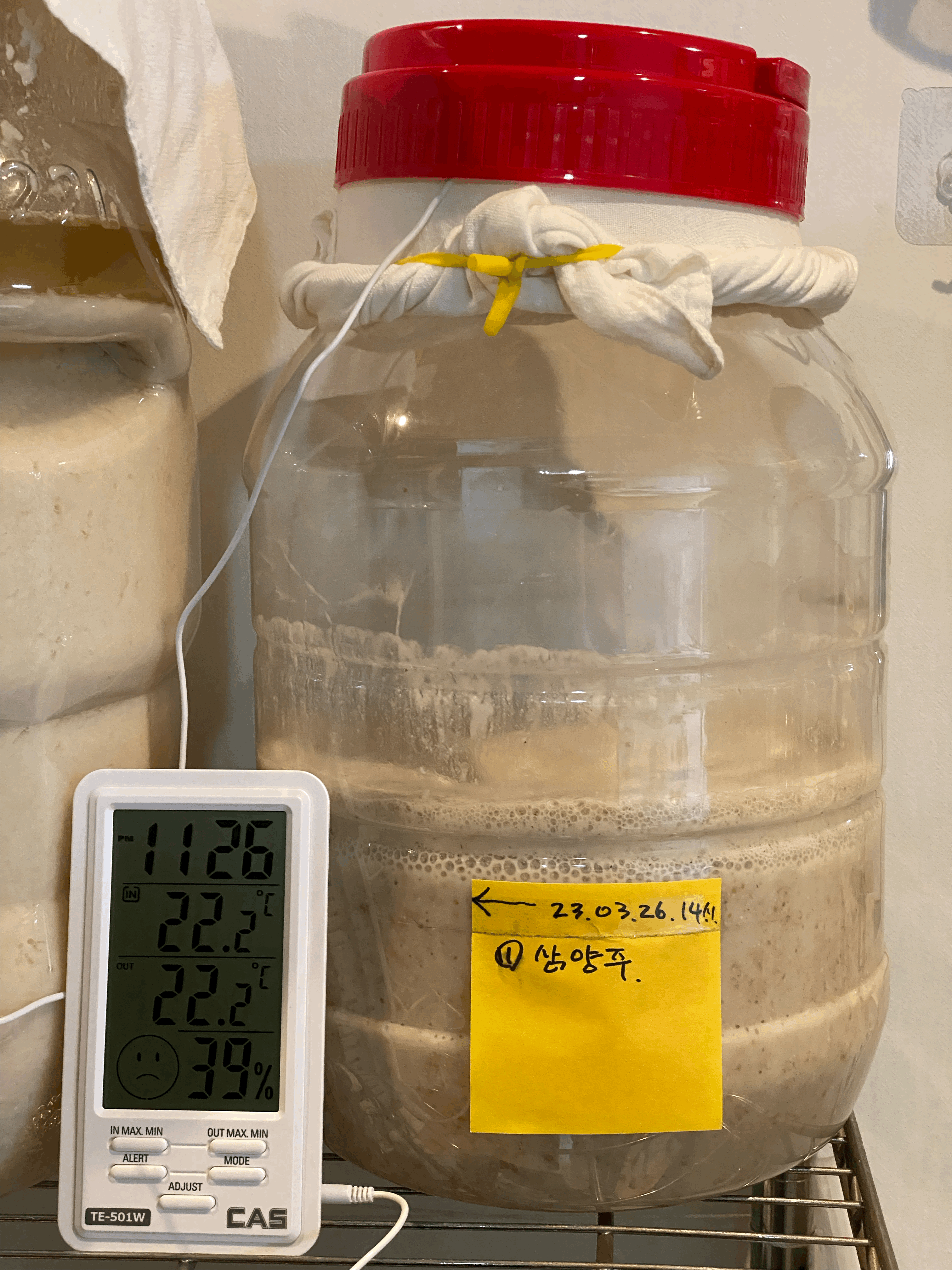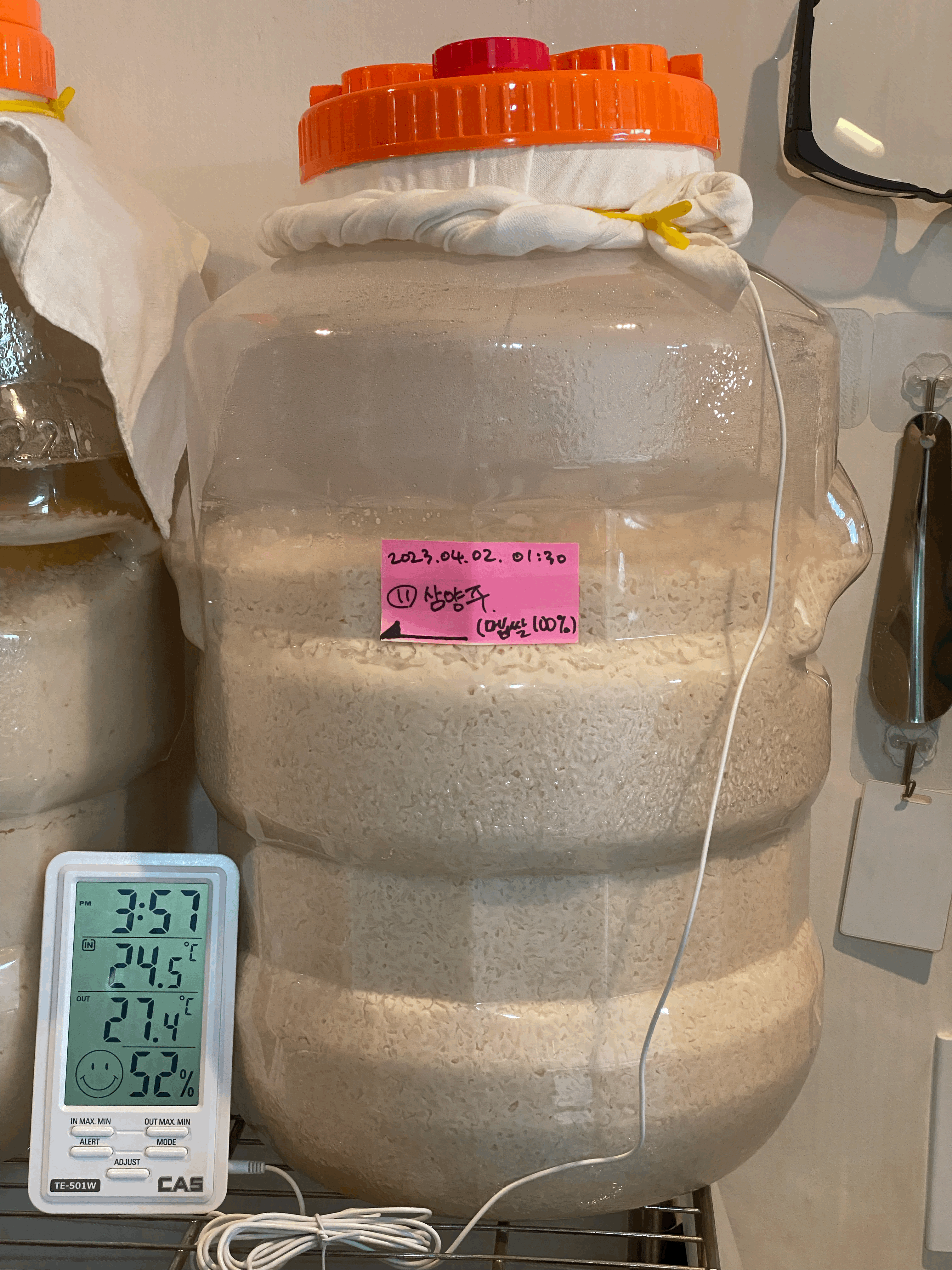 품온이 점점 내려와서 25.4도. 품온 온도계 빼고 뚜껑은 꽉 닫아 둠. 가스는 빠질 수 있도록 뚜껑 위의 보조 뚜껑만 살짝 열어 둠.(4/3.월.23:45)