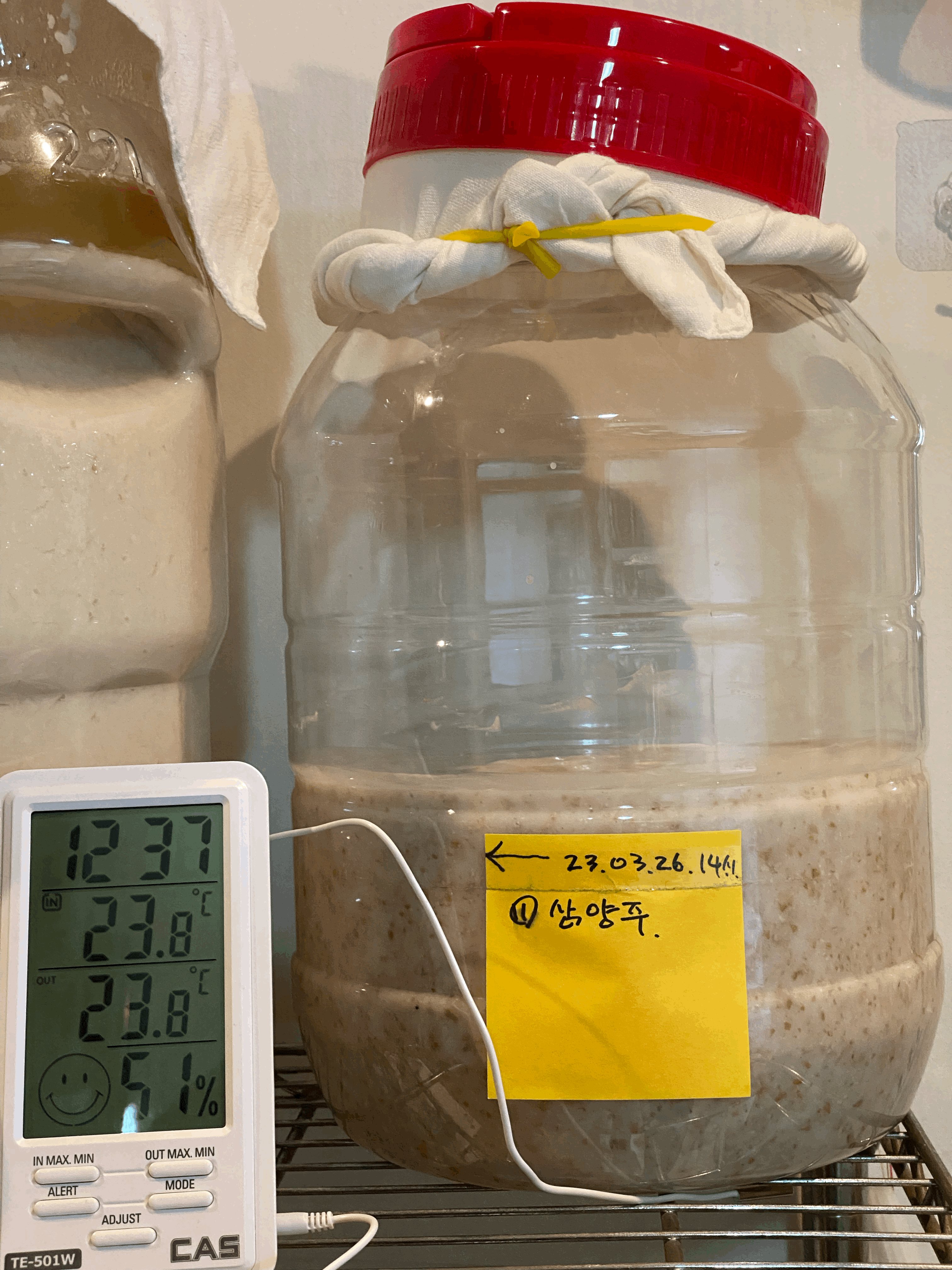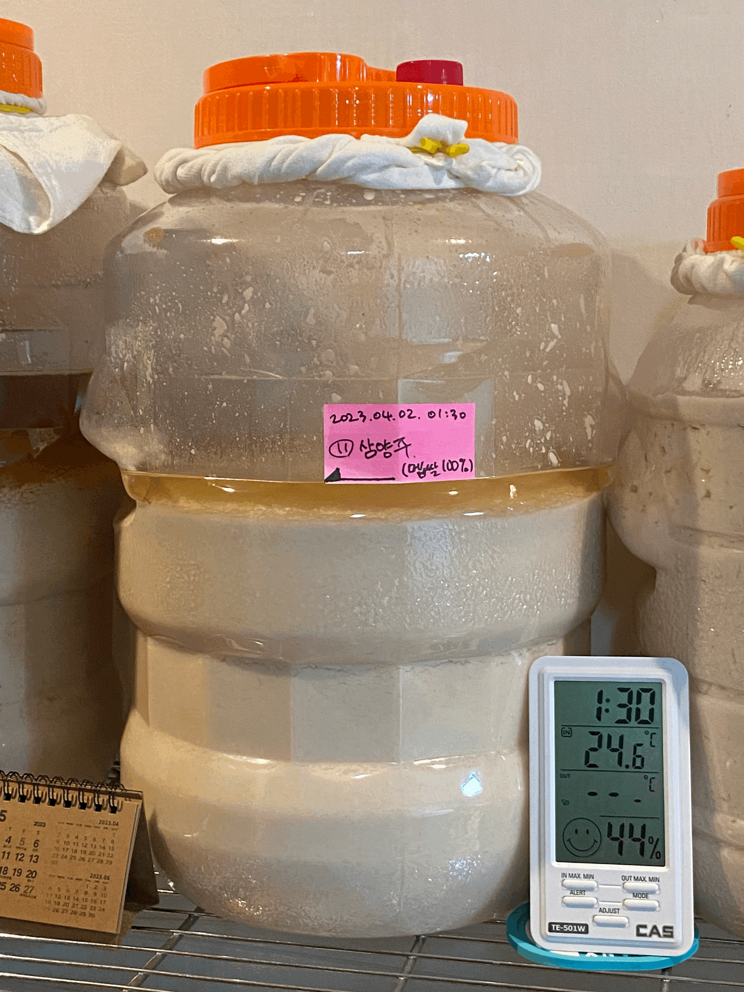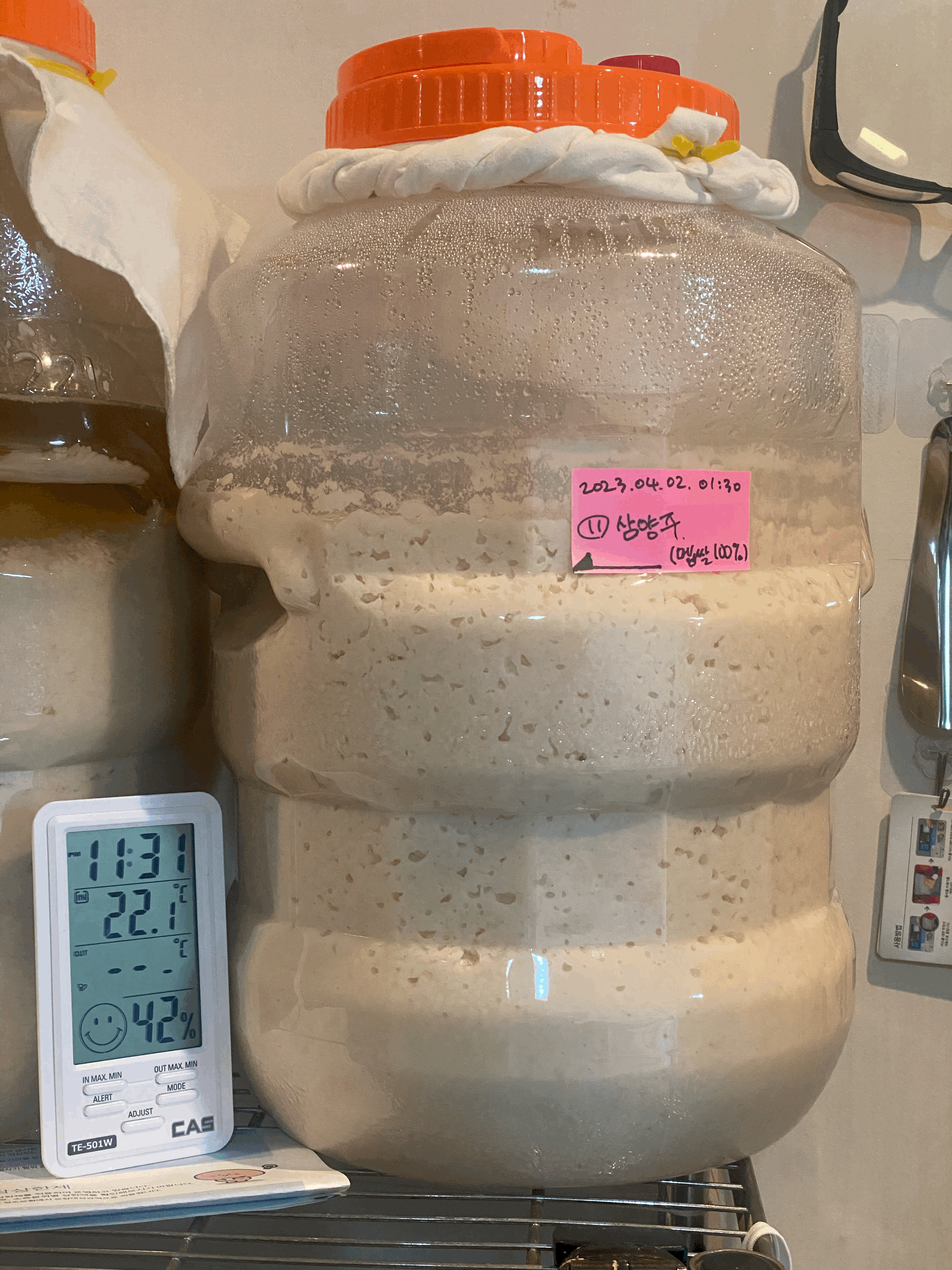 그런데, 술덧의 높이가 또 손잡이에 걸터앉을 기세라서 예전처럼 청주가 뜨고 난 이후에 뚜껑 열지 않은 채 술독을 바닥에 놓고 범퍼카 핸들 돌리듯이 좌우로 휙휙 돌려서 걸터앉은 고두밥들을 떨쳐내야겠음.(4/10.월.23:31)