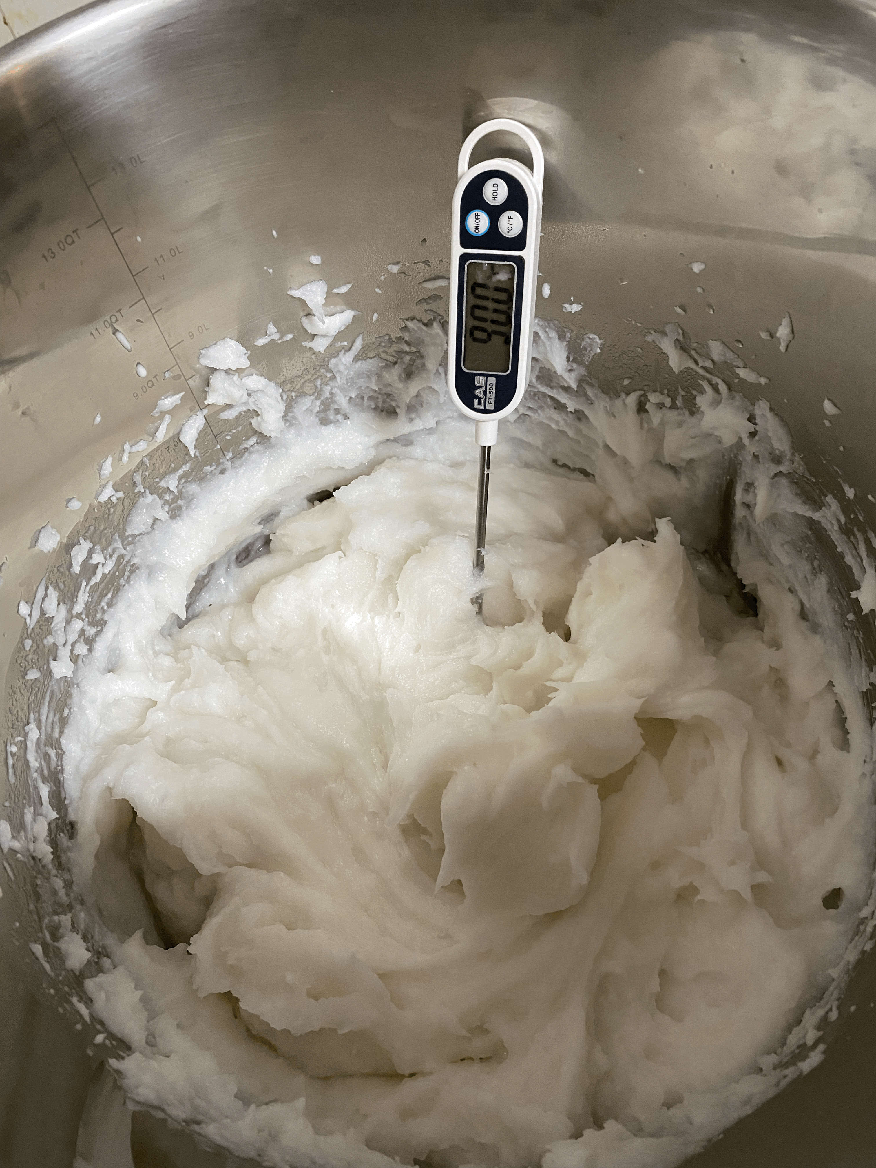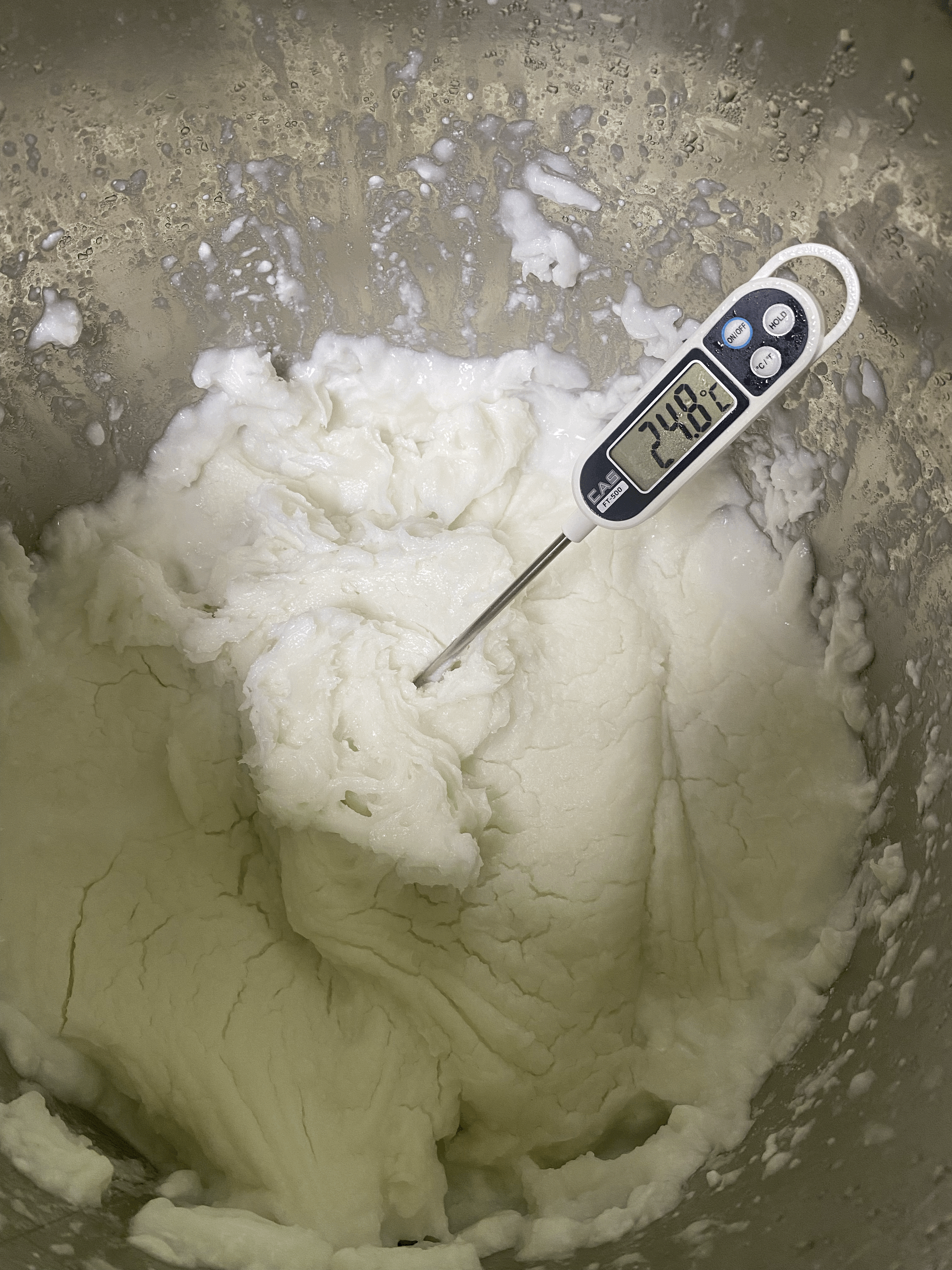 거품 소리가 나면 불을 끄고 뚜껑을 열고 전동 거품기로 다시 잘 저어줌. 가열하기 전 보다 더 호화되어 범벅의 점도가 더 높아짐.