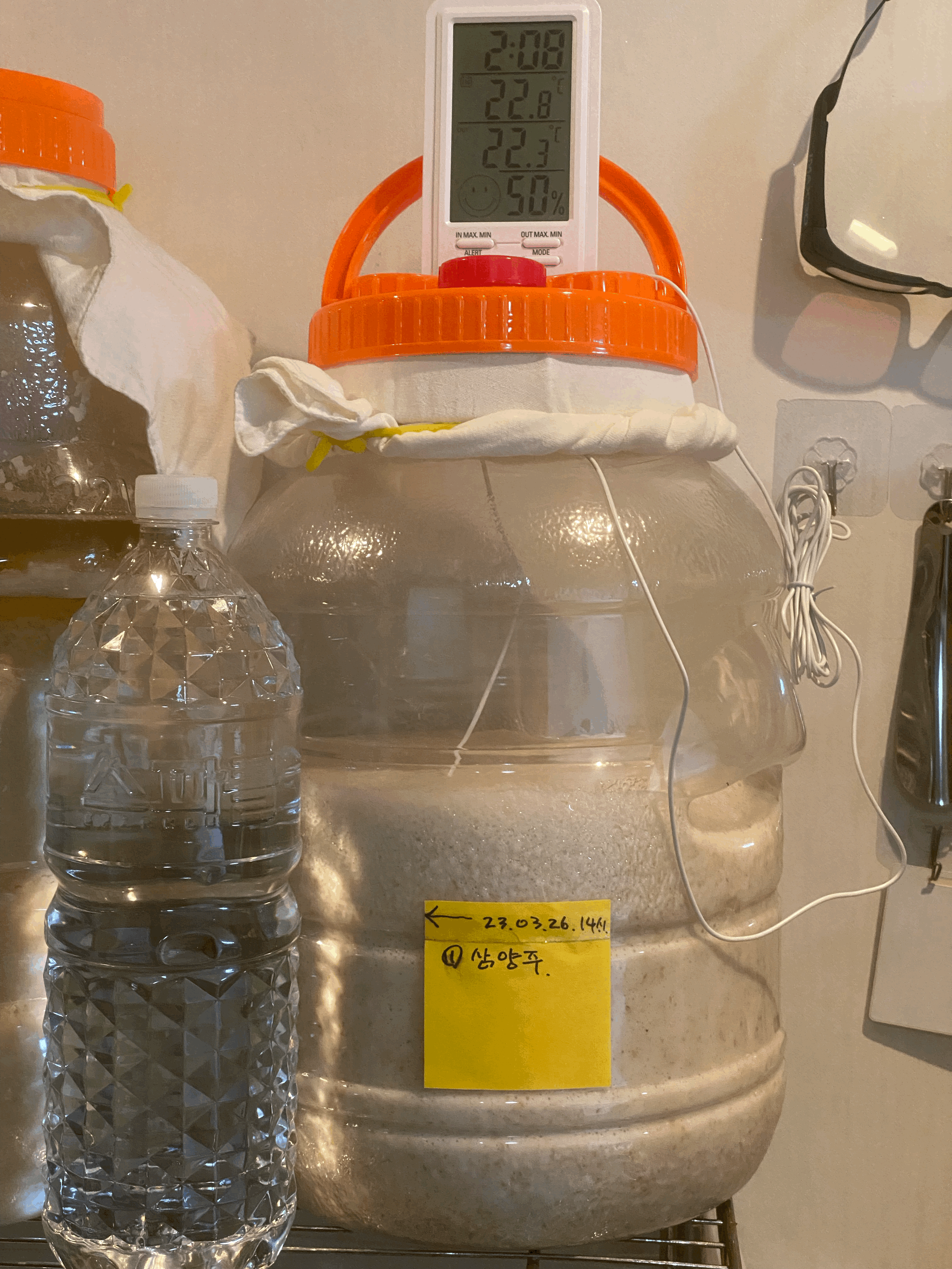 잘 치댄 술덧을 20L 페트병 술독에 담음. 넷플릭스 보면서 45분 정도 치댄 것 같음. 분홍색 포스트잇 하단에 표시한 화살표가 술덧의 처음 높이. 술을 치대서 술독에 넣고나서 잠시 몇 분간 뒷처리 하는 도중에 술덧이 가운데부터 봉긋하게 부풀어 오름.