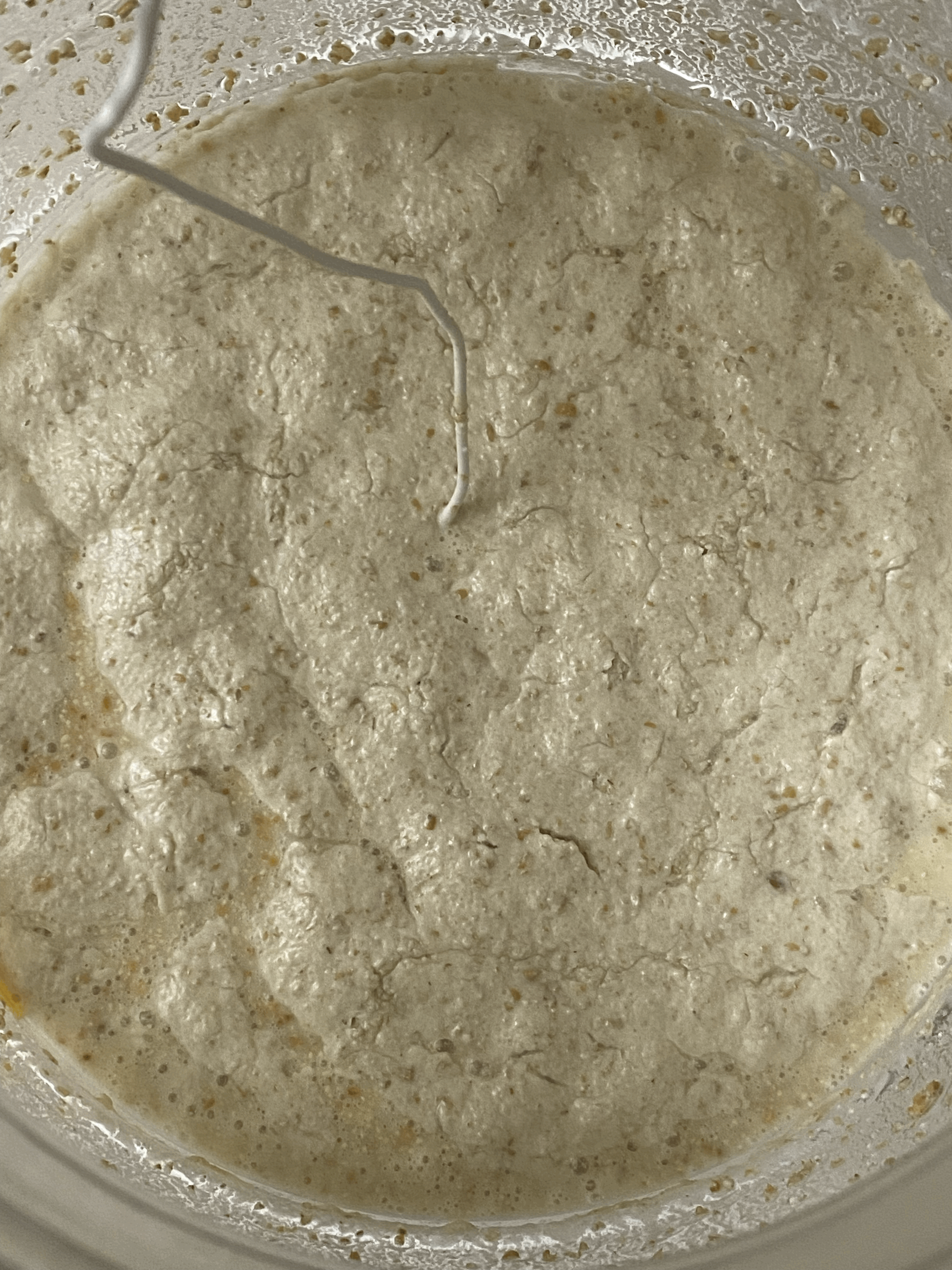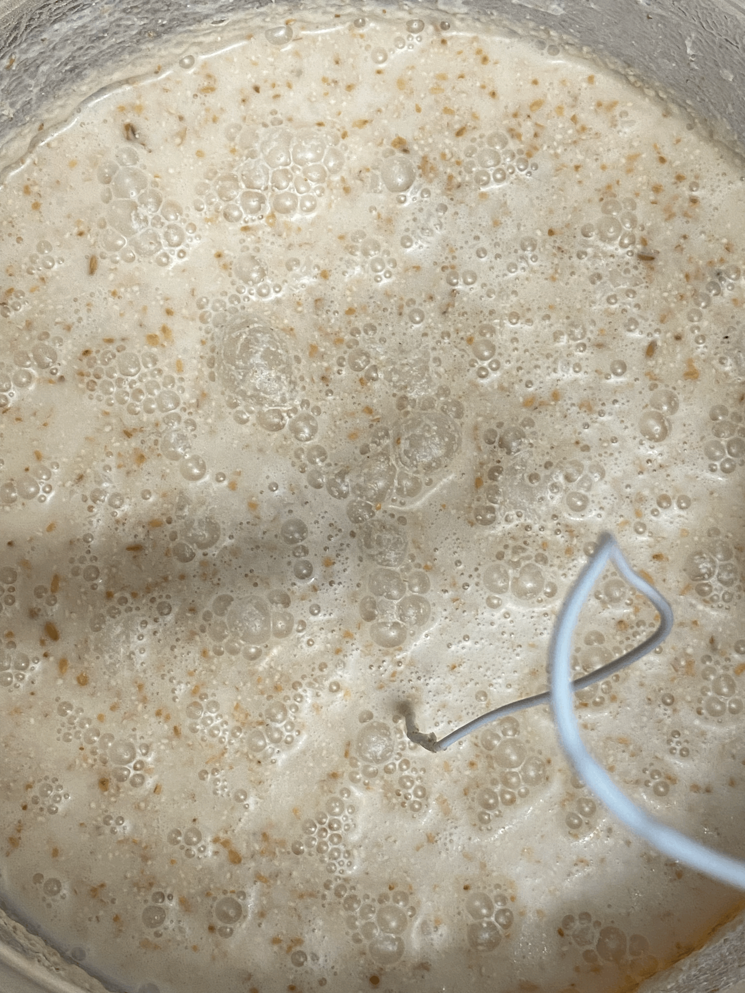 효모 증식을 위해 술덧을 소독한 주걱으로 저어주려고 확인해보니 아침보다 더 묽어졌고, 아침의 술덧 부피 대비 끓었다 다시 내려온 흔적이 있음.
