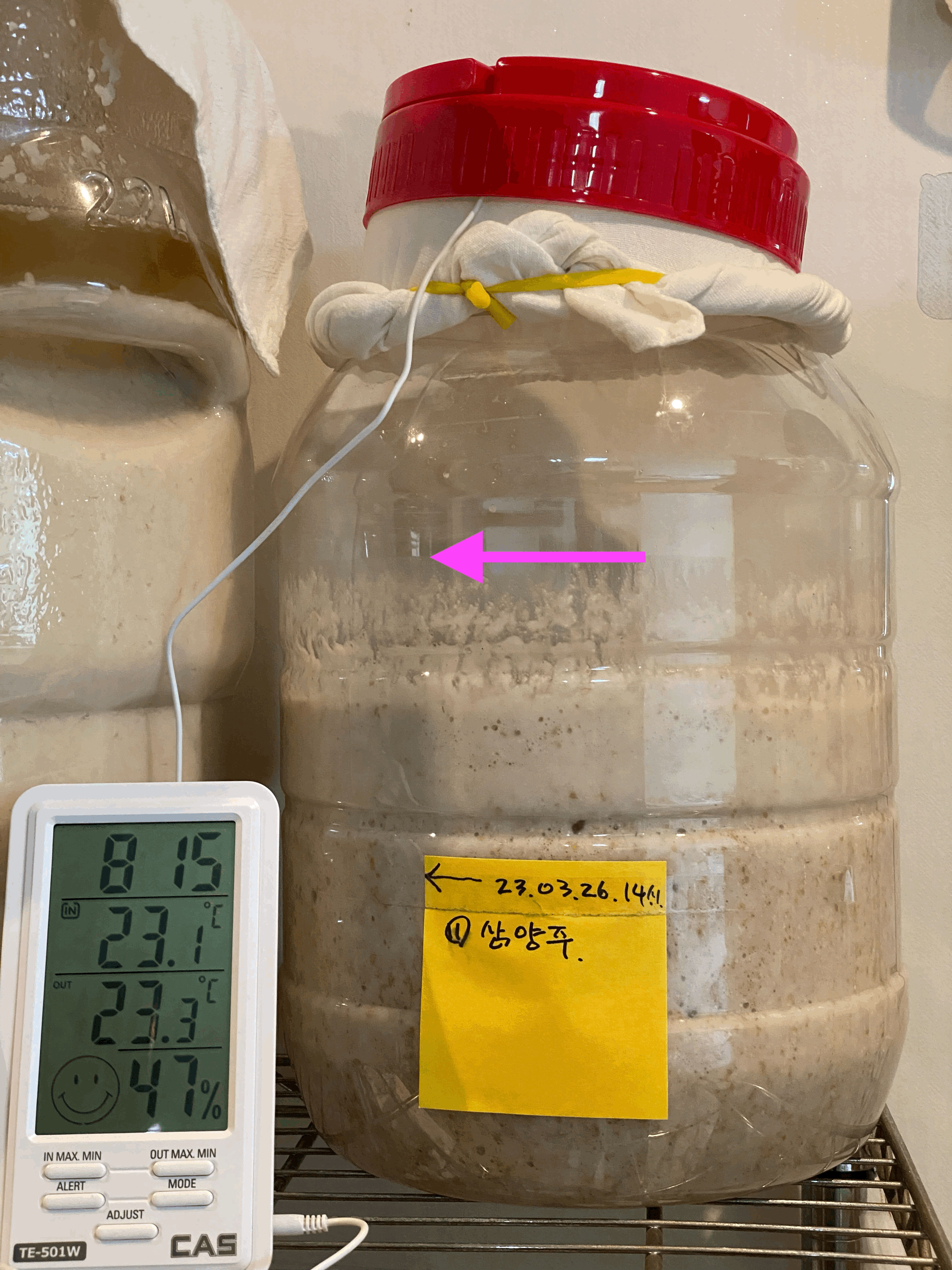 효모 증식을 위해 술덧을 소독한 주걱으로 저어주려고 확인해보니 8시간 전 보다 더 묽어졌고, 초기 술덧 부피 대비 100% 가량 끓었다 내려온 흔적이 있음. 옆면을 살펴보니 잔 기포가 꽤 많음. 맛을 보니 단맛이 조금 있고, 쓴맛이나 신맛은 아직 없고, 구수한 곡물향이 남. 계속 저어주고 뚜껑도 살짝만 덮어둔 상태라 호기성 발효를 진행하면서 효모가 대량증식중인 것으로 추정함. 이번 술빚기의 밑술 발효 초반에는 효모 증식에 초점을 맞출 예정.술덧을 저어주기 전에 확인했을 때 화살표 지점이 끓어올랐던 자국의 정점.(3/27.월.08:15)