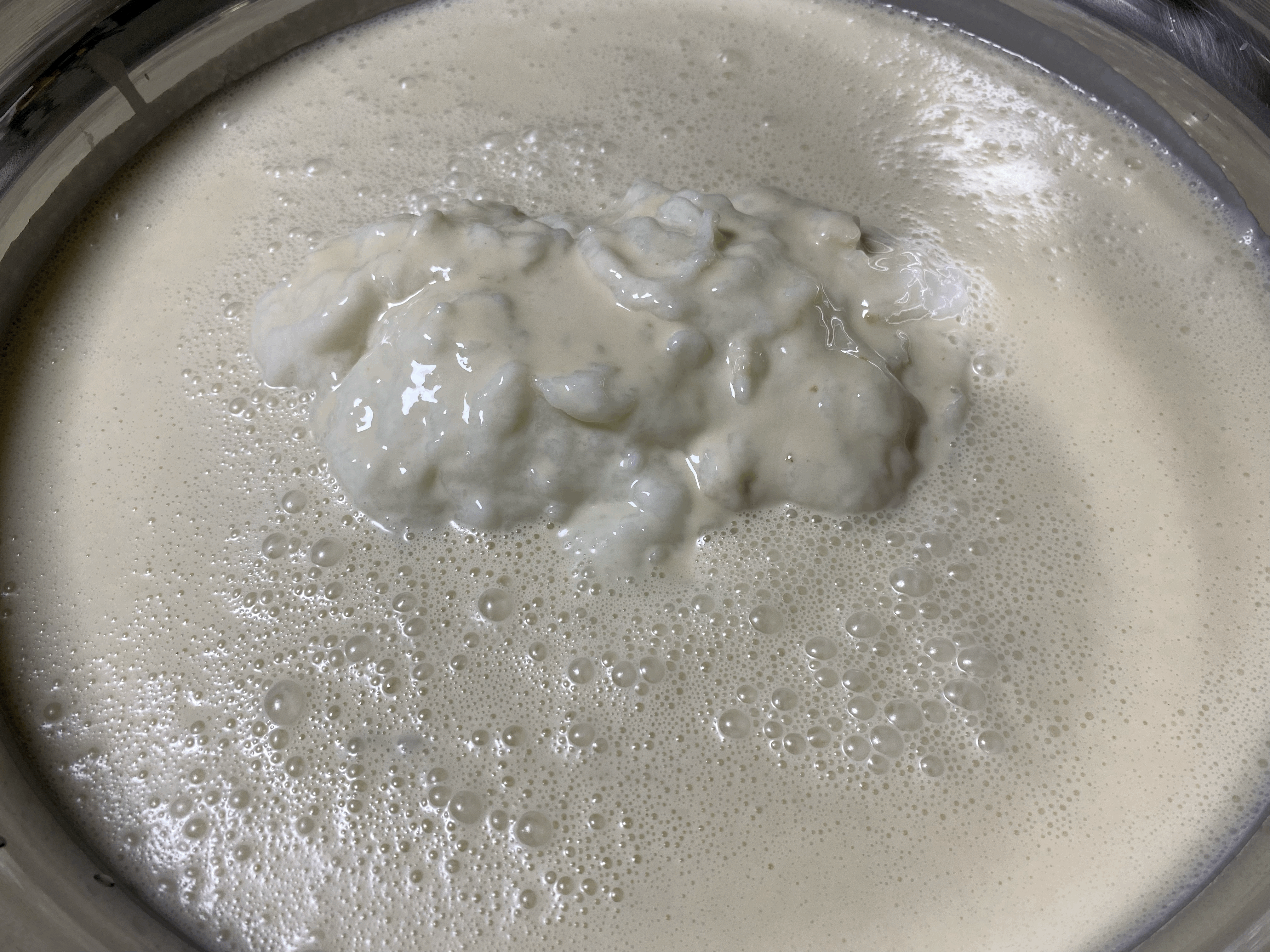 - 저어주려고 확인해 보니 끓어오르긴 했지만, 술덧의 점도가 아직 많이 묽은 상태는 아니라 술덧 내부에 생성된 기포가 술덧 내부에 주로 머물러 있어 표면의 기포는 드문드문 보일 뿐임.