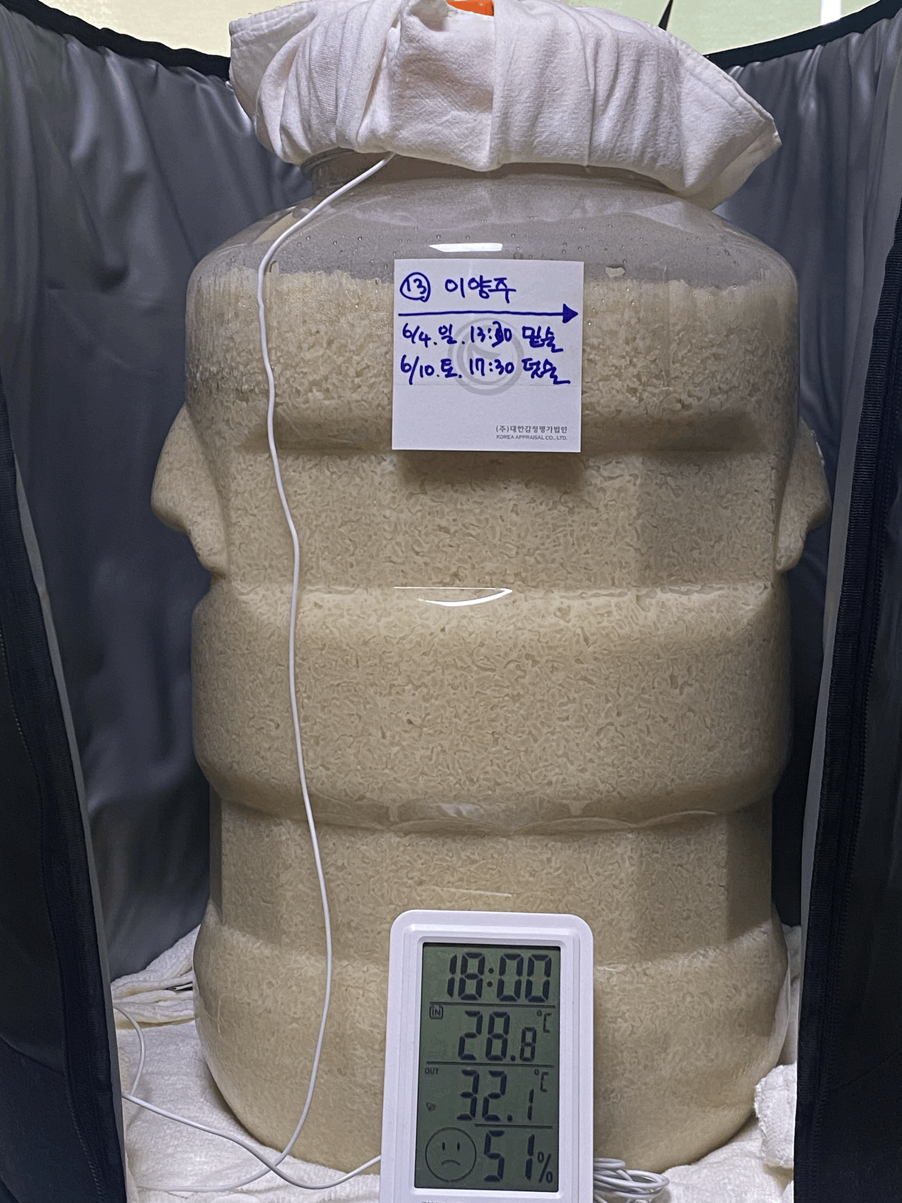 - 지난주에 비해 고두밥이 찔끔 더 가라앉았다. 가라앉아있는 고두밥 위층의 색이 점점 회색빛이 돌면서 어두워지고 있는 것이 보인다. 그 외 다른 변화는 잘 모르겠다. 실내 온도는 주로 28~30도를 유지하고 있으며, 환기를 시키거나 에어컨 급속냉방 등의 사유로 이 범위를 벗어날 때도 있다. 며칠 전에 장마가 끝나서 기온이 점점 올라가는 중이라 이젠 냉방을 하지 않을 때 30도를 넘길 때도 있을 것 같다.