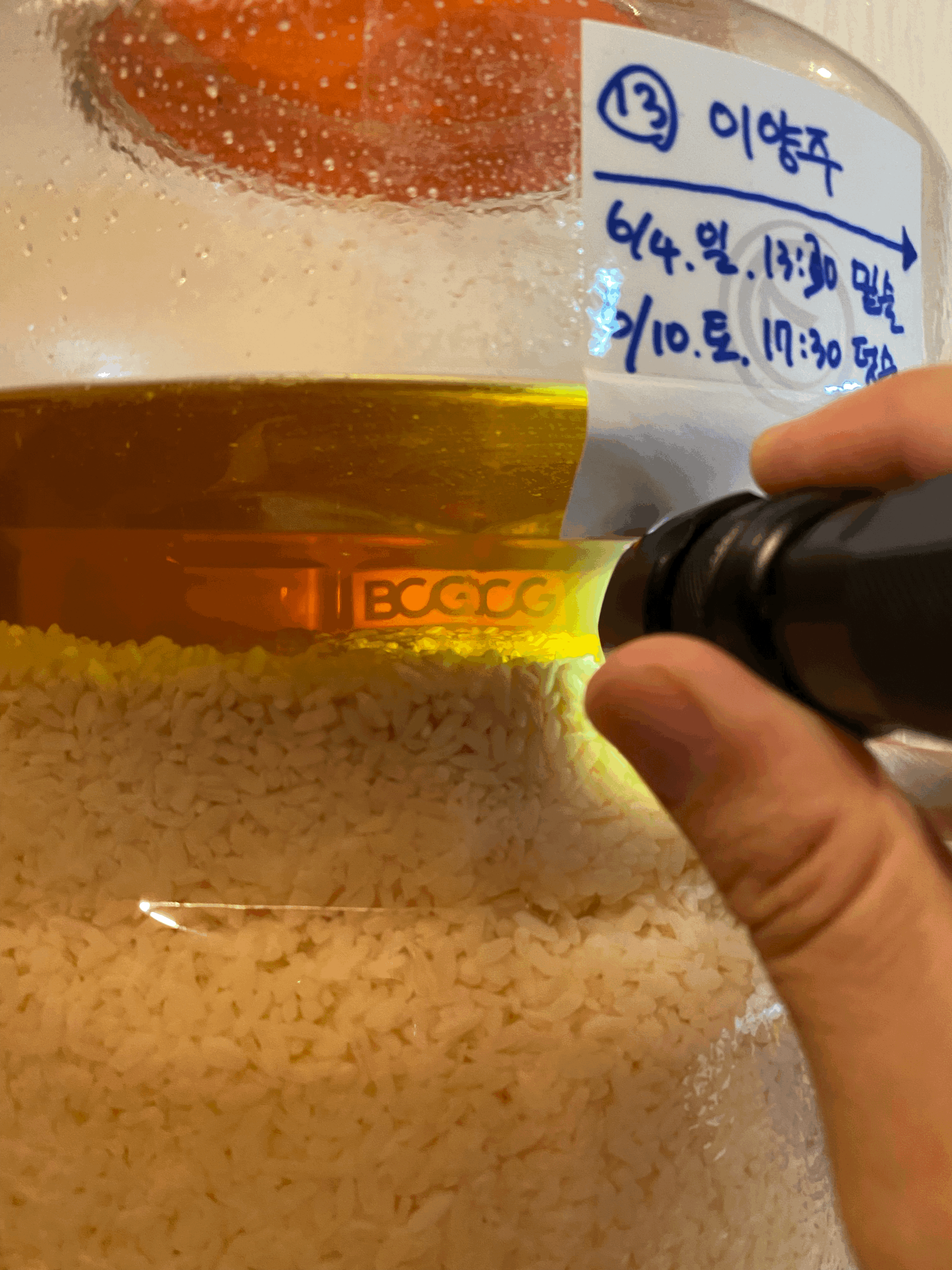- 그런데, 자세히 보면 뿌옇던 청주가 꽤 맑아졌길래 술독 뒤편에 BCG라는 글자가 보이도록 테이프로 붙여놓고 청주 너머로 보이는 BCG 글자를 폰카로 찍어봤다. 술독 너머의 글자가 보일 정도니 꽤 맑다고 볼 수 있겠다.
