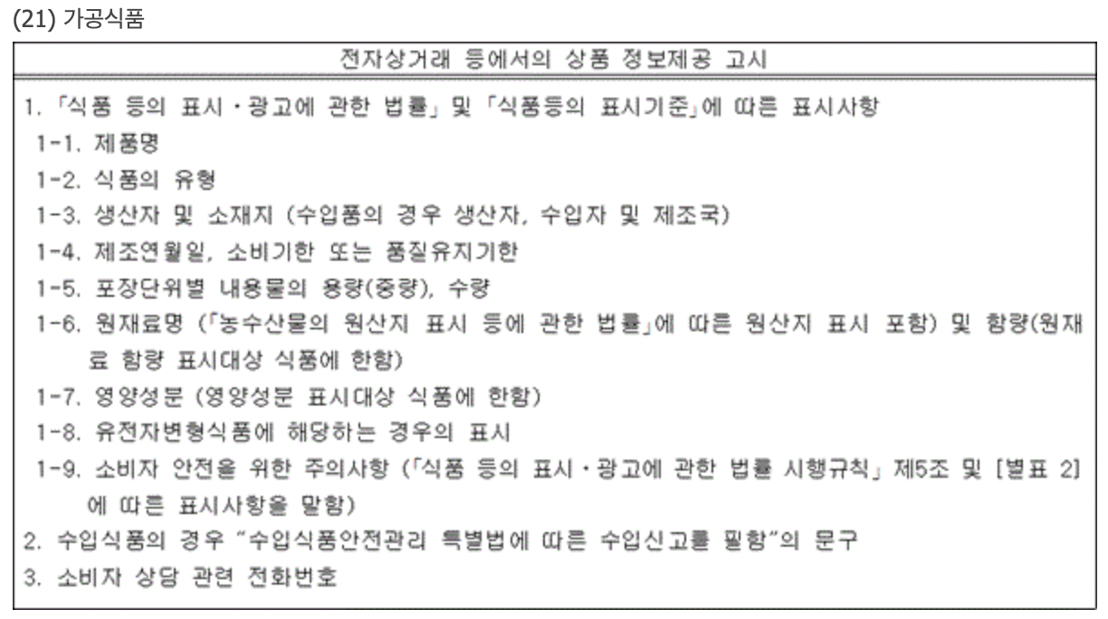 고시: https://www.law.go.kr/행정규칙/전자상거래등에서의상품등의정보제공에관한고시 - 맨> 이 고시의 '(21) 가공식품'에서 정하고 있군요.