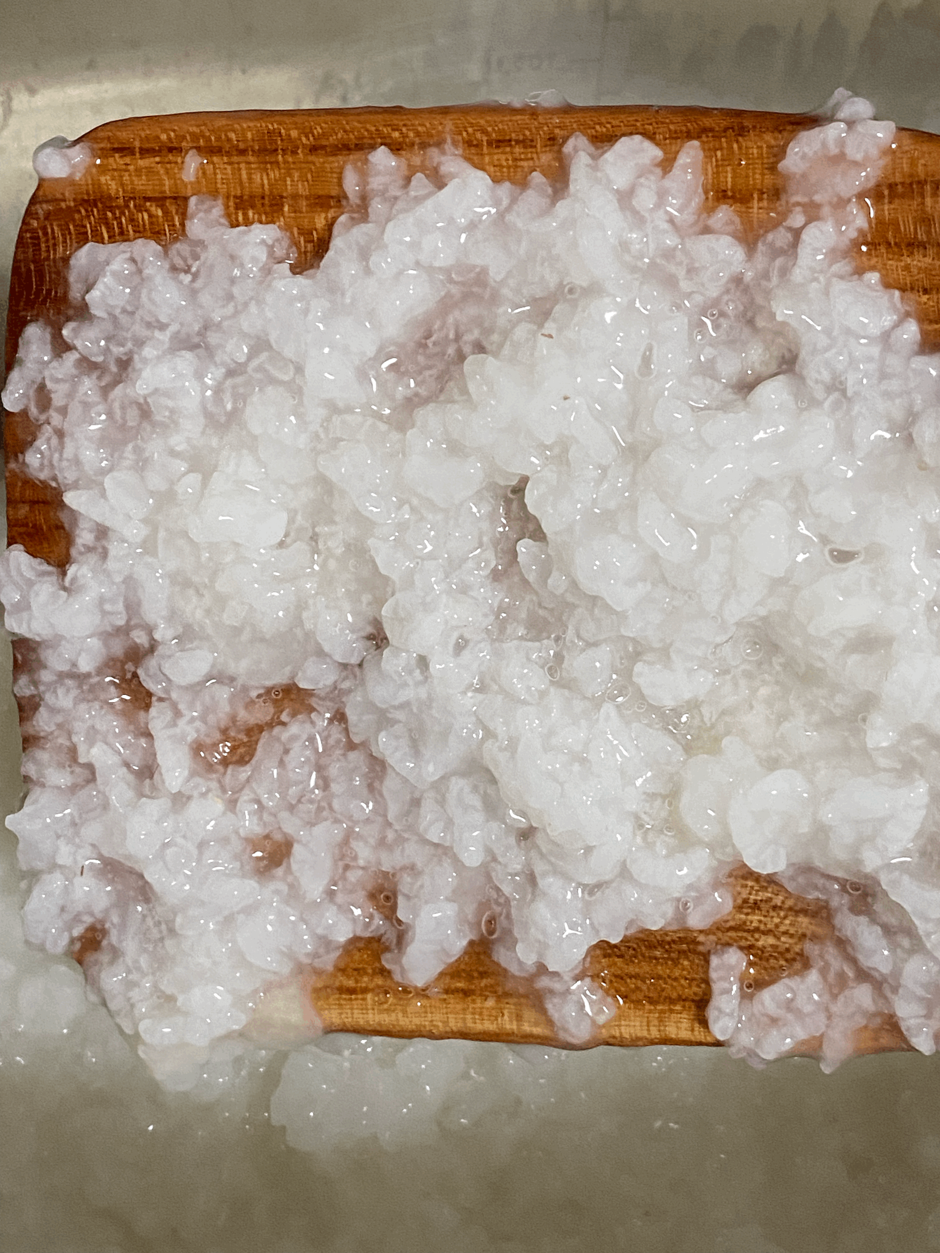 - 통쌀죽을 다 끓이면 수분을 잃지 않도록 곰솥을 비닐로 밀봉하고 반나절 동안 실내에서 뜸들이면서 전분이 더 이상 호화되지 않는 50℃ 이하까지 식힌다.