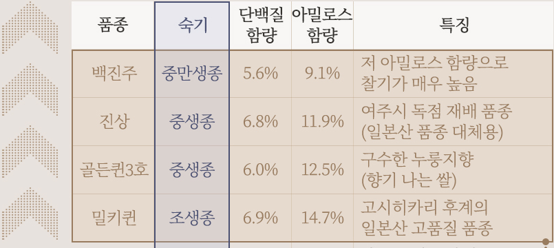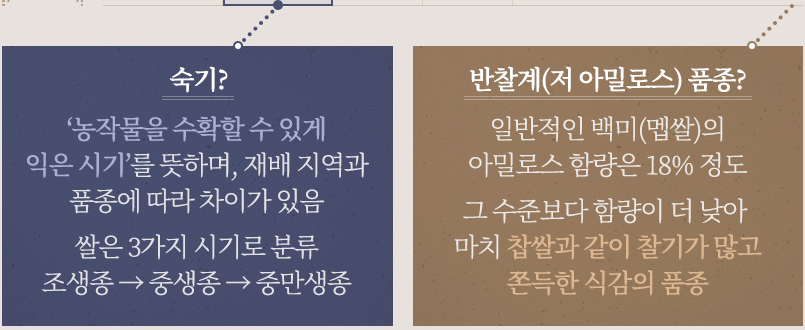 이 중에서도 아밀로스 함량이 더 적은 백진주는 반찰 중에서도 찹쌀에 가깝고, 밀키퀸은 반찰 중에서도 멥쌀에 가깝다고 보면 되겠다.