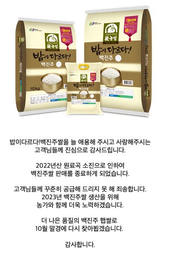 '저 아밀로스' 멥쌀 중 아밀로스 함량이 9.1%, 단백질 함량 5.%로 가장 낮은 백진주쌀을 전략적으로 육성하는 안동농협의 경우 올해 햅쌀 출하 일정이 어떻게 되나 전화해서 물어보니 10월 27일 경으로 예정되어 있단다.