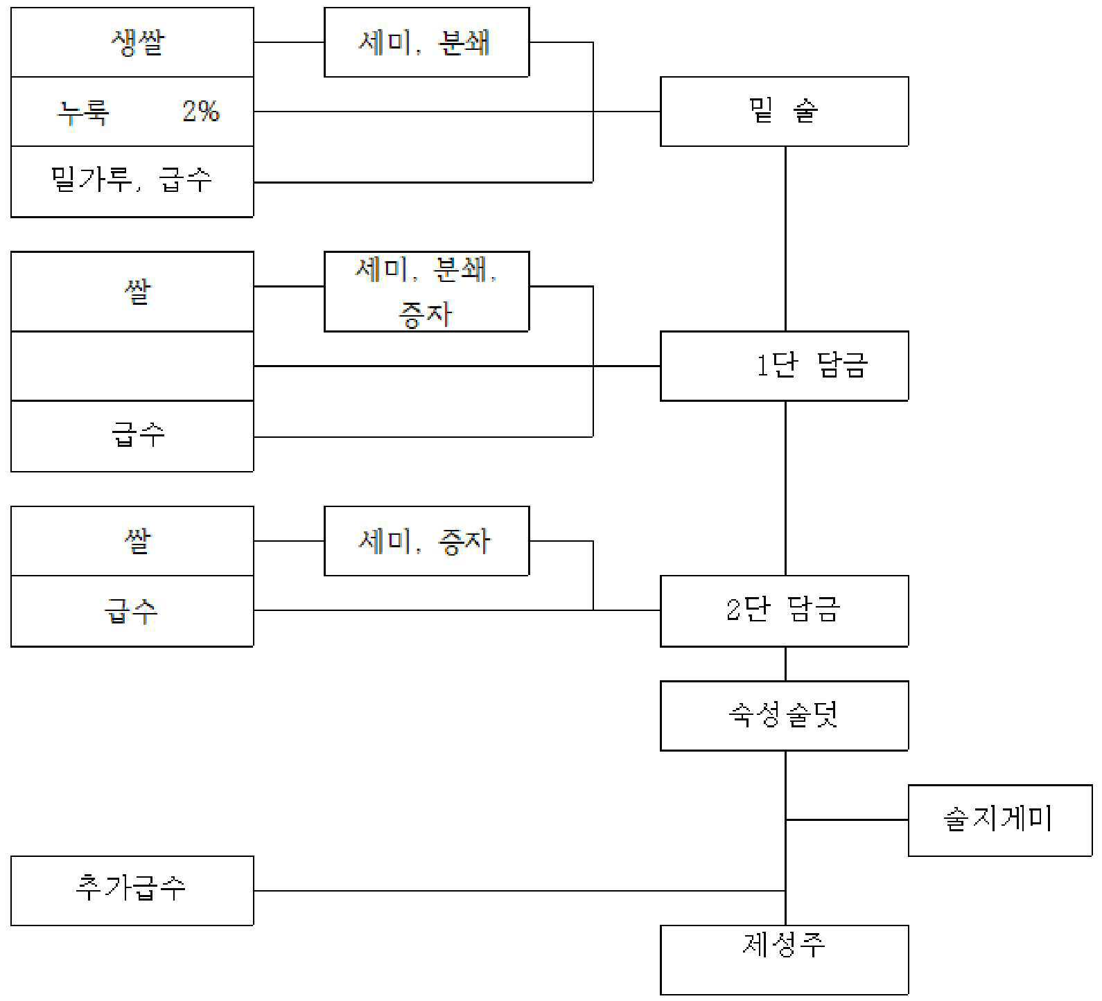 특허 정보가 공개되어 있어 그 내용은 검색하면 금방 찾을 수 있는데, 아래와 같이 생쌀, 물, 밀가루와 함께 누룩은 "2% 이내"만 써서 밑술을 빚는 삼양주라 설명하고 있다. 그 외 내용까지 자세하게 읽어보진 않았다.