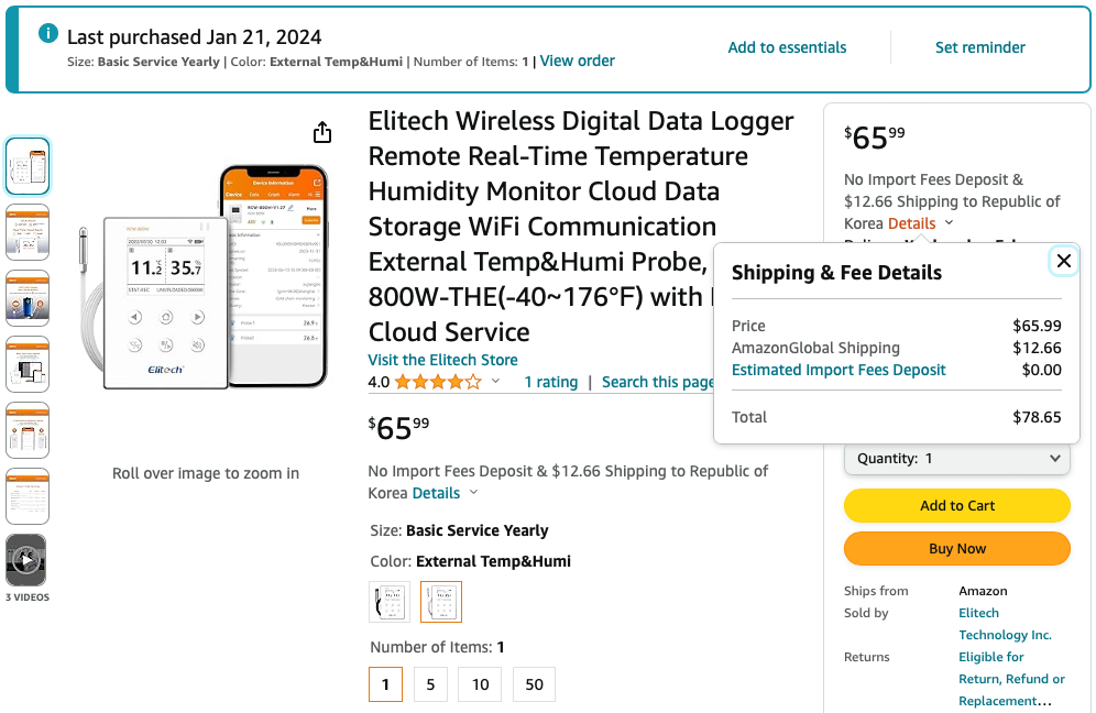 2번째 품온 기록계가 썩 맘에 들지는 않아서 3번째 품온 기록계로 또 다른 제품을 구매했다. 배송료 포함 $72.92을 결제했다. 구매한 곳: https://www.amazon.com/gp/product/B0BLC4XRPZ Elitech Wireless Digital Data Log