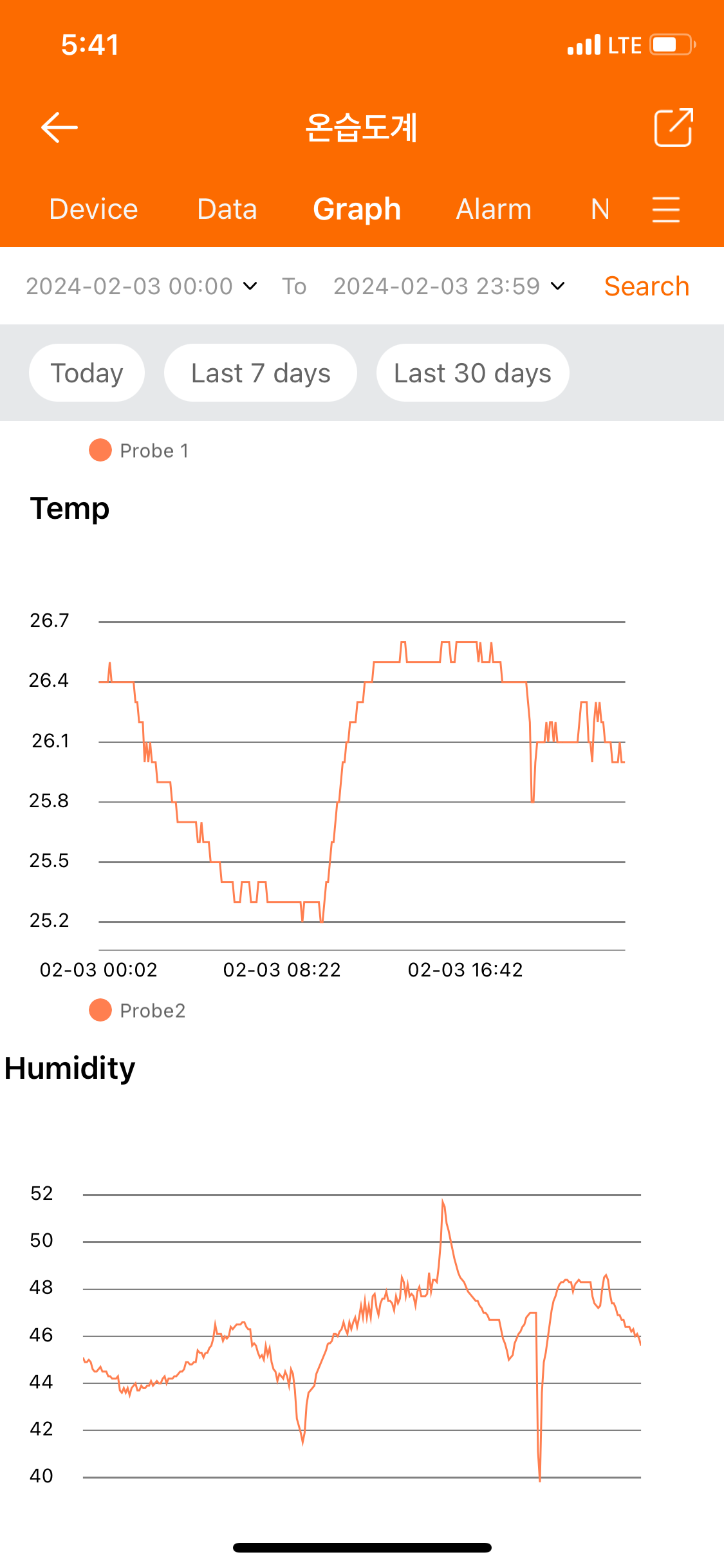 2월 3일 하루 동안 기록된 온도와 습도 그래프를 앱에서 확인한 모습