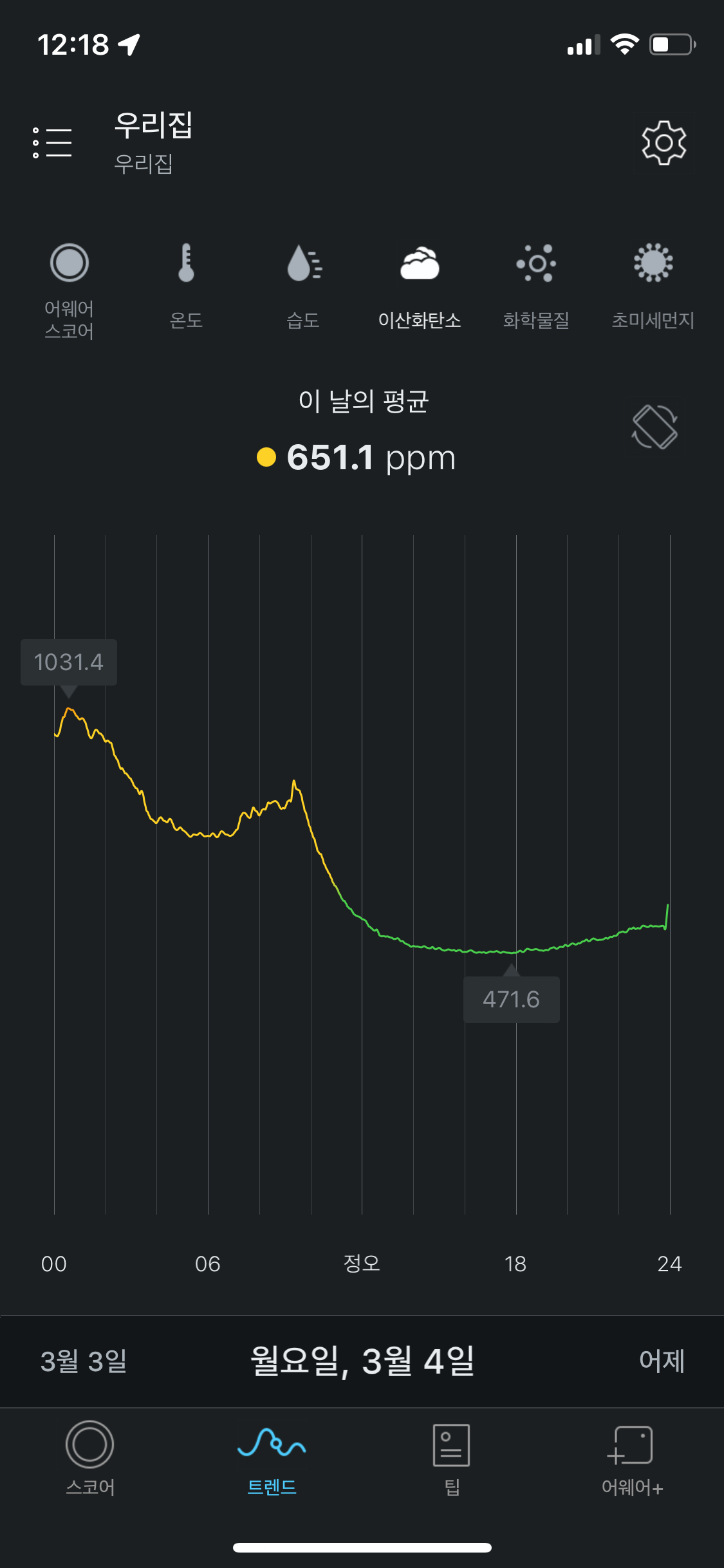 오른쪽 그래프는 어제의 실내 이산화탄소 농도 추이인데, 내가 출근 후 이산화탄소 농도가 점점 내려가서 낮게 유지하다가 내가 귀가 후 다시 증가하기 시작했다.