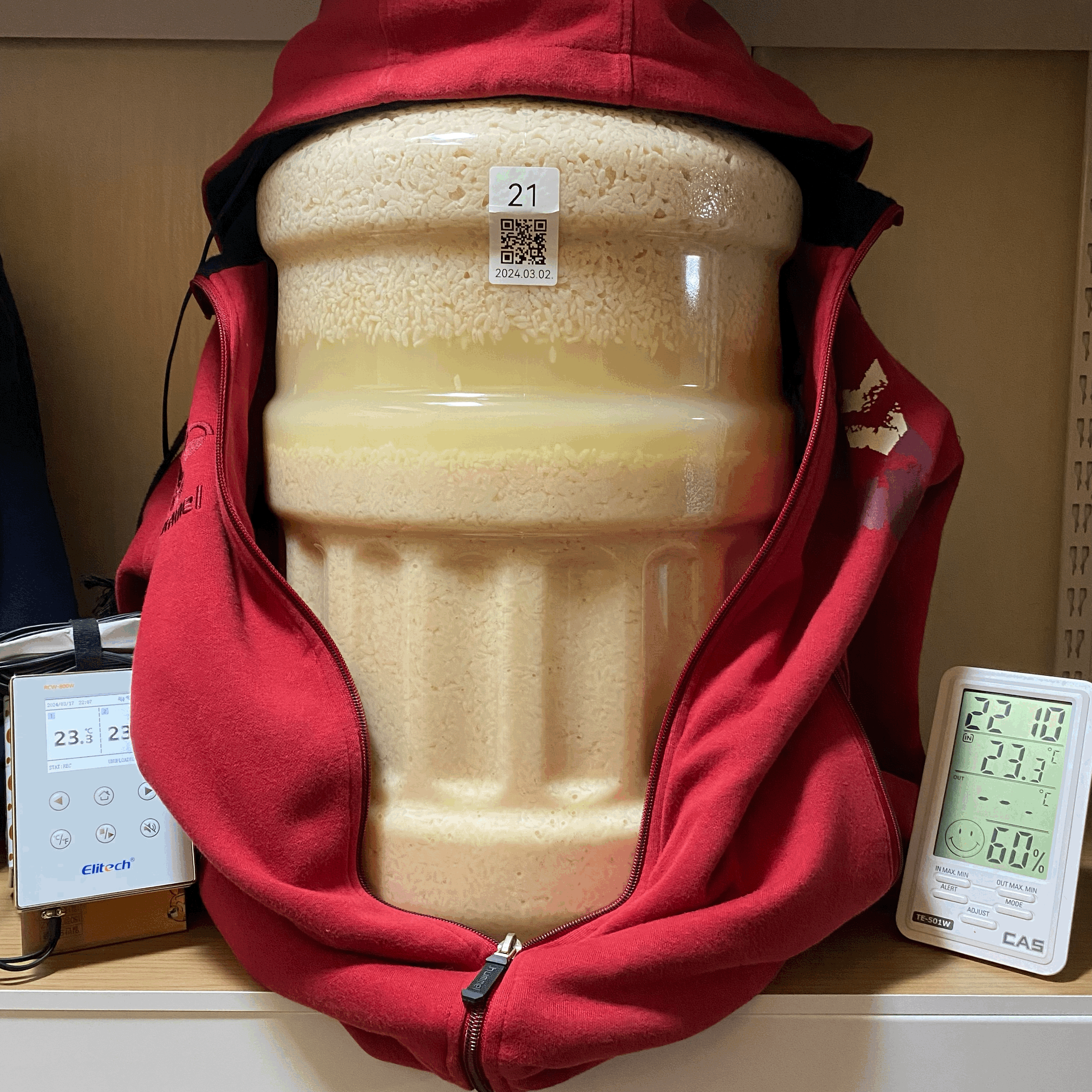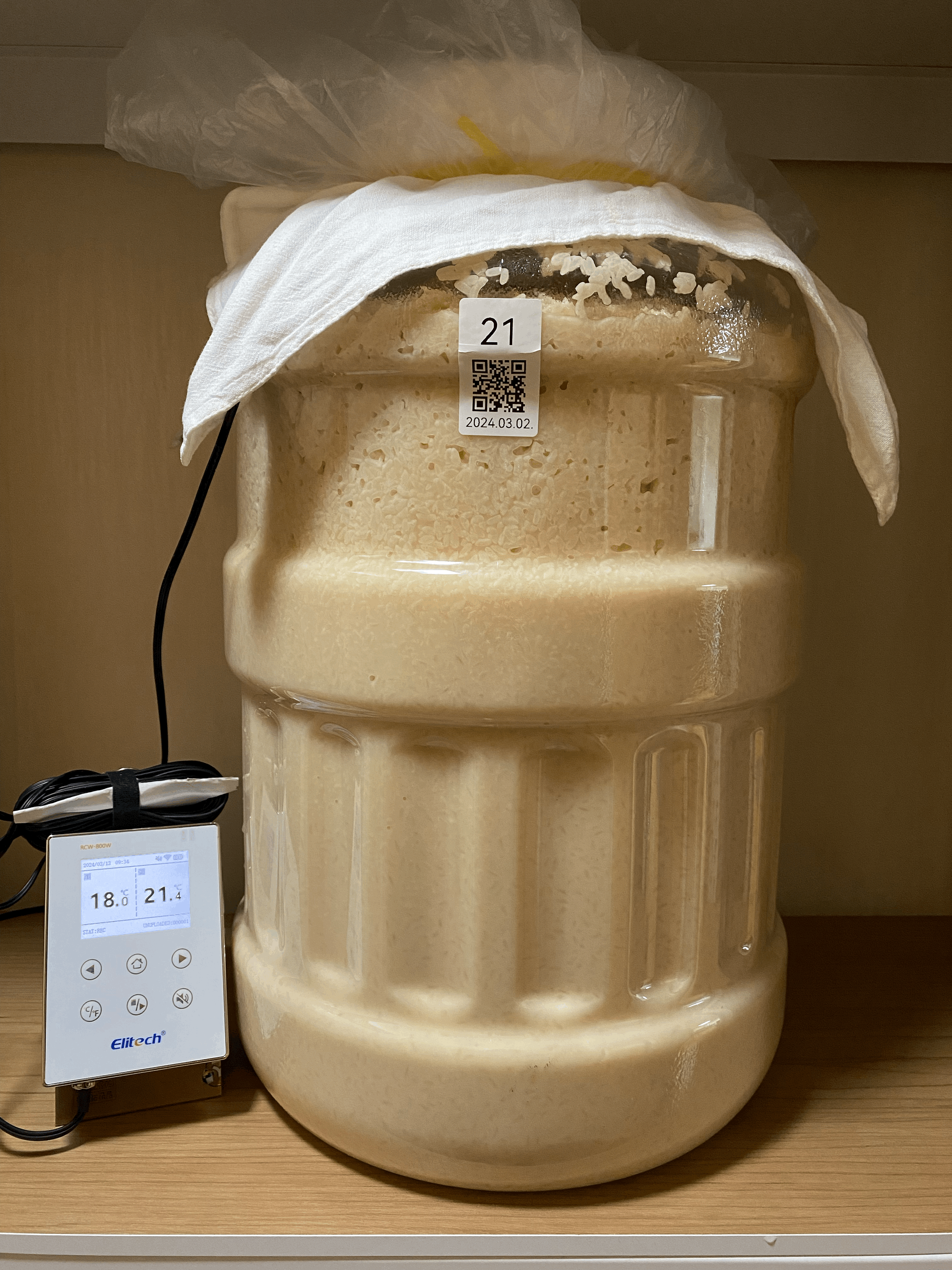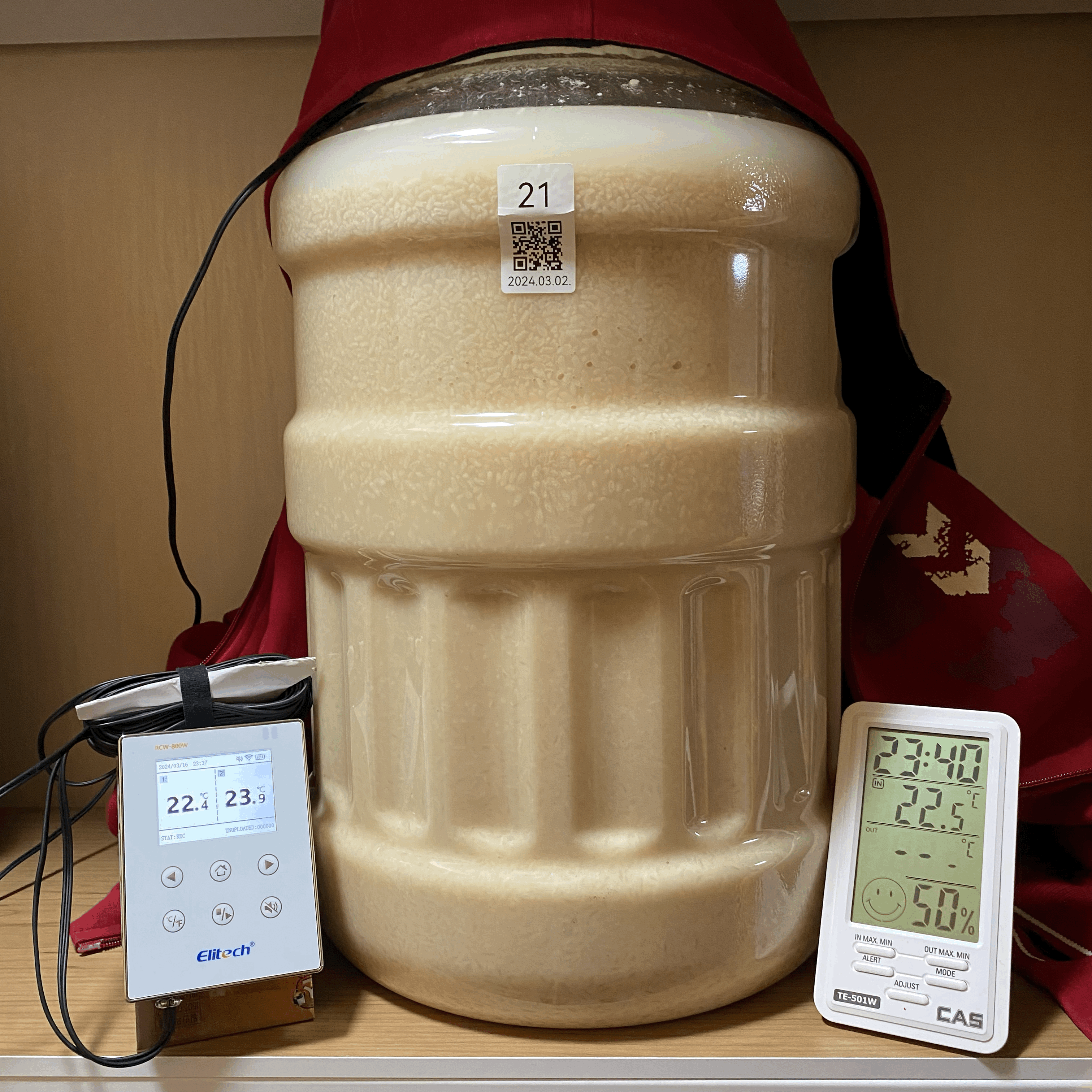 → 계획과 달리 18℃로 냉각시켰기 때문에 보쌈하지 않은 채 그냥 실온에서 후발효시킴. (품온 센서도 그대로 유지) - 술독의 품온이 실온 수준으로 올라오면 이젠 술독을 보냉백에서 꺼내 현관 앞의 술독 선반에 옮겨두고 후발효를 이어나간다.