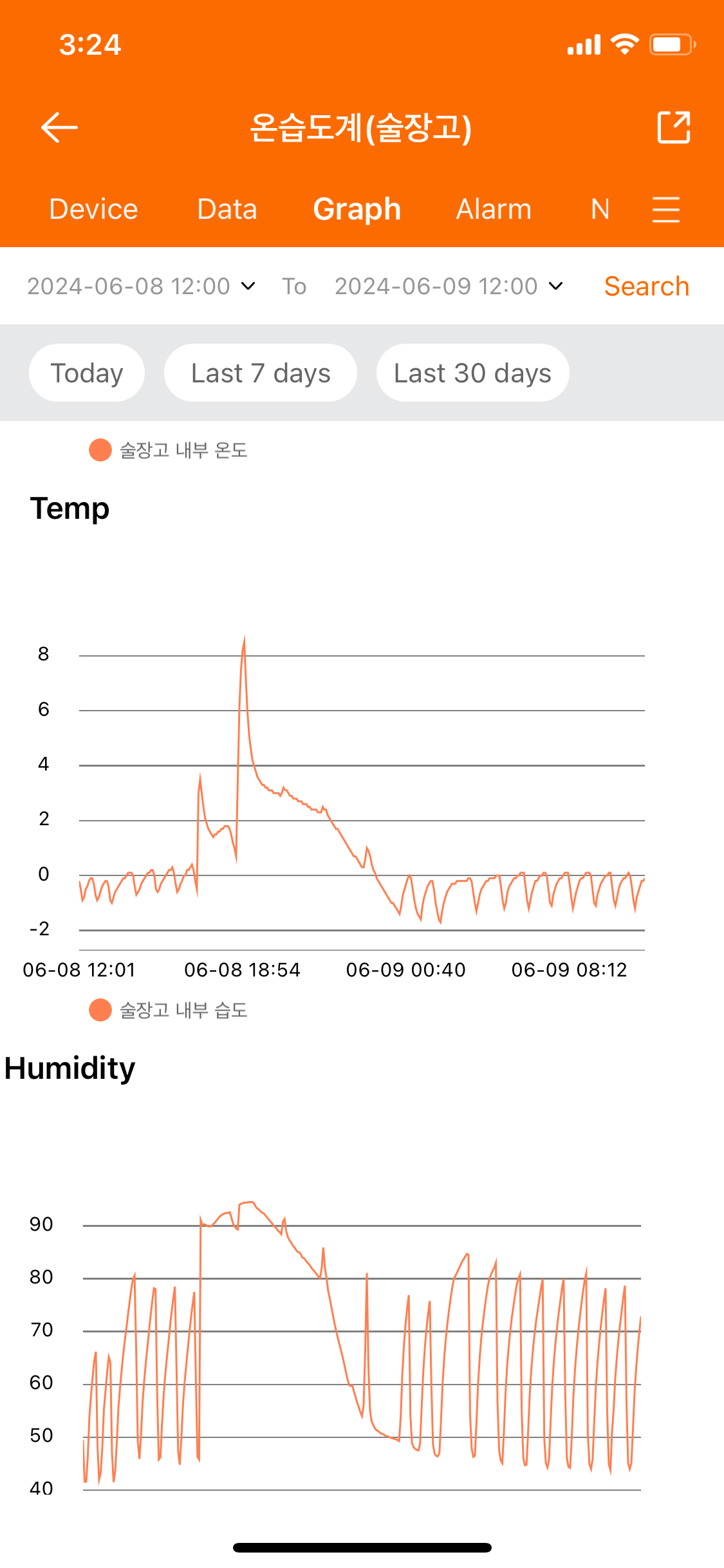 이렇게 술장고 온도를 급격하게 낮추거나 실내 온도가 30℃ 넘게 올랐을 때도 술장고 내부 온도를 0℃ 내외로 유지하기 위해서는 술장고의 온도를 -10℃ 이하로도 설정가능해야 한다는게 내가 술장고를 구매할 때 고려한 필수 기능이었다. - 아래 그림은 6/8 12시부터 6/9 12시까지 24시간 동안의 술장고 내부 온도와 습도 변화 그래프다.