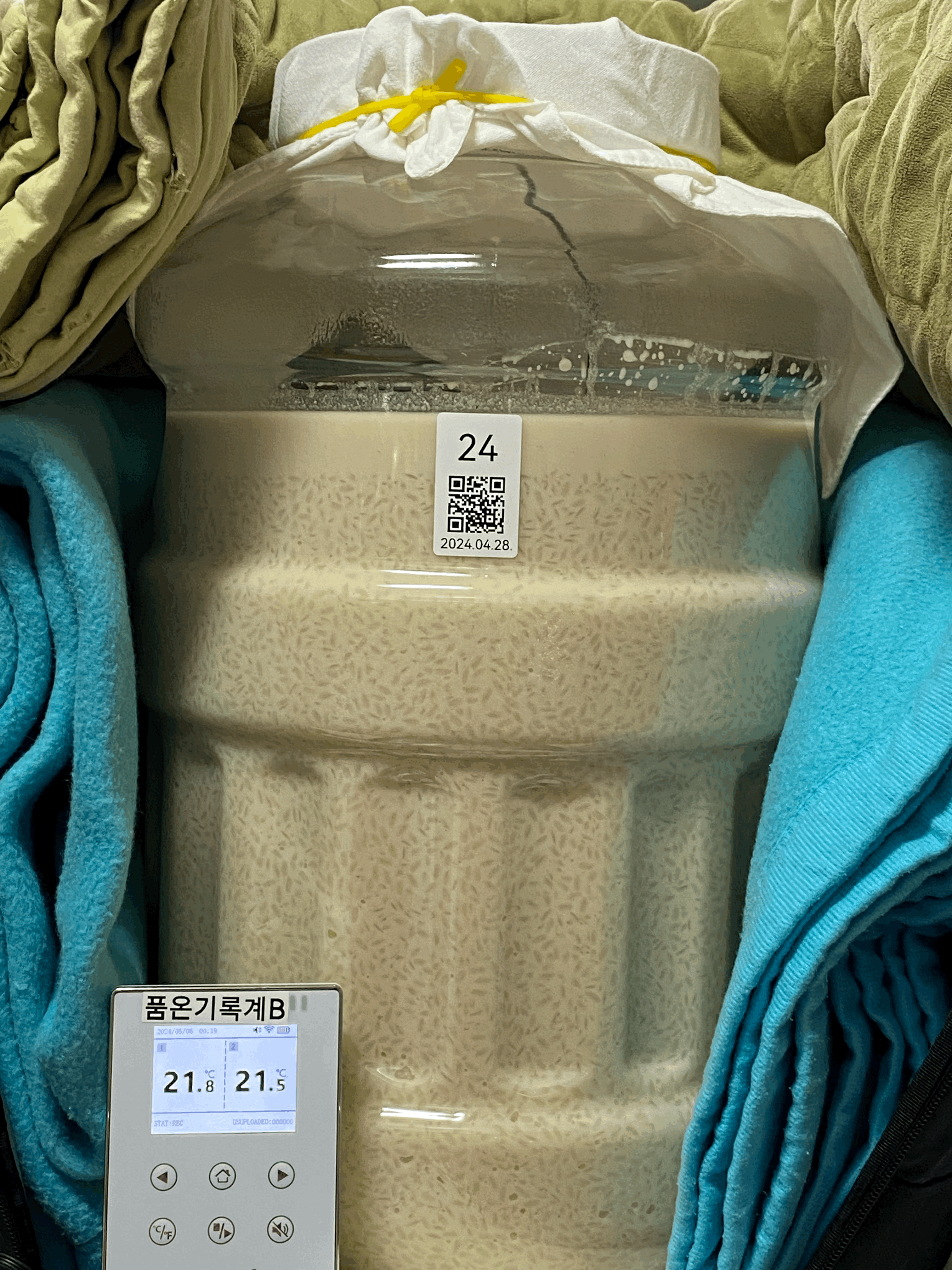 - [+1시간, 21:50] 고두밥 찌기 종료. 고두밥 꺼내서 식히기 시작. 고두밥 속에 품온 기록계 설치함.