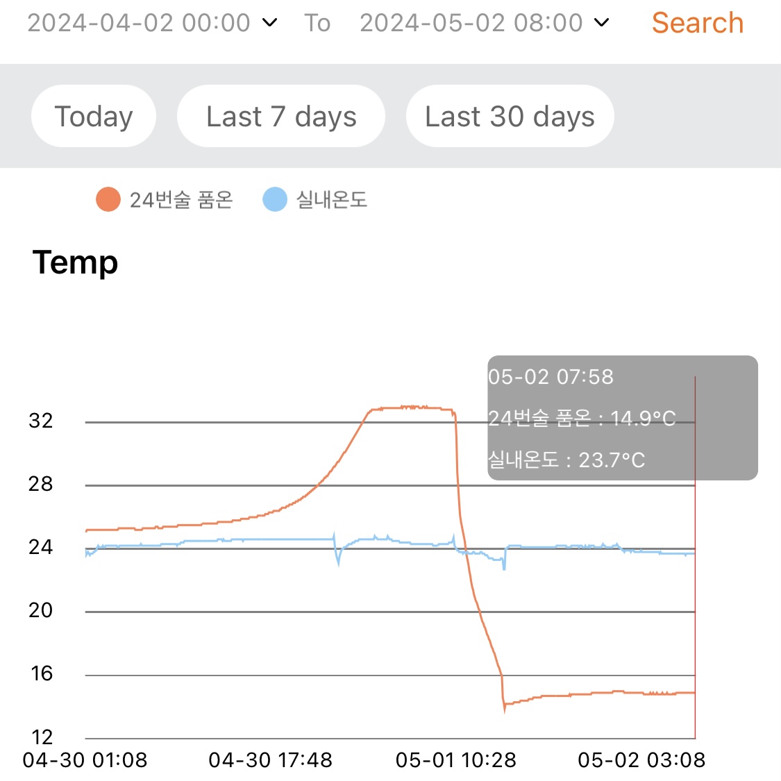 - 품온 32.8℃. (품온기록계의 왼쪽은 품온, 오른쪽은 실내온도)